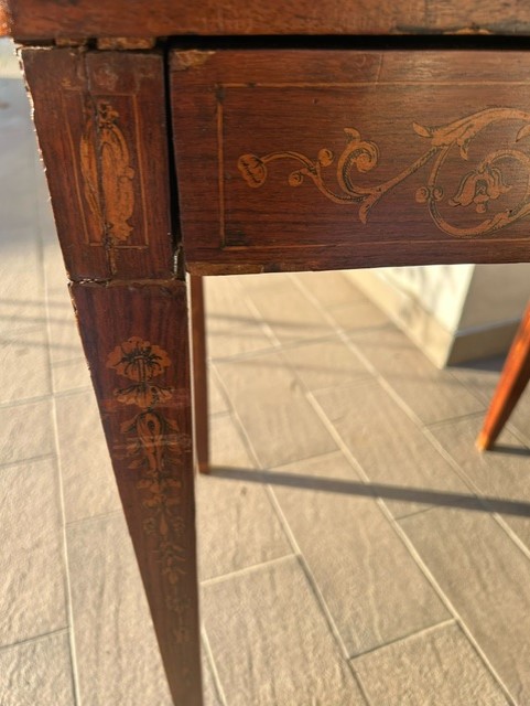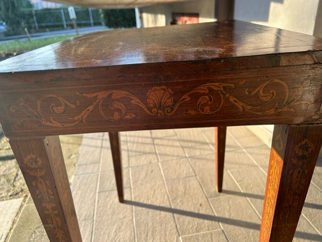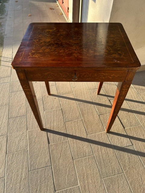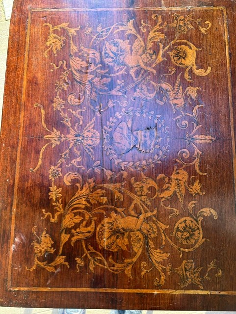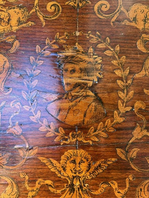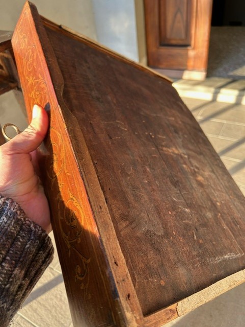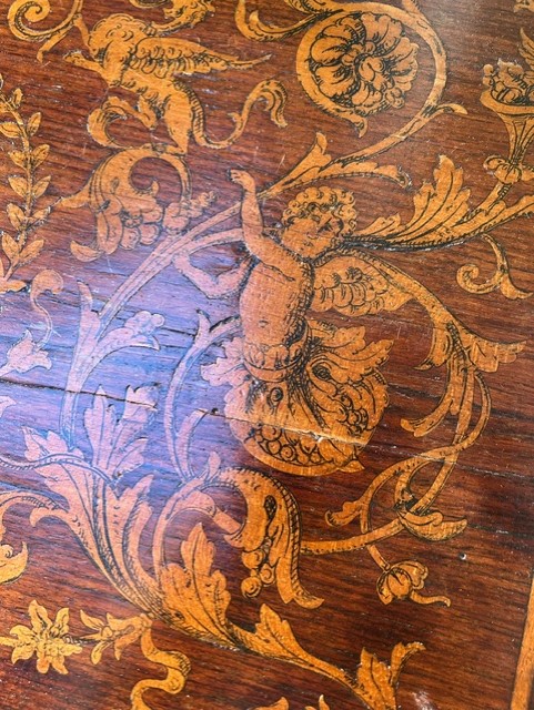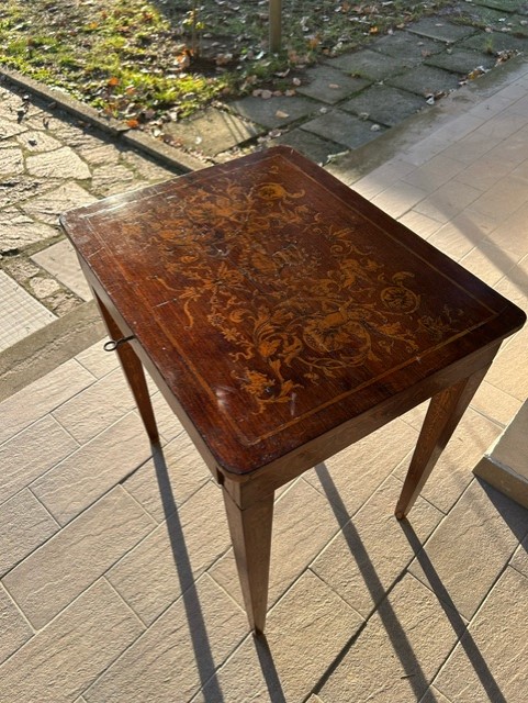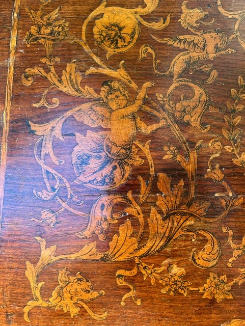 Toscano 1780 intarziato con grottesche al centro la figura di Dante Alighieri decorato in tutte le superficie misure 66 x 57,5x 45,5 cm