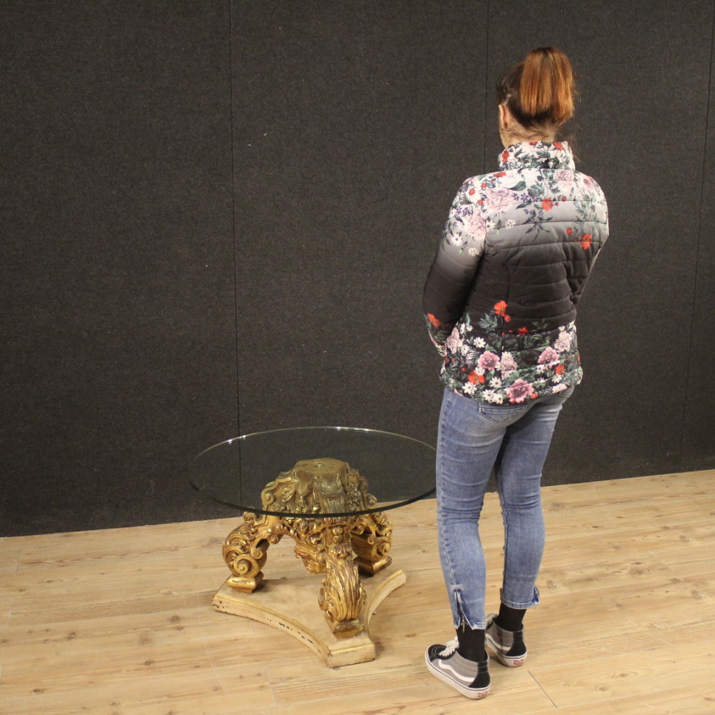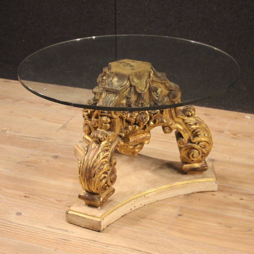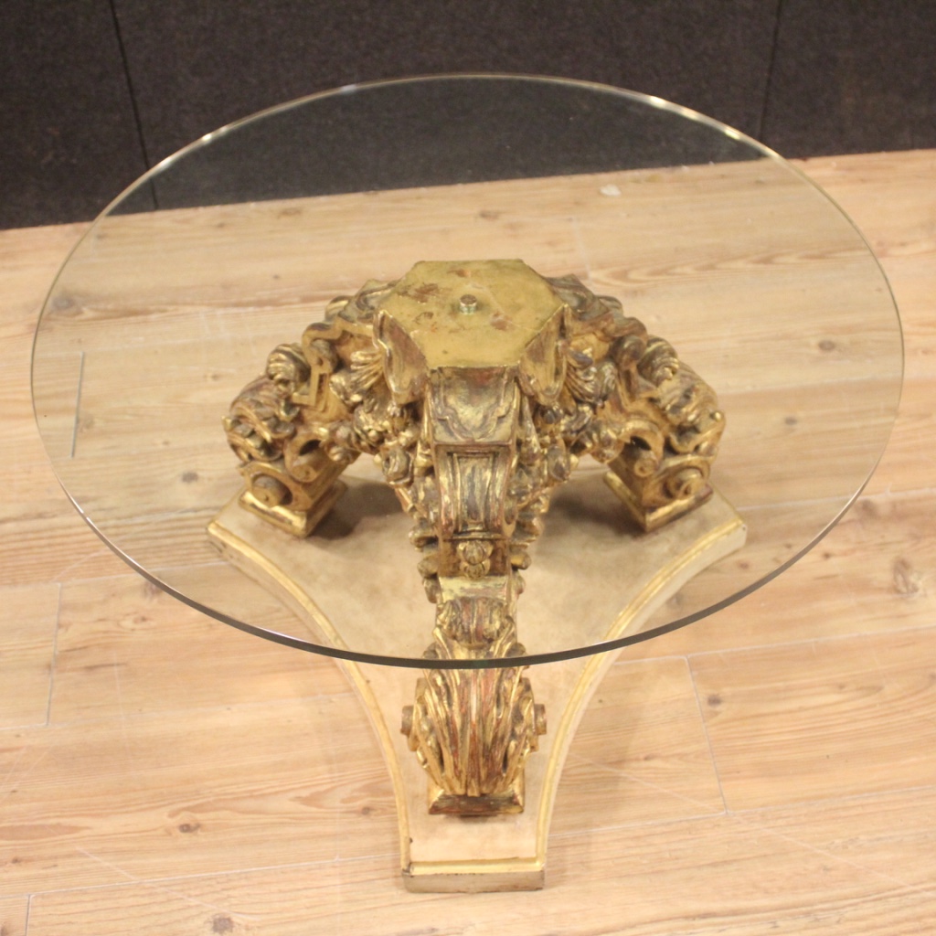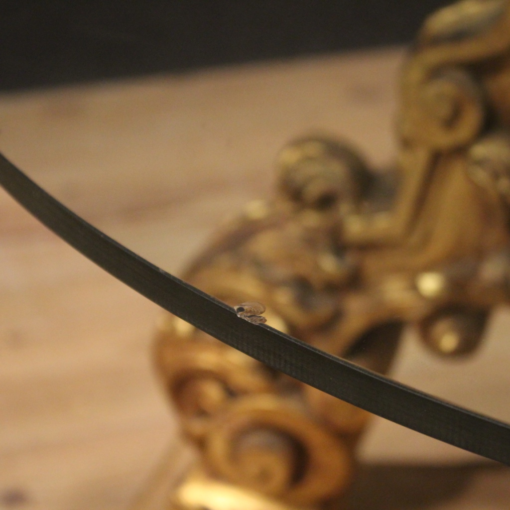 Tavolino rotondo da salotto italiano del XX secolo. Mobile composto da due elementi distinti, basamento ligneo laccato e dorato in stile antico e piano moderno in cristallo, di piacevole arredamento. Solida base che si fissa al piano con un perno in metallo centrale (vedi foto). Piano in cristallo che presenta una piccola sbeccatura sul bordo esterno (vedi foto) e qualche piccolo graffio/segno di usura sul piano di appoggio. Mobile di particolare decorazione, facilmente inseribile in diversi tipologie di case, sia moderne che con arredamento antico. Di buona solidità e servizio, si presenta in discreto stato conservativo.