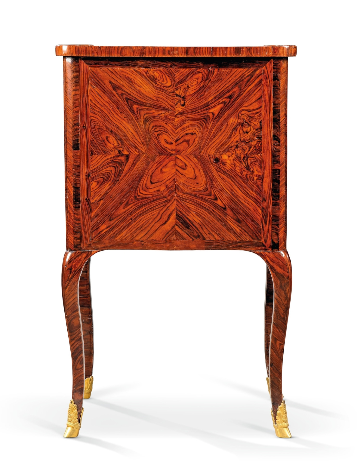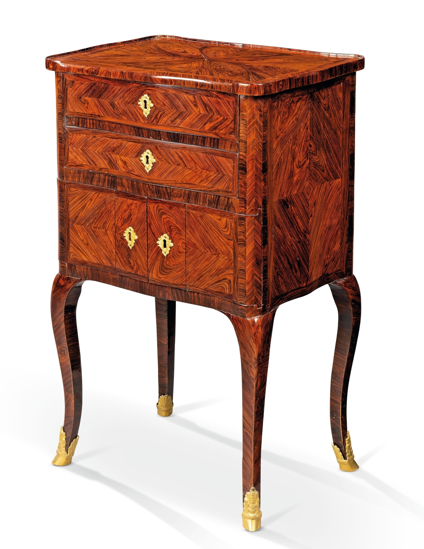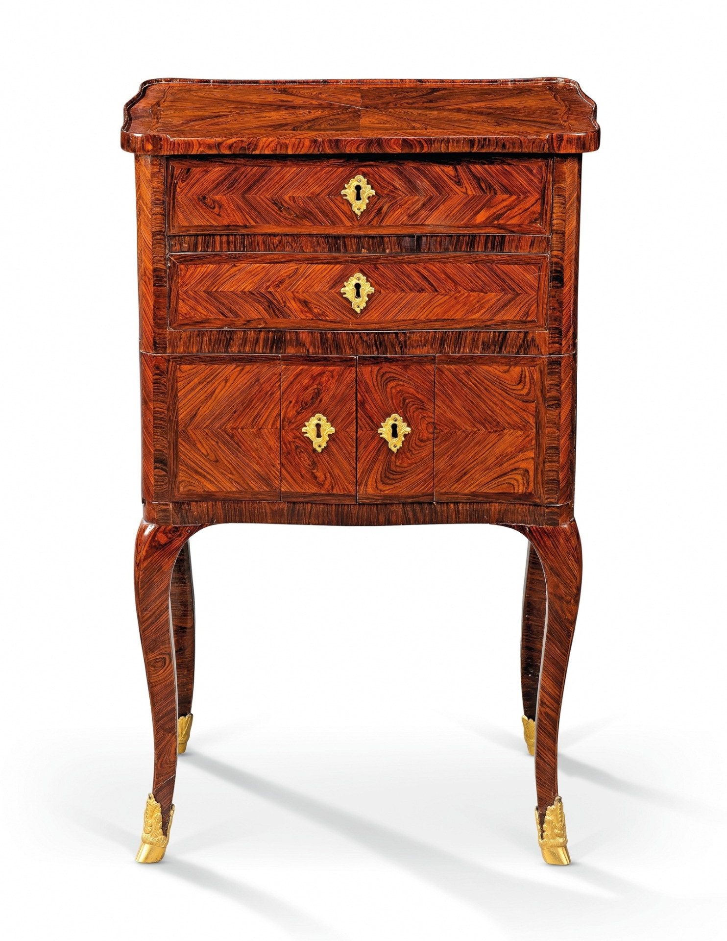 Questo elegante e raffinato mobiletto da centro è stato realizzato a Torino intorno alla metà del XVIII secolo. Caratteristica della alta ebanisteria piemontese, per questo mobile è stato scelto un impiallaccio con il pregiato legno di Viola, applicato sul mobile con un sofisticato gioco di specchiature e disegni delle venature del legno. Il mobile presenta un piano sagomato e mosso, e l'essenza lignea crea un gioco cromatico detto “a occhio di pernice”. Sul fronte si compone di due cassetti e un vano protetto da due antine. Il sistema di apertura delle ante è a scorrimento, molto raro e di difficile realizzazione. Le bocchette delle serrature sono in bronzo cesellato e dorato, così come i puntali delle quattro gambe che risultano arcuate e leggiadre, tipiche del barocchetto.