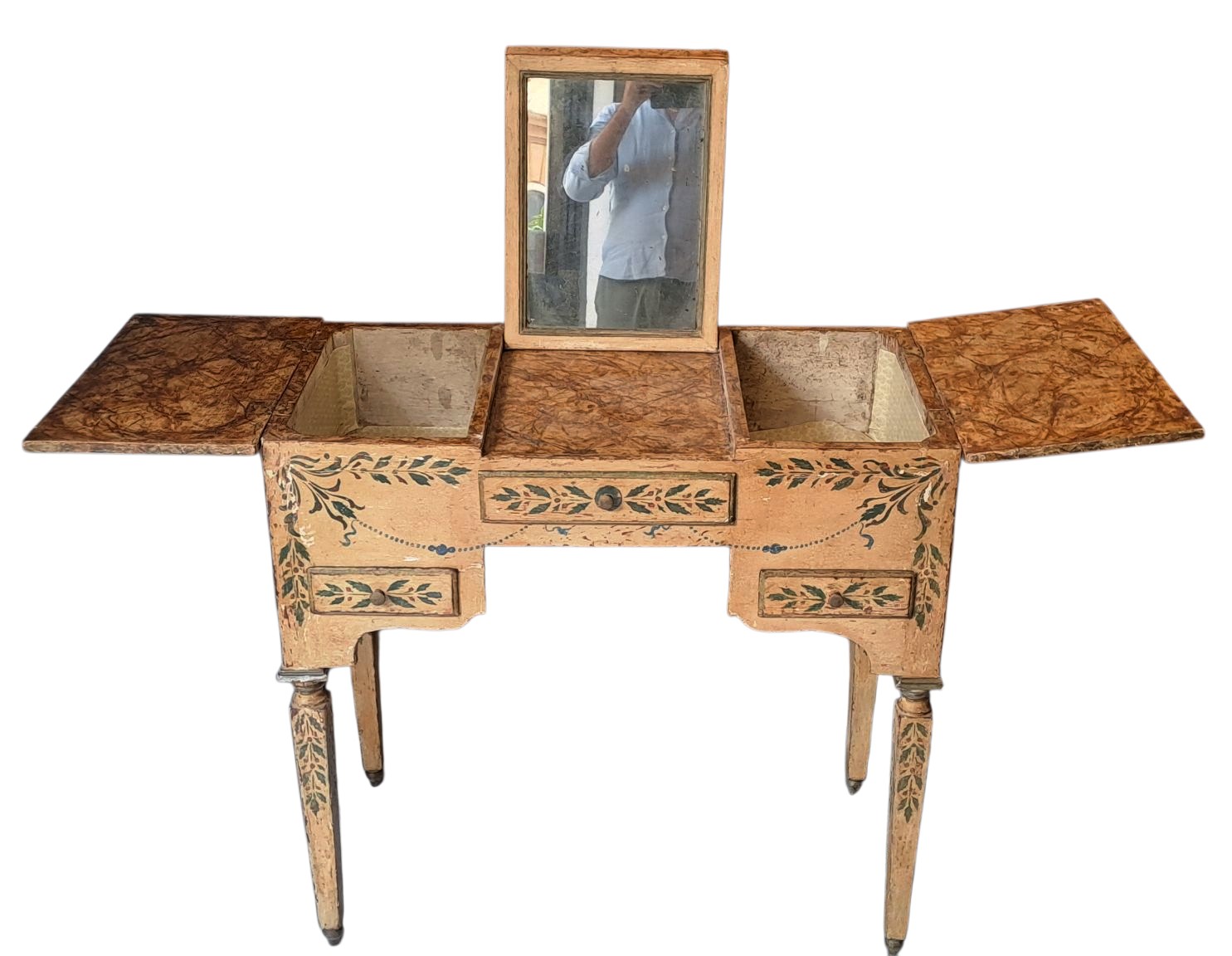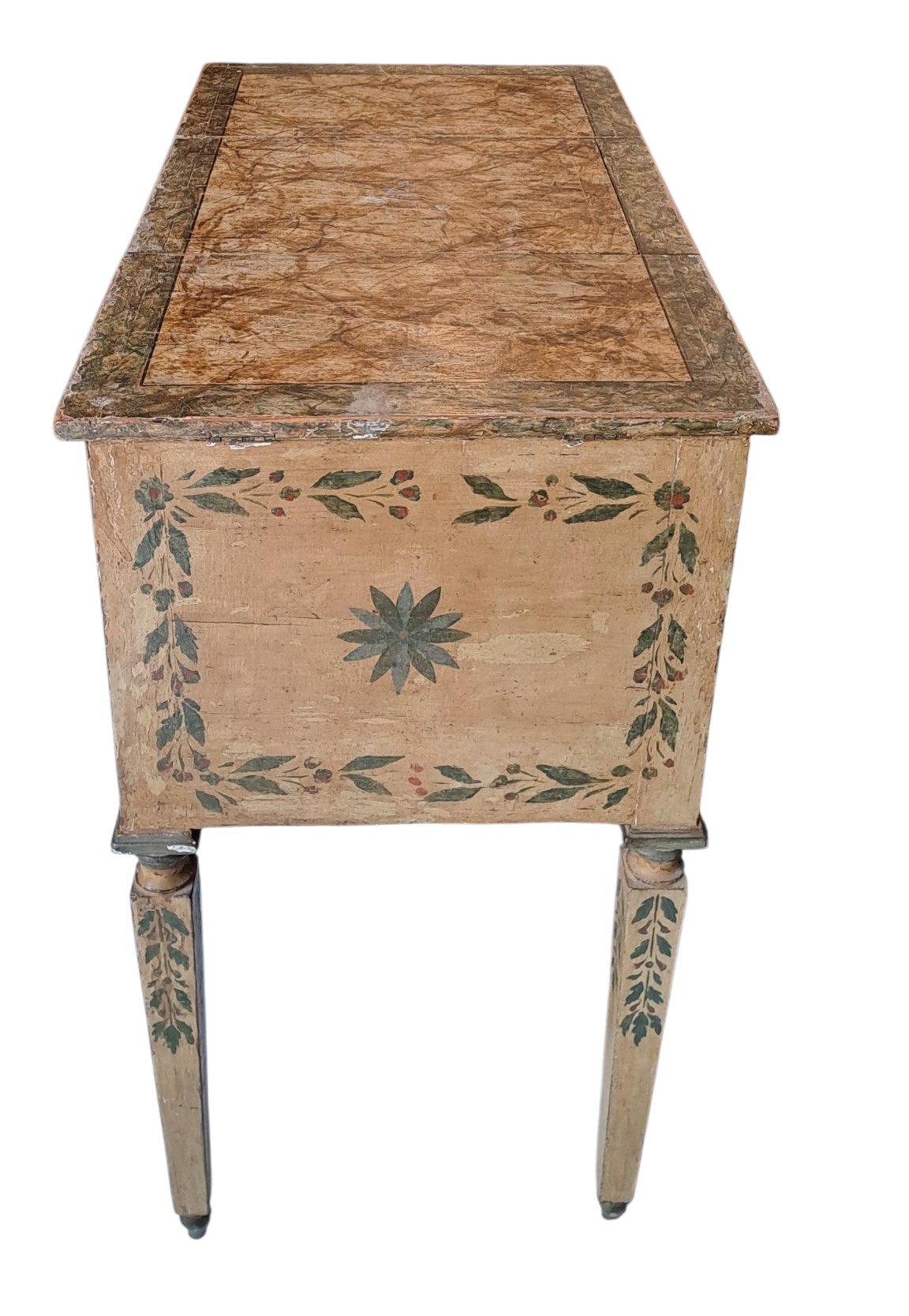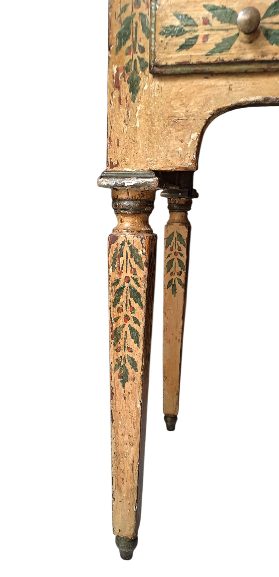 Decorazione e Laccatura: Il mobile è splendidamente laccato in una tonalità pastello un color crema con patina del tempo) e dipinto a mano con decorazioni di gusto neoclassico.