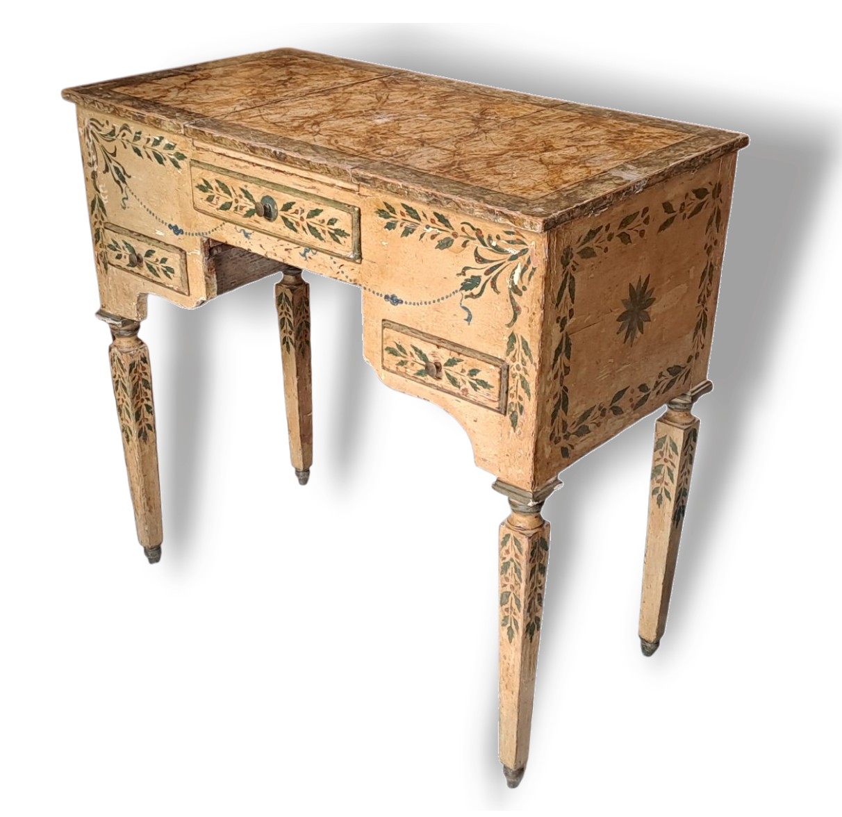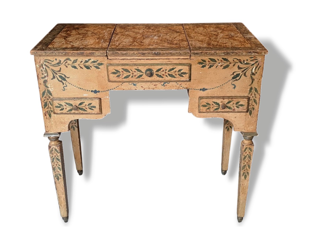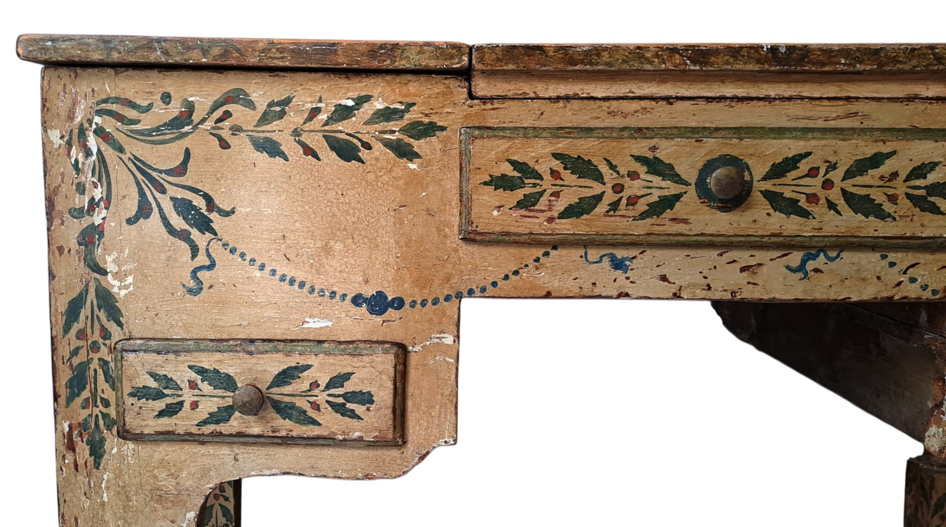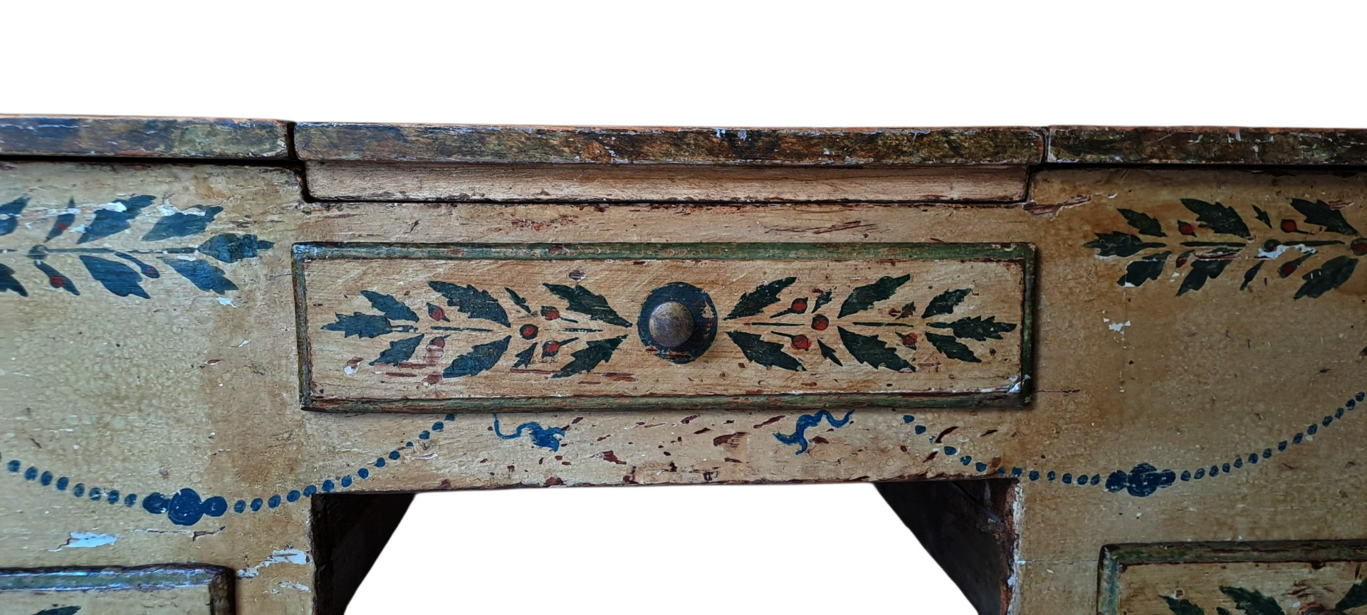 Decorazione e Laccatura: Il mobile è splendidamente laccato in una tonalità pastello un color crema con patina del tempo) e dipinto a mano con decorazioni di gusto neoclassico.