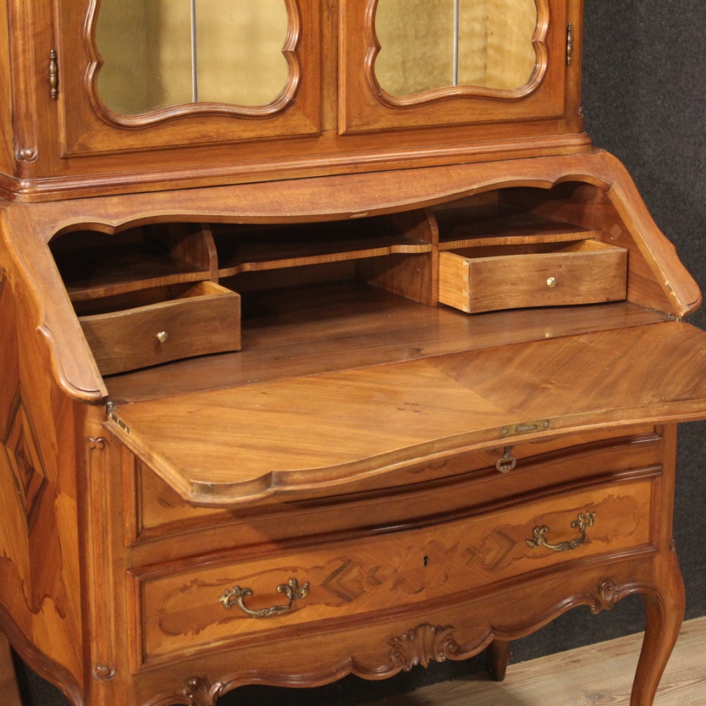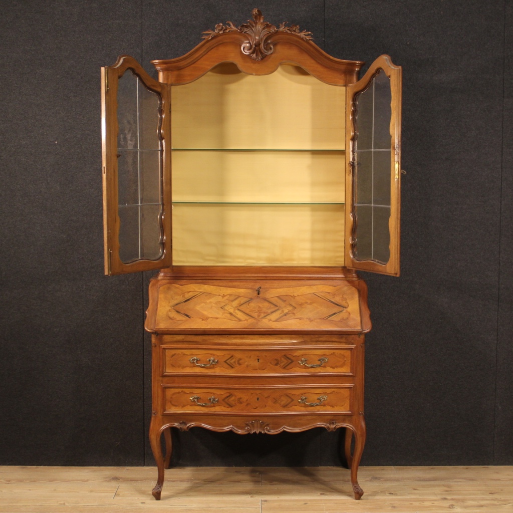 Trumeau italiano della metà del XX secolo. Vetrina doppio corpo scolpita e impiallacciata in legni di noce, mogano, palissandro e faggio di bella linea e piacevole arredamento. Corpo inferiore munito di due capienti cassetti e ribalta. Interno della ribalta completo due cassettini, quattro vani porta documenti e piano scrittoio di buona misura e servizio. Trumeau adornato da cimasa piacevolmente scolpita, pennacchio centrale con piccolo restauro (vedi foto), due ante con vetri incassati che offrono al loro interno due piani in vetro piu piano a basamento (vedi foto). Corpo superiore rivestito internamente in tessuto con alcuni segni di usura (vedi foto) da togliere o sostituire. Mobile a gamba alta strutturalmente sano, completo di due chiavi funzionanti (vetrina e ribalta). Trumeau ideale da inserire in un salotto o studio, di bella decorazione. In buone condizioni con qualche segno di usura.