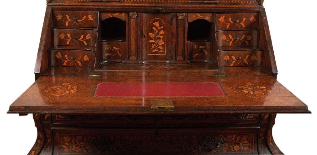 Splendido trumeau in radica di noce riccamente intarsiato con motivi floreali tipici della manifattura olandese. Oltre 10 i legni policromi presenti nell'intarsio. Il corpo inferiore è suddiviso in 4 cassetti, con fronte mosso e poggiante su piedi posteriori a plinto e anteriori a ricciolo, in voga sino al 1770 circa: si tratta di una tipologia più ricercata rispetto alla più comune foggia a vaso o a pera rovesciata. Il corpo superiore presenta due ante chiuse sagomate e intarsiate anche all'interno, sul massello di rovere. Serrature e ferramenta originali. All'interno della calatoia, lo scarabattolo è suddiviso in cassettini e vani a giorno, oltre al piano scorrevole. Completano il mobile due asticelle poggiacandelabri.