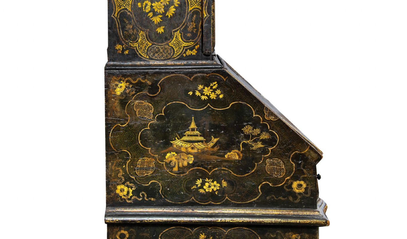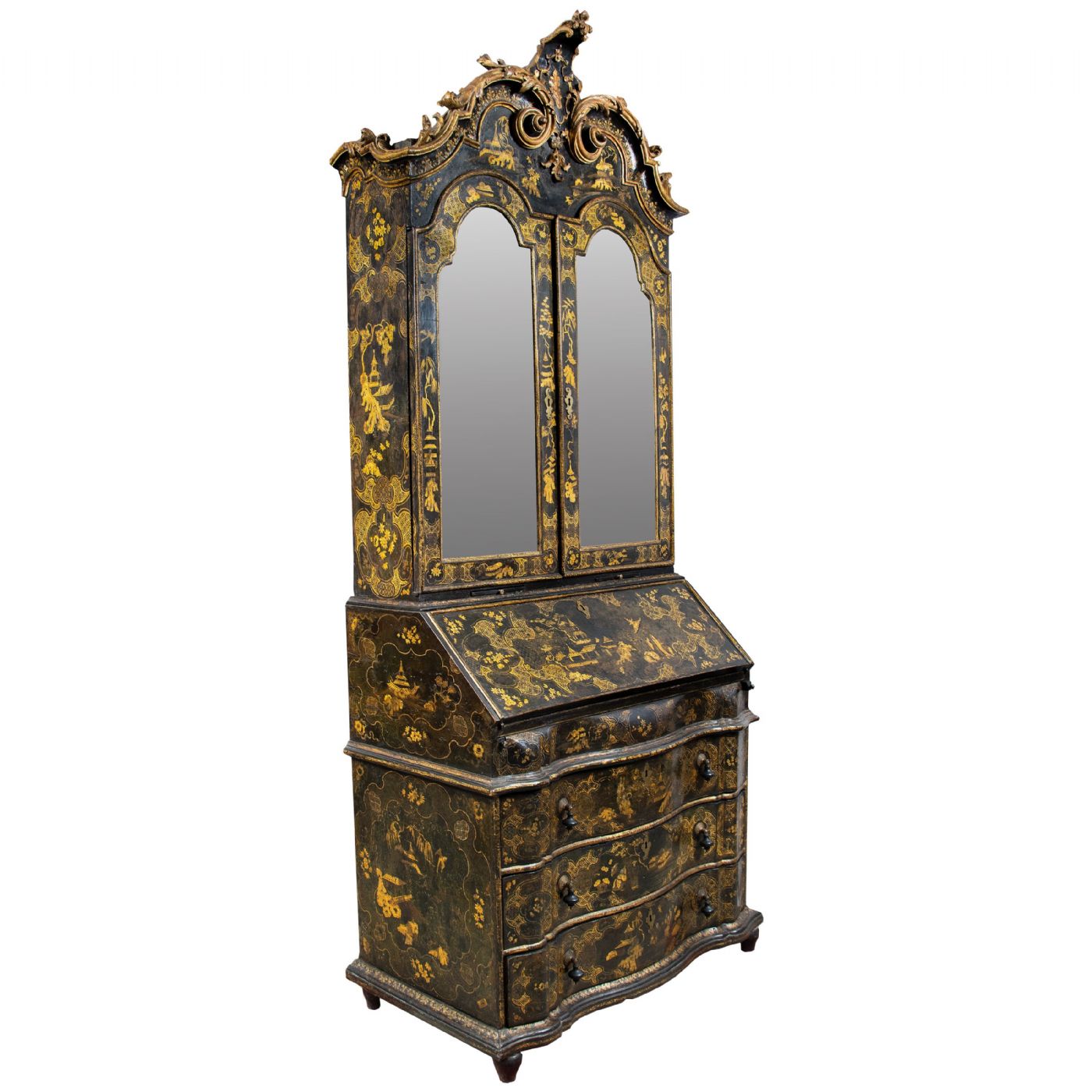 Trumeau a due corpi in legno laccato, dorato e dipinto. Venezia, prima metà XVIII secolo. 105 x 54 cm x h 245 cm. Realizzato interamente in legno finemente laccato e dorato a motivi “a Chinoiseries”. Fronte mosso e cimasa elegantemente intagliata. Interni realizzati in legno laccato e dipinto a simulazione della tartaruga. Introdotto nel Settecento veneziano, il trumeau, mobile a due corpi, rappresenta un'epoca di sofisticata eleganza e raffinatezza. Caratterizzato da linee sinuose e decorazioni sontuose, questi mobili incarnano il connubio tra la maestria degli ebanisti veneziani e le influenze orientali, in particolare la moda della cineseria. Le decorazioni a Chinoiseries, ispirate al design cinese e giapponese, hanno rivoluzionato il mercato dell’arredo dell'epoca, conferendo un'aura di esotismo e fascino agli arredi dei palazzi veneziani del Settecento. Questi mobili non solo erano funzionali, ma anche opere d'arte che riflettevano lo spirito cosmopolita e la ricerca di nuove estetiche dell'epoca. Il mobile in questione è un trumeau a due corpi realizzato a Venezia intorno agli anni ’40-’50 del Settecento, particolarmente pregiato per la sua eccezionale laccatura a fondo nero con decorazioni in foglia d’oro con i tipici motivi a Chinoiseries. La parte inferiore è costituita da un fronte a tre cassetti sagomati e una calatoia a ribalta celante una serie di cassettini e vani segreti. La parte superiore a due ante specchiate si apre ad una serie di vani e ripiani ad uso di porta porcellane e documenti. Il tocco finale viene dato dalla stupenda cimasa, anch’essa decorata nello stile del mobile, ma impreziosita da un intaglio raffinatissimo che fa a gara con le migliori specchiere dorate dell’epoca. Un ulteriore tocco di esotismo è dato dagli interni del mobile, interamente laccati e dipinti a simulazione della tartaruga, particolare estremamente raro ed inusuale. - Tutte le spedizioni in UE sono gratuite ed imballate professionalmente. - Ogni articolo viene venduto con certificato di autenticità con validità legale. - Ulteriori approfondimenti sul condition report sono disponibili su richiesta. - Viezzi Arte garantisce qualità e professionalità a prezzi competitivi, contattaci su info@viezziarte.it o via What’sApp al +39 3402841279. *Messaggio rivolto agli acquirenti non italiani: Tieni presente che quest'opera non ha ancora ottenuto il certificato di libera esportazione dall'Italia presso la Soprintendenza dei Beni Culturali. Questo documento attesta che l'opera non fa parte del patrimonio culturale italiano. Normalmente i tempi di rilascio degli attestati sono 40 giorni dalla data di appuntamento: La nuova normativa in vigore dal 2021 prevede, per importi dichiarati inferiori a 13.500€, tempi più brevi a discrezione della commissione di esperti. Tutti i costi di questa operazione sono inclusi.
