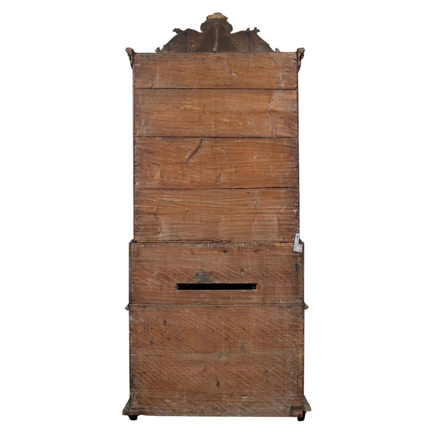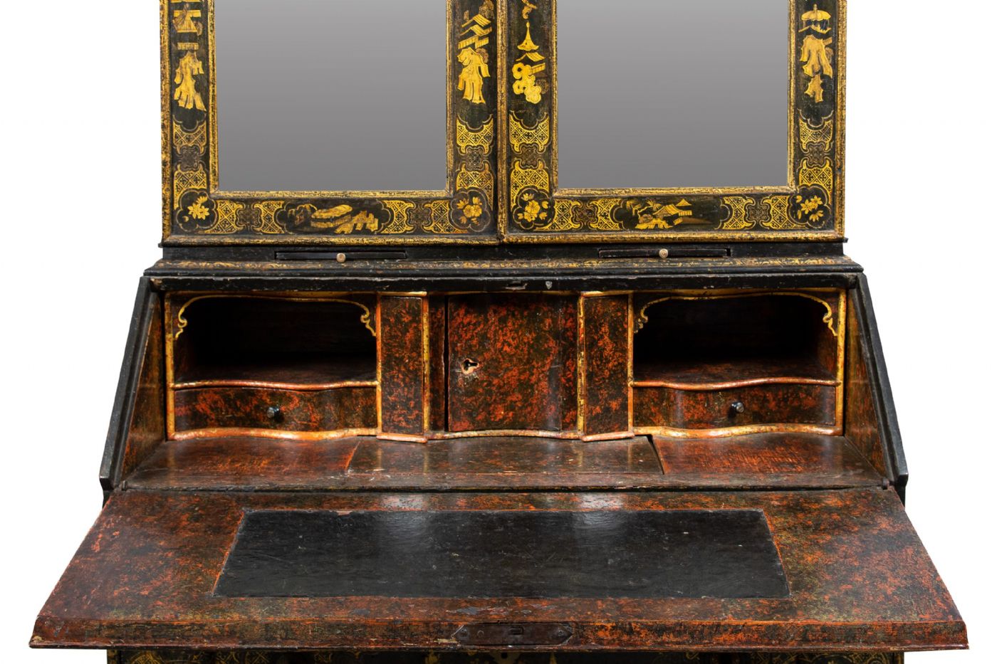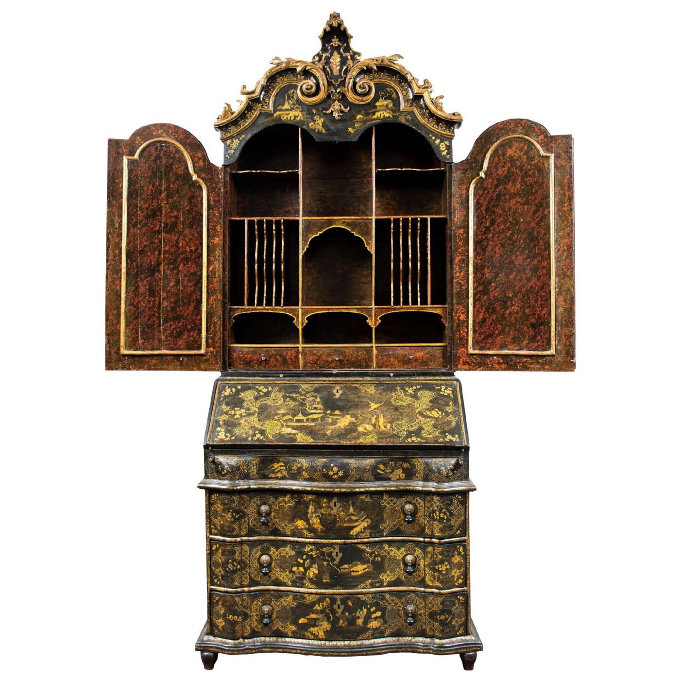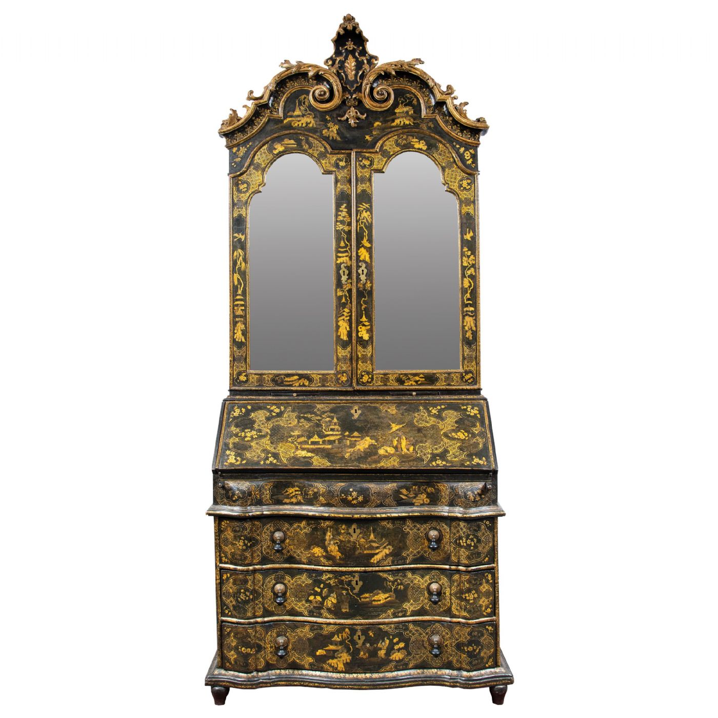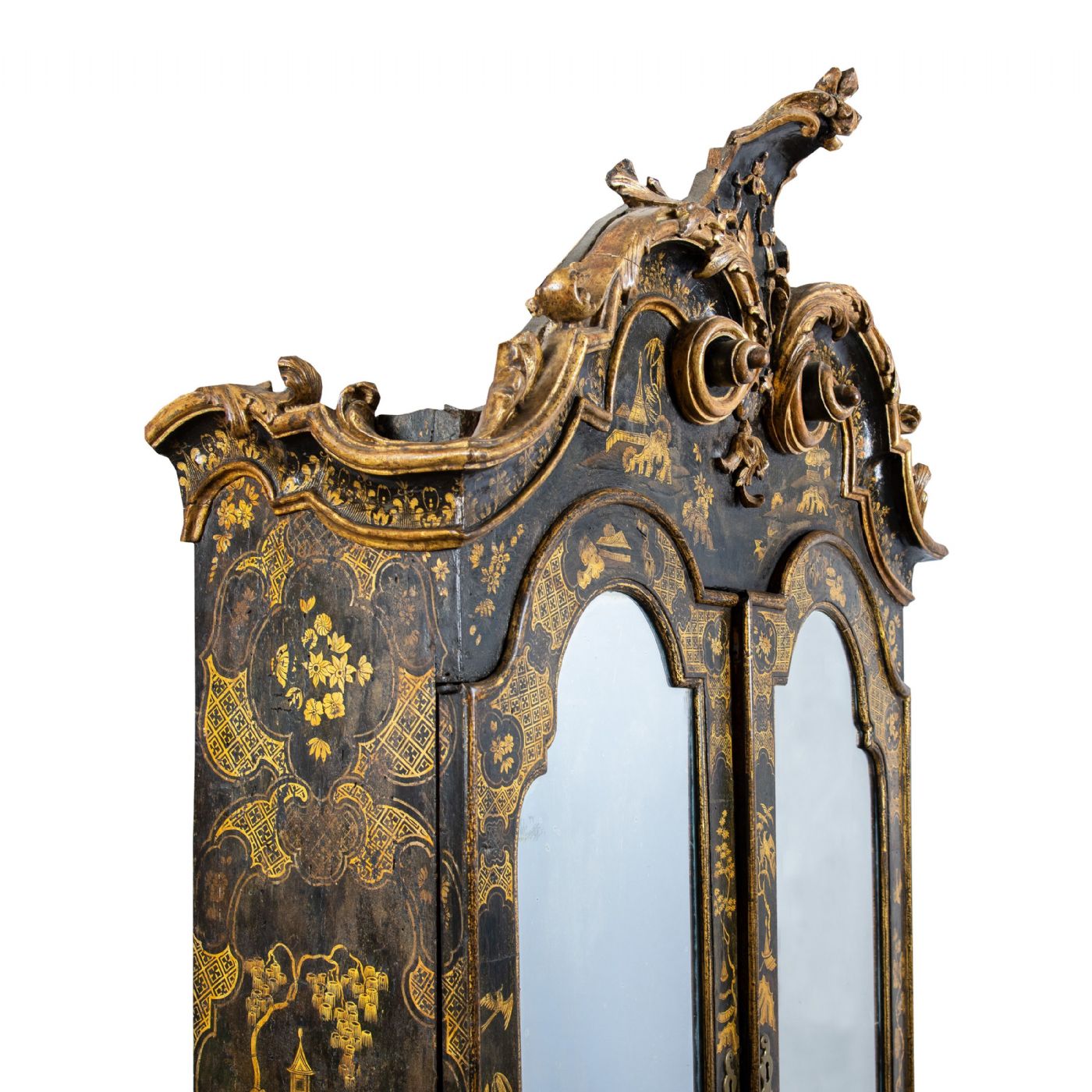 Introdotto nel Settecento veneziano, il trumeau, mobile a due corpi, rappresenta un'epoca di sofisticata eleganza e raffinatezza. Caratterizzato da linee sinuose e decorazioni sontuose, questi mobili incarnano il connubio tra la maestria degli ebanisti veneziani e le influenze orientali, in particolare la moda della cineseria. Le decorazioni a Chinoiseries, ispirate al design cinese e giapponese, hanno rivoluzionato il mercato dell’arredo dell'epoca, conferendo un'aura di esotismo e fascino agli arredi dei palazzi veneziani del Settecento. Questi mobili non solo erano funzionali, ma anche opere d'arte che riflettevano lo spirito cosmopolita e la ricerca di nuove estetiche dell'epoca. Il mobile in questione è un trumeau a due corpi realizzato a Venezia intorno agli anni ’40-’50 del Settecento, particolarmente pregiato per la sua eccezionale laccatura a fondo nero con decorazioni in foglia d’oro con i tipici motivi a Chinoiseries. La parte inferiore è costituita da un fronte a tre cassetti sagomati e una calatoia a ribalta celante una serie di cassettini e vani segreti. La parte superiore a due ante specchiate si apre ad una serie di vani e ripiani ad uso di porta porcellane e documenti. Il tocco finale viene dato dalla stupenda cimasa, anch’essa decorata nello stile del mobile, ma impreziosita da un intaglio raffinatissimo che fa a gara con le migliori specchiere dorate dell’epoca. Un ulteriore tocco di esotismo è dato dagli interni del mobile, interamente laccati e dipinti a simulazione della tartaruga, particolare estremamente raro ed inusuale.