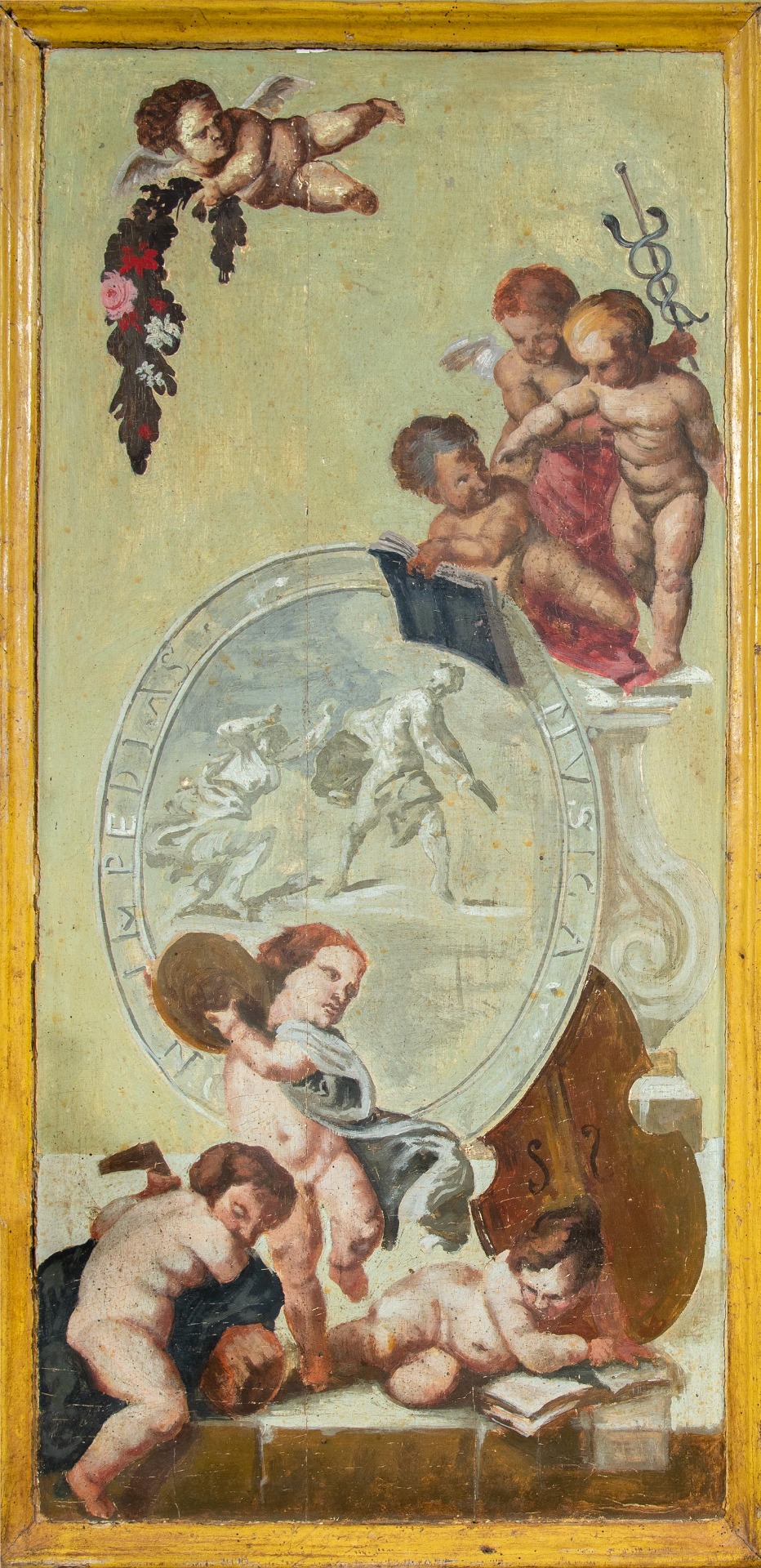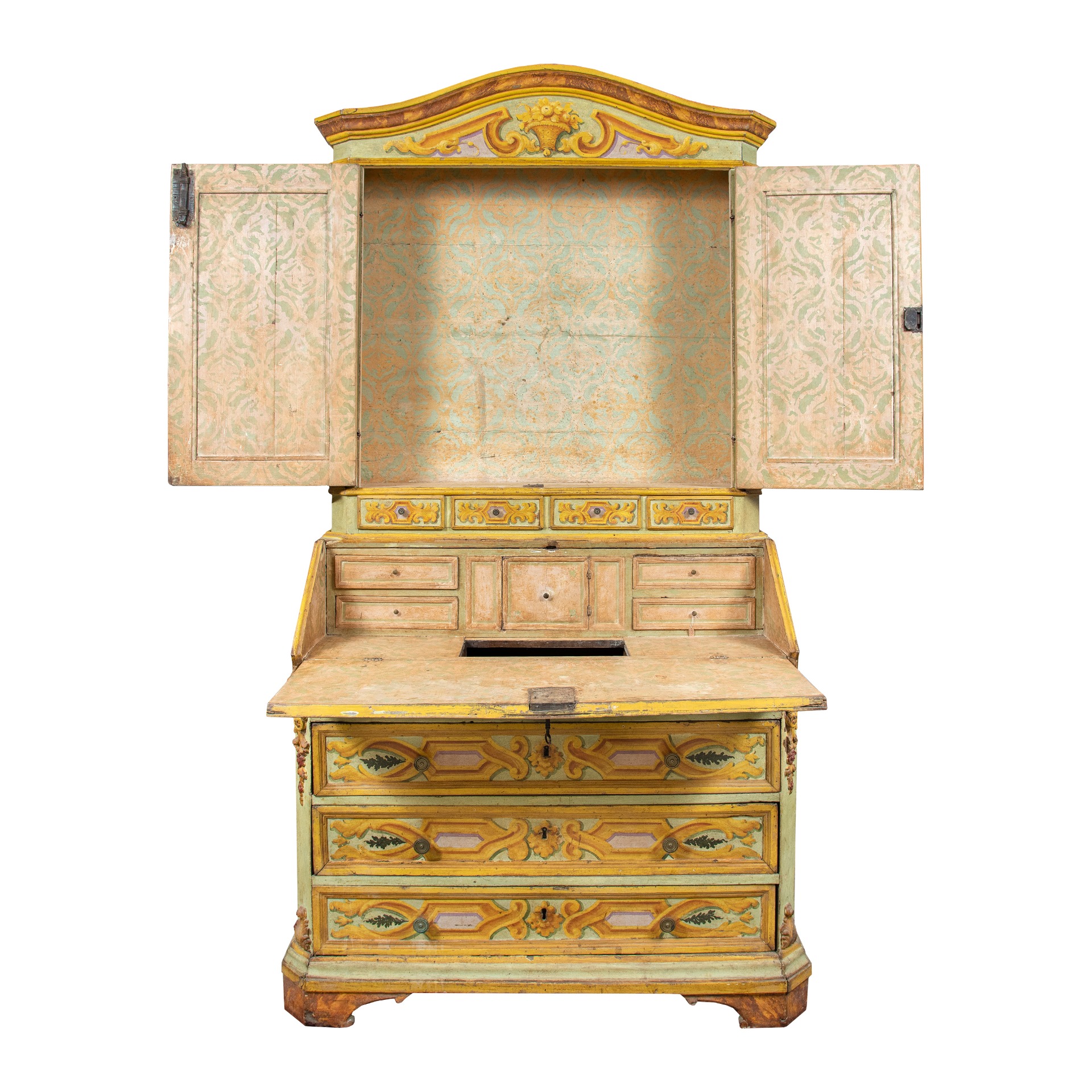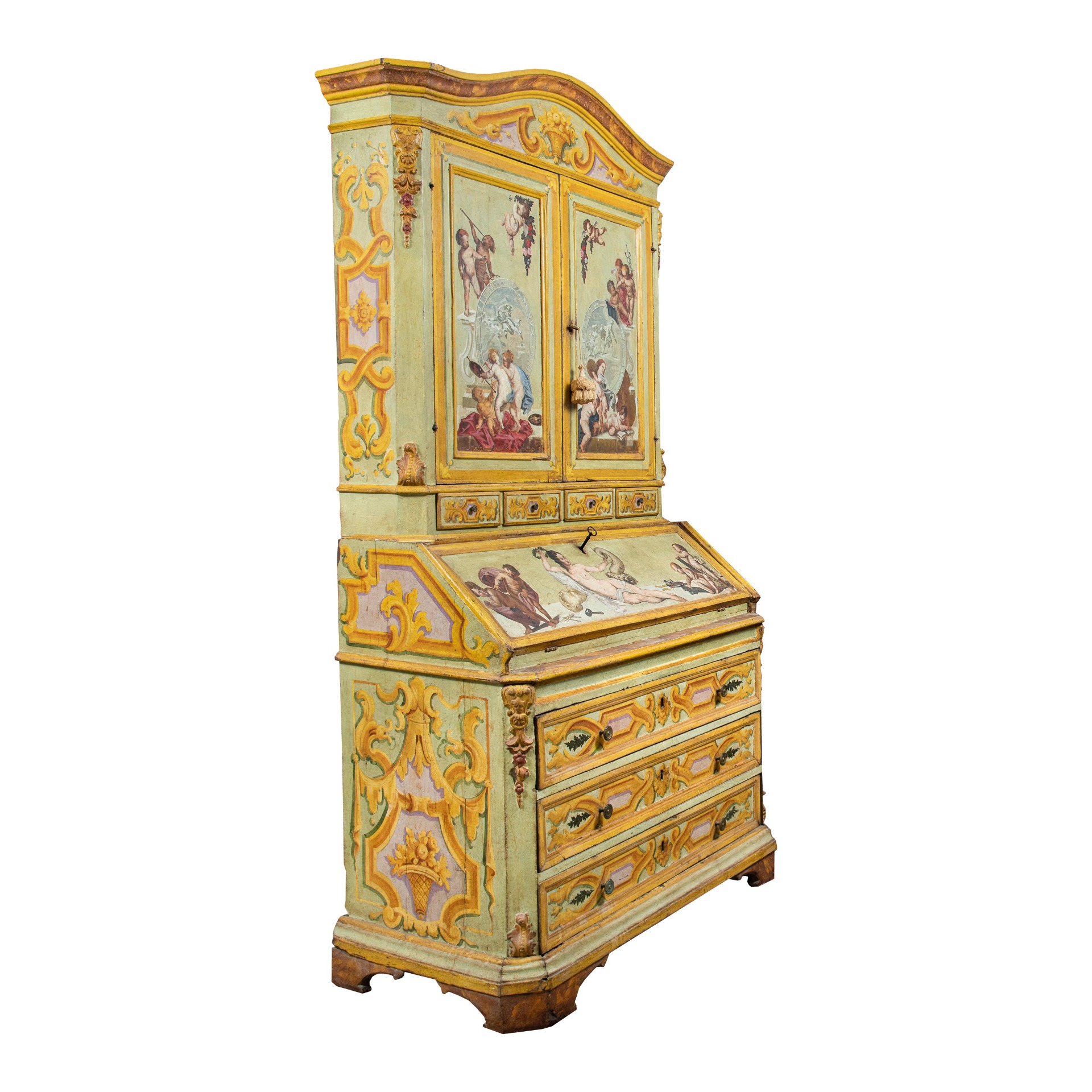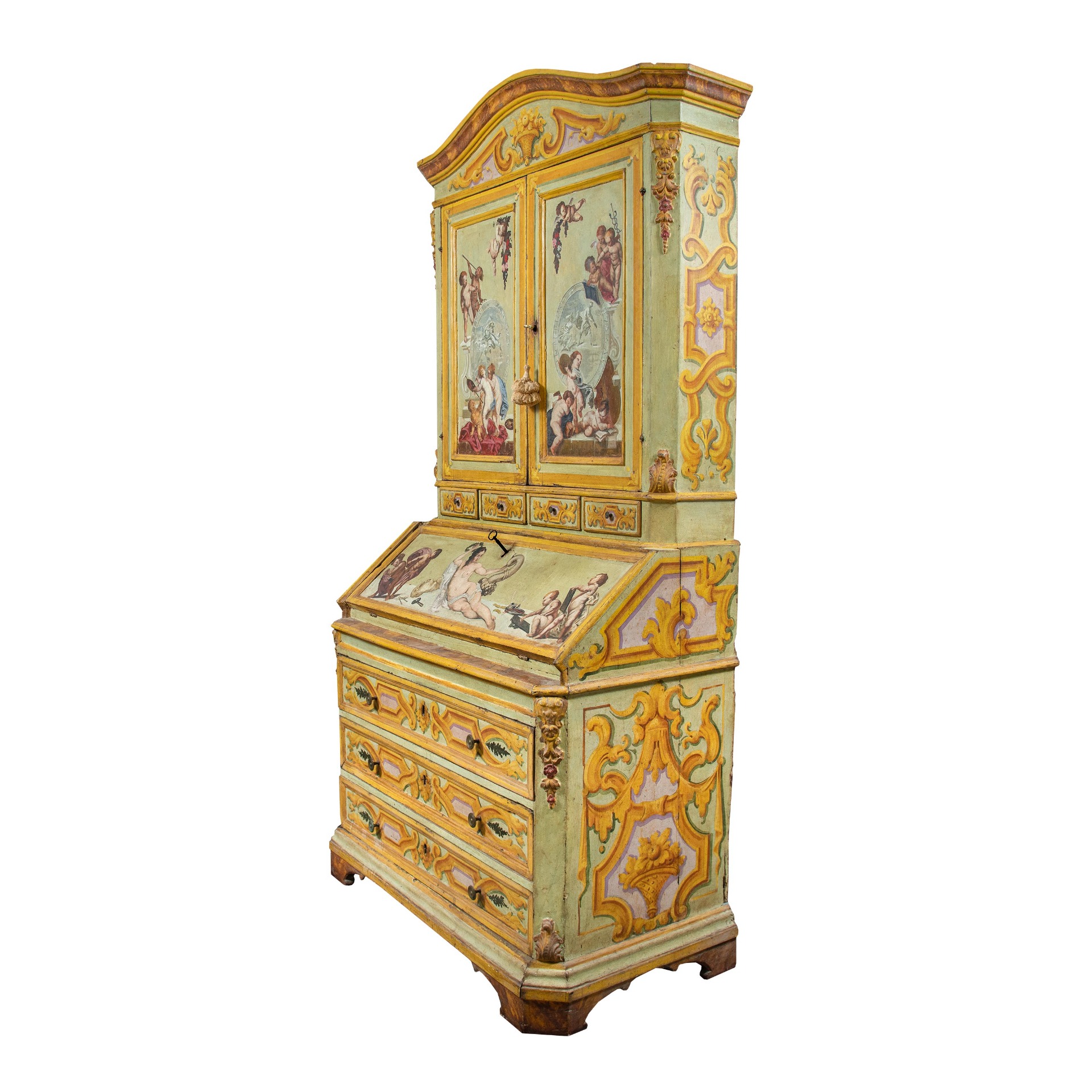 Realizzato interamente in legno laccato e dipinto a tema dell’“Allegoria delle Arti”. Fronte dritto a tre cassetti, calatoia celante vani e cassettini. Interni realizzati in legno dipinto a simulazione di una carta da parati ornata.