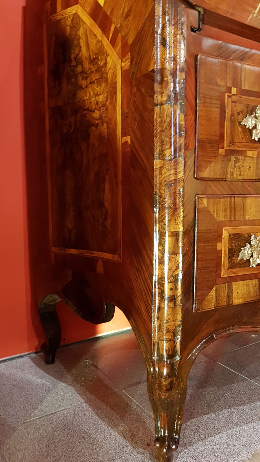 Trumeau lombardo, lastronato e radicato in legno di noce e olmo, due cassetti e due ante con specchi, XVII/XVIII secolo, altezza 233 cm, misure 100x54 cm.