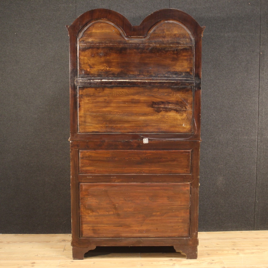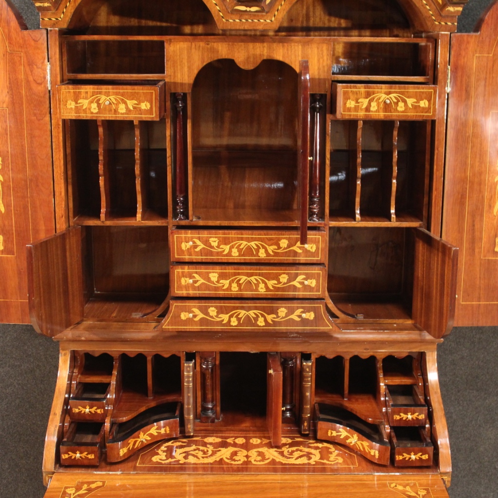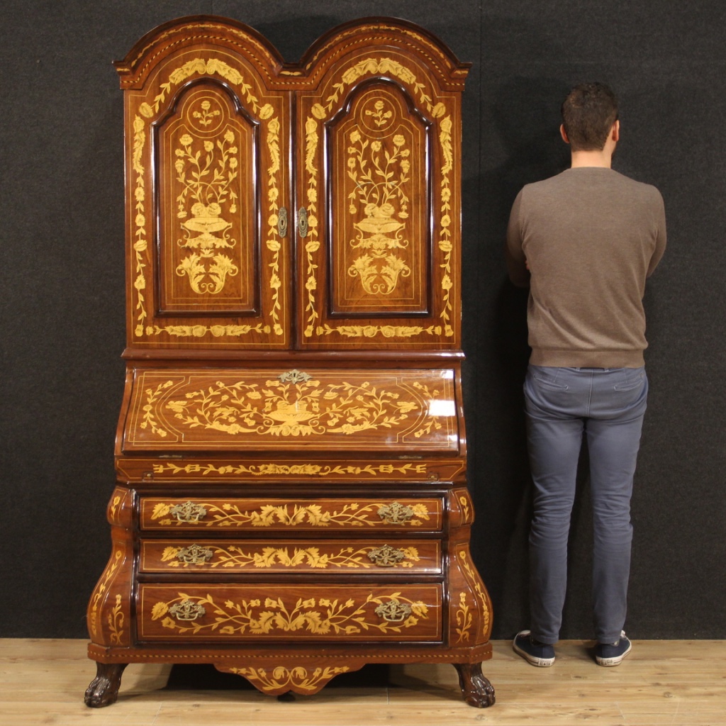 Favoloso trumeau olandese del XX secolo. Mobile mosso e bombato riccamente intarsiato in legni di noce, mogano, faggio, acero e legni da frutto. Trumeau doppio corpo munito di tre cassetti esterni di buona capacità. Ribalta che offre al suo interno un piano scrittoio intarsiato di buona misura, 6 cassettini, un'antina centrale, diversi vani porta documenti e 2 finti libri (cassetti a segreto). Corpo superiore a due ante con spettacolare interno intarsiato completo di 5 cassetti, 8 vani porta documenti e 3 antine dì ottima capacità (vedi foto). Trumeau da salone o studio, dì grande impatto visivo, sorretto frontalmente da due piedi a sfera artigliata. Fianchi del mobile dì grande eleganza adornati da coppe floreali. Mobile in buone condizioni con qualche segno del tempo.