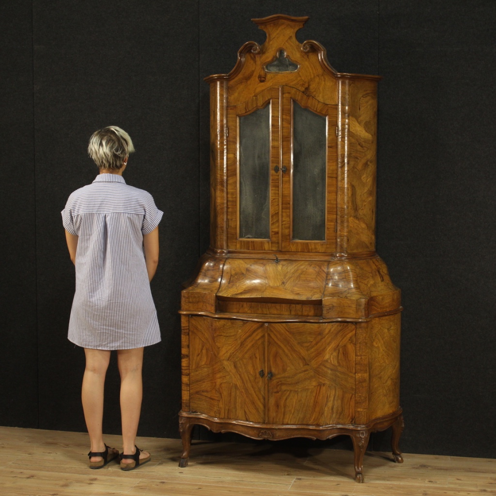 Trumeau veneziano della metà del XX secolo. Mobile doppio corpo scolpito e lastronato in legni di noce, ulivo, radica e faggio di bella linea e piacevole arredamento. Trumeau mosso e bombato munito di due ante e calatoia nel corpo inferiore. Interno della credenza completo di un piccolo ripiano più piano a basamento. La ribalta offre al suo interno due cassettini, due vani porta documenti e piano scrittoio di discreta misura e servizio (vedi foto). Corpo superiore a due ante con specchi antichizzati, interno con tre ripiani fissi più piano a basamento (vedi foto). Cimasa adornata da specchio antichizzato rotto in due punti (vedi foto). Mobile strutturalmente sano, ideale da inserire in un salone o studio, di bella decorazione. Completo di tre chiavi funzionanti, nel complesso in buono stato conservativo.
