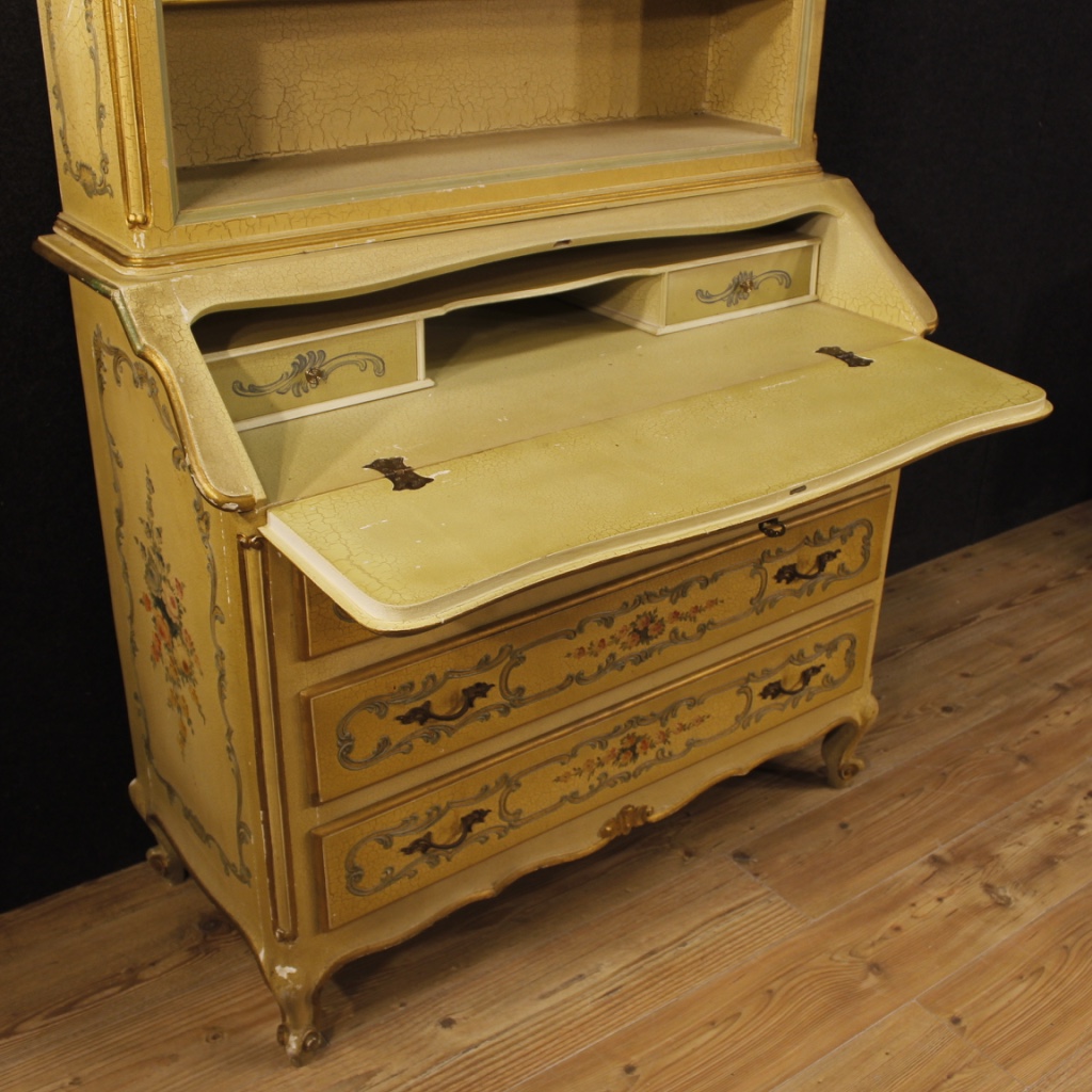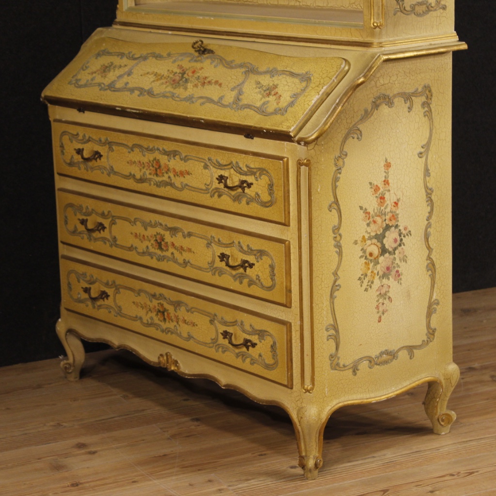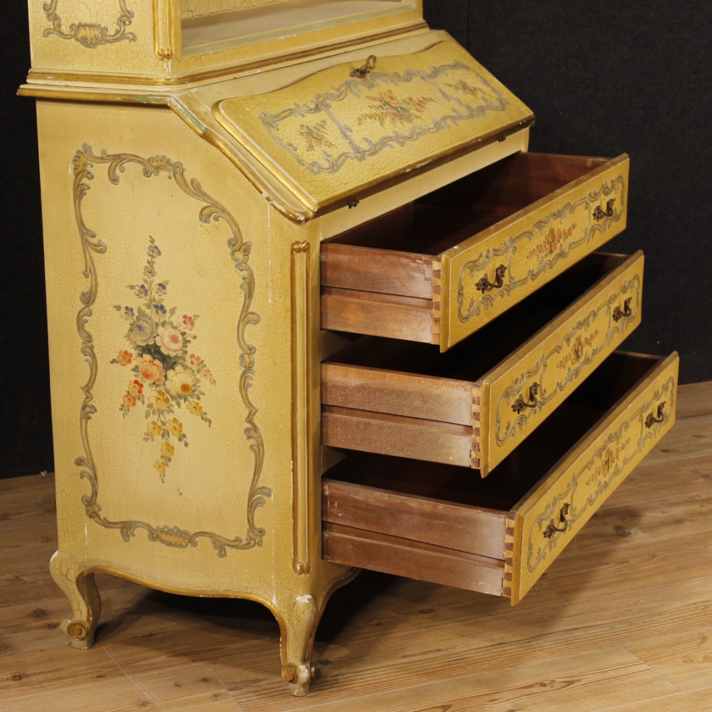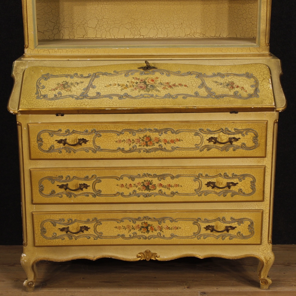 Trumeau veneziano del XX secolo. Mobile doppio corpo in legno laccato, dorato e dipinto con decori floreali di grande piacevolezza. Trumeau da sala o salone munito di tre cassetti esterni di buona capacità. Interno della ribalta completo di due cassettini e piano scrittoio di buona misura e servizio. Corpo superiore munito di tre ripiani non regolabili in altezza ideali per esporre collezioni di oggettistica. Mobile facente parte di un set (vedi foto e richiedi il prezzo in blocco se disponibile). Completo di una chiave funzionante (della ribalta) presenta diverse piccole cadute di colore e qualche segno di usura. Nel complesso in buono stato conservativo.
