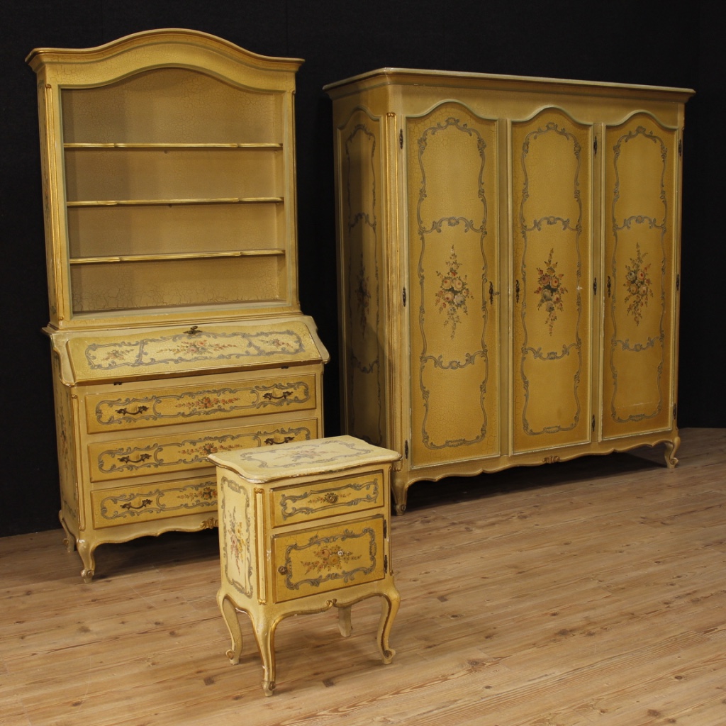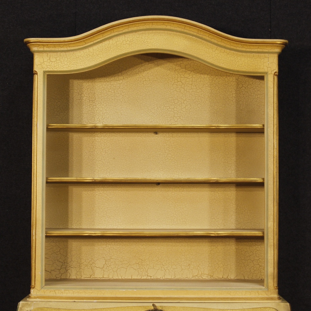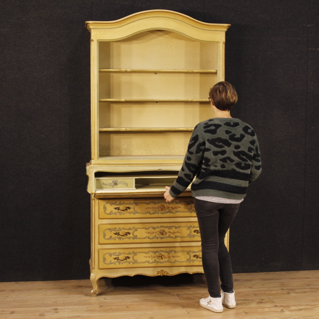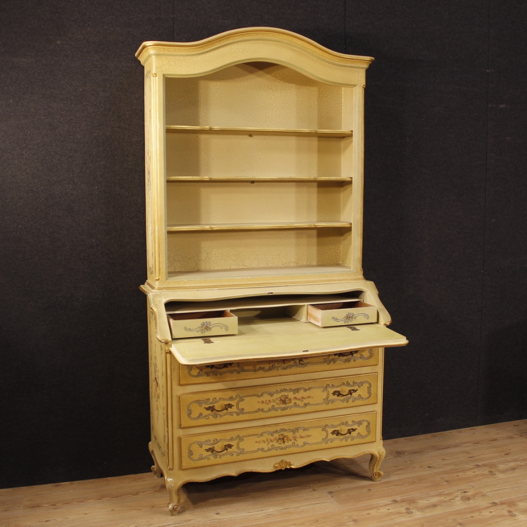 Trumeau veneziano del XX secolo. Mobile doppio corpo in legno laccato, dorato e dipinto con decori floreali di grande piacevolezza. Trumeau da sala o salone munito di tre cassetti esterni di buona capacità. Interno della ribalta completo di due cassettini e piano scrittoio di buona misura e servizio. Corpo superiore munito di tre ripiani non regolabili in altezza ideali per esporre collezioni di oggettistica. Mobile facente parte di un set (vedi foto e richiedi il prezzo in blocco se disponibile). Completo di una chiave funzionante (della ribalta) presenta diverse piccole cadute di colore e qualche segno di usura. Nel complesso in buono stato conservativo.