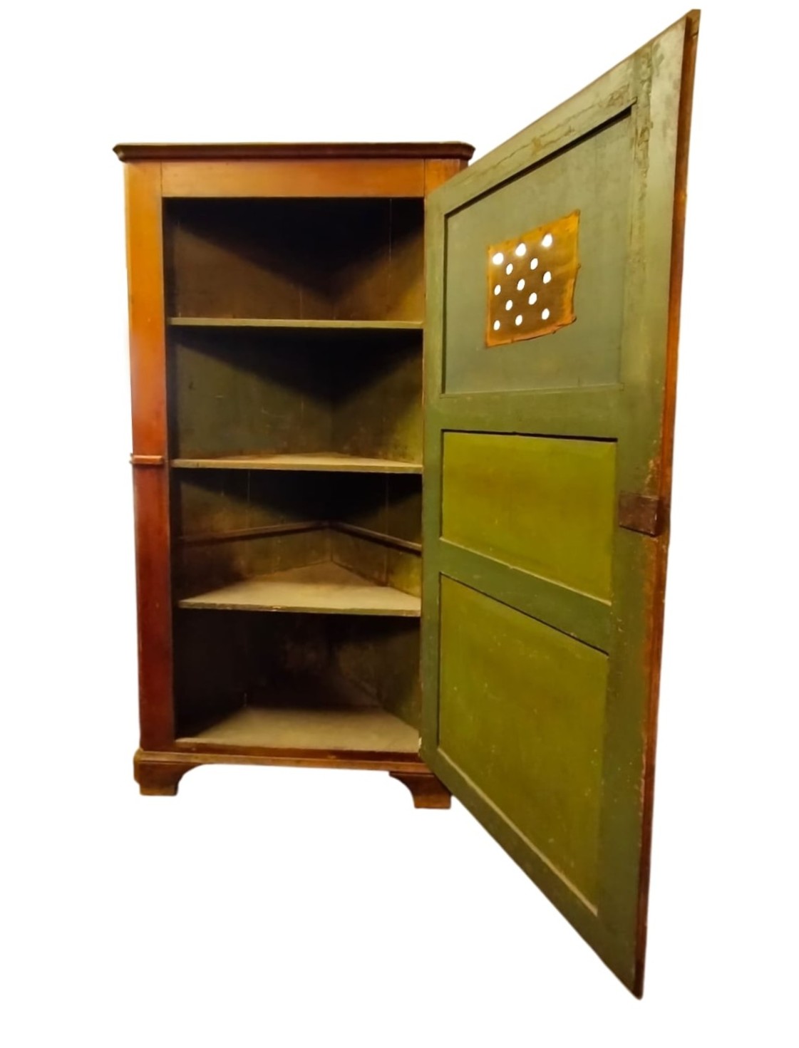Angoliera romagnola della seconda metà dell’Ottocento in abete e tavolo romagnolo anni ’30/’40 in olmo massiccio, due pezzi di valore storico e artigianale, perfettamente abbinabili per stile, materiali ed epoca. Nello sportello superiore l'angoliera ha fori originali per conservare le vivande, caratteristica tipica della tradizione romagnola.