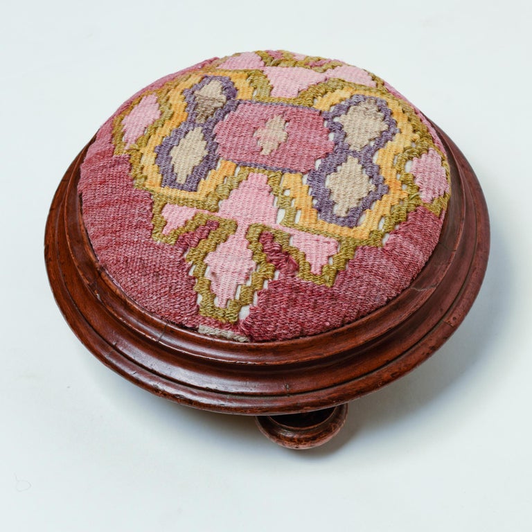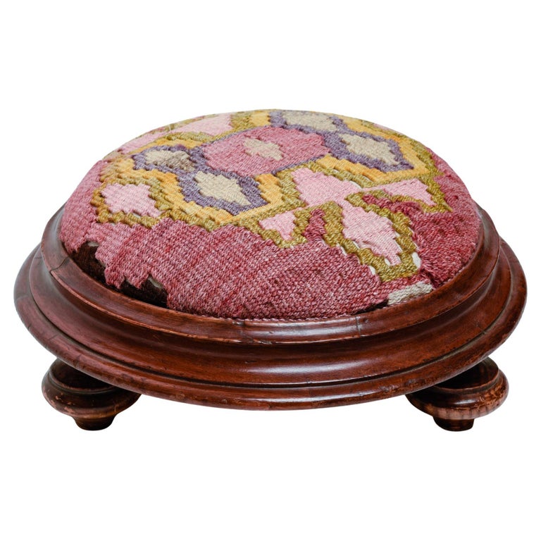 Antico poggiapiedi italiano in legno di noce, imbottito e rivestito con un frammento di kilim turco. Comodo , utile e bello.