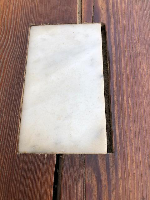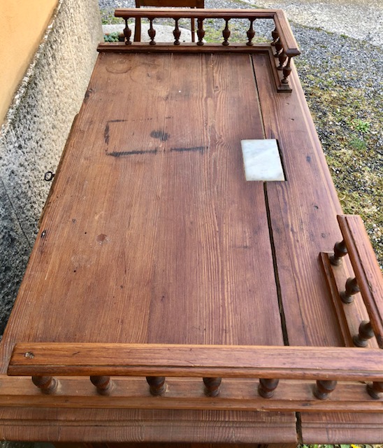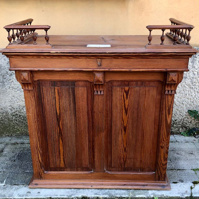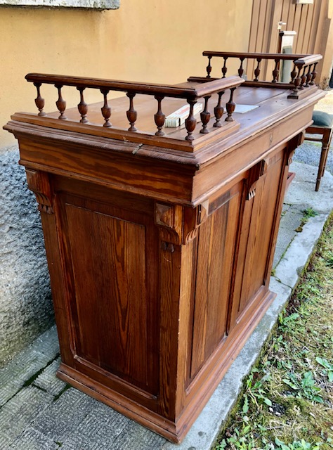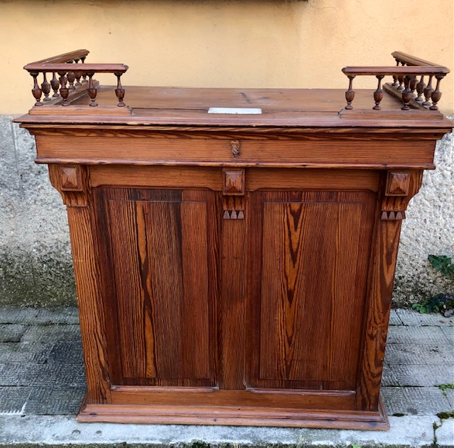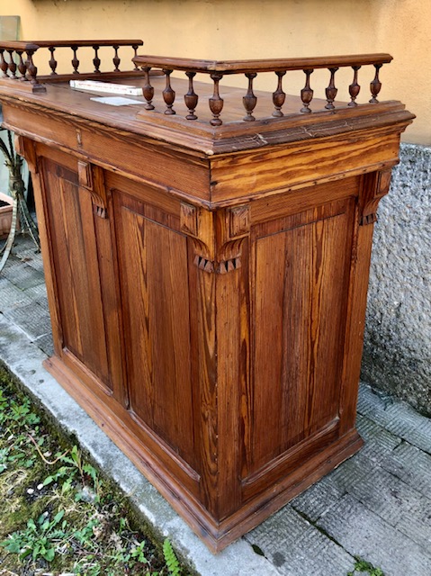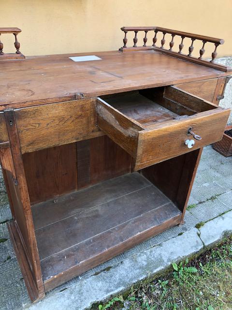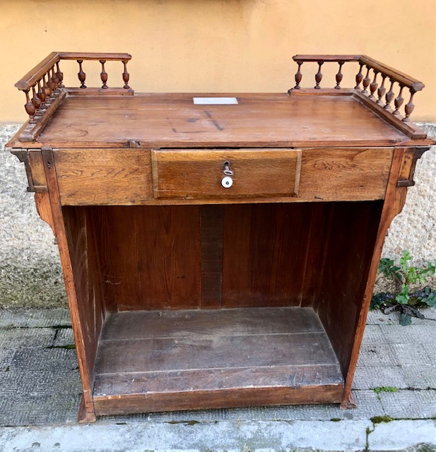 Grazioso banco da negozio con fessura per raccolta monete e cassettino sottostante. Misure: cm. 97 x 52 x 86 di altezza