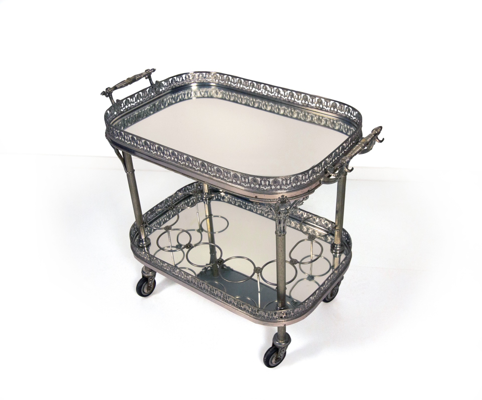 Carrello portavivande in metallo argentato, XX secolo, ghiera con decori a palmette, montanti a colonna; al piano inferiore nove anelli portabottiglie, cm 74x85x48 2025.109.26 Ad integrazione delle descrizioni, la galleria “Antichità Giglio” rende disponibili, a richiesta, condition report sullo stato di conservazione dei propri beni e preventivi di trasporto nazionali ed internazionali.