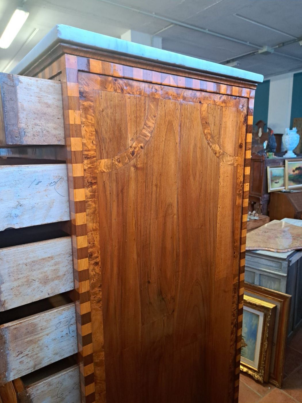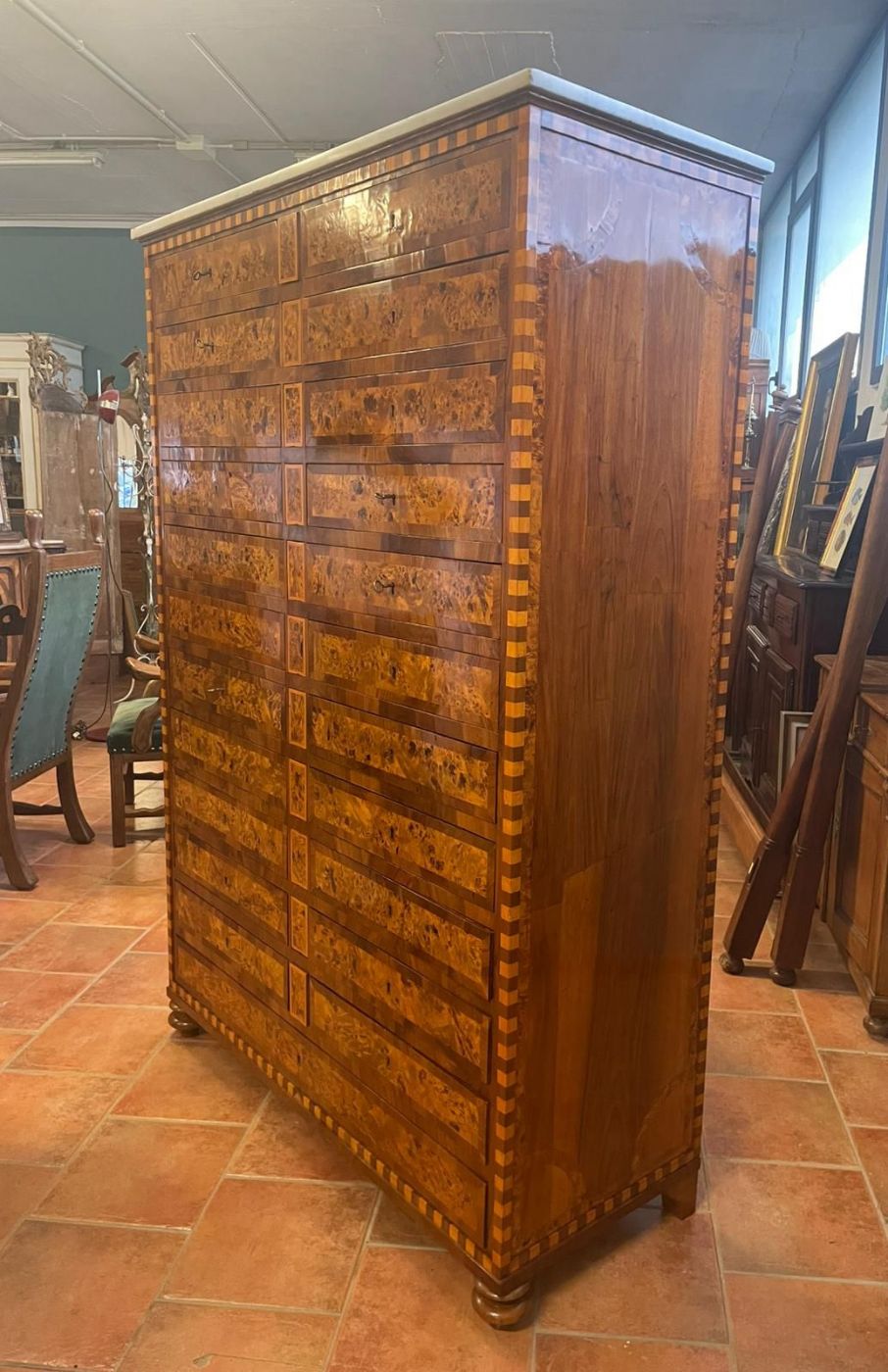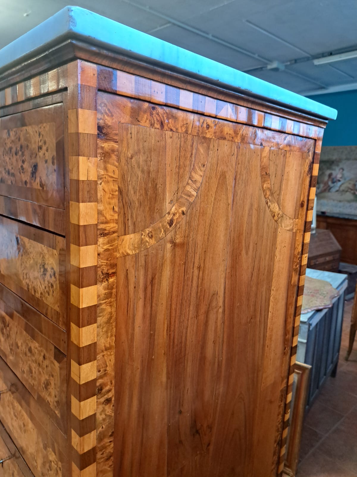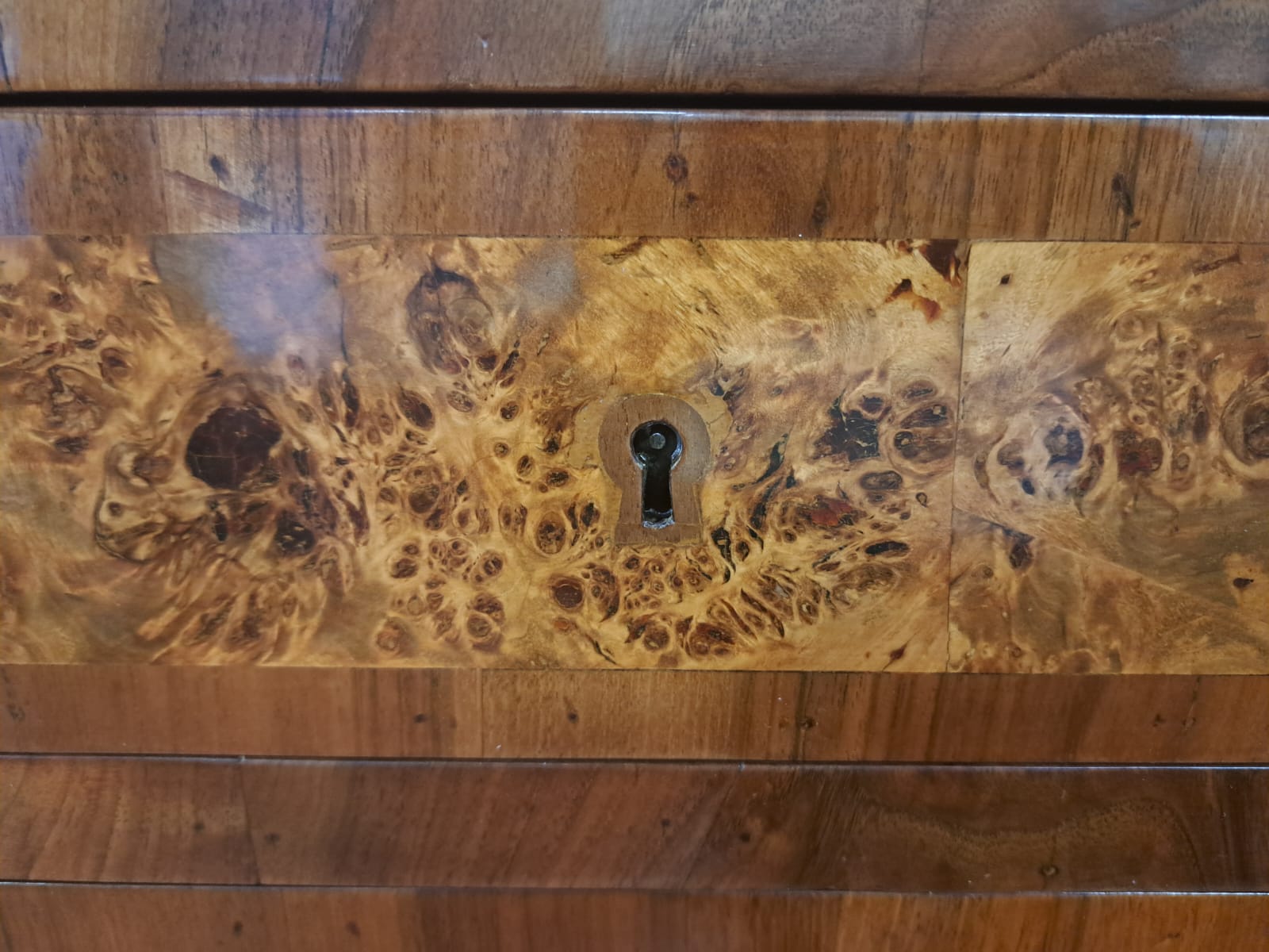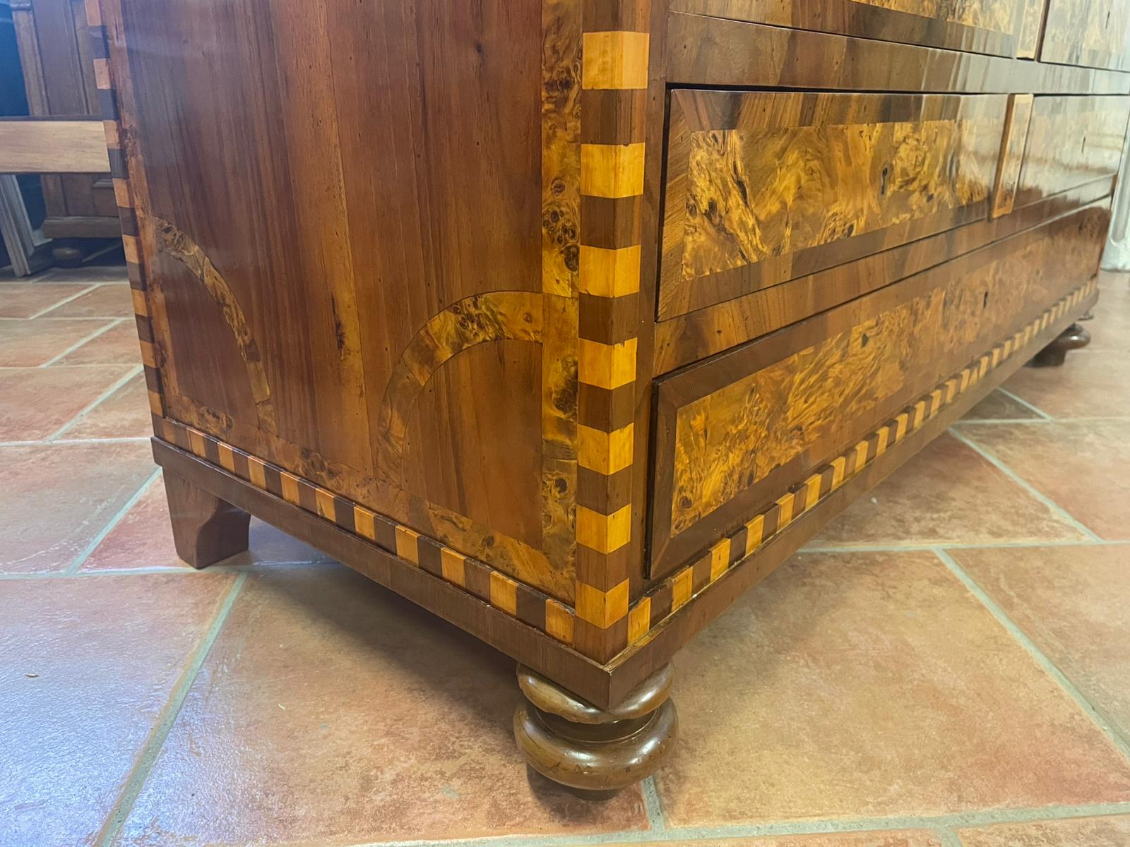 A rendere ancora più preziosa la cassettiera le essenze usate per gli intarsi e le lastronature:
