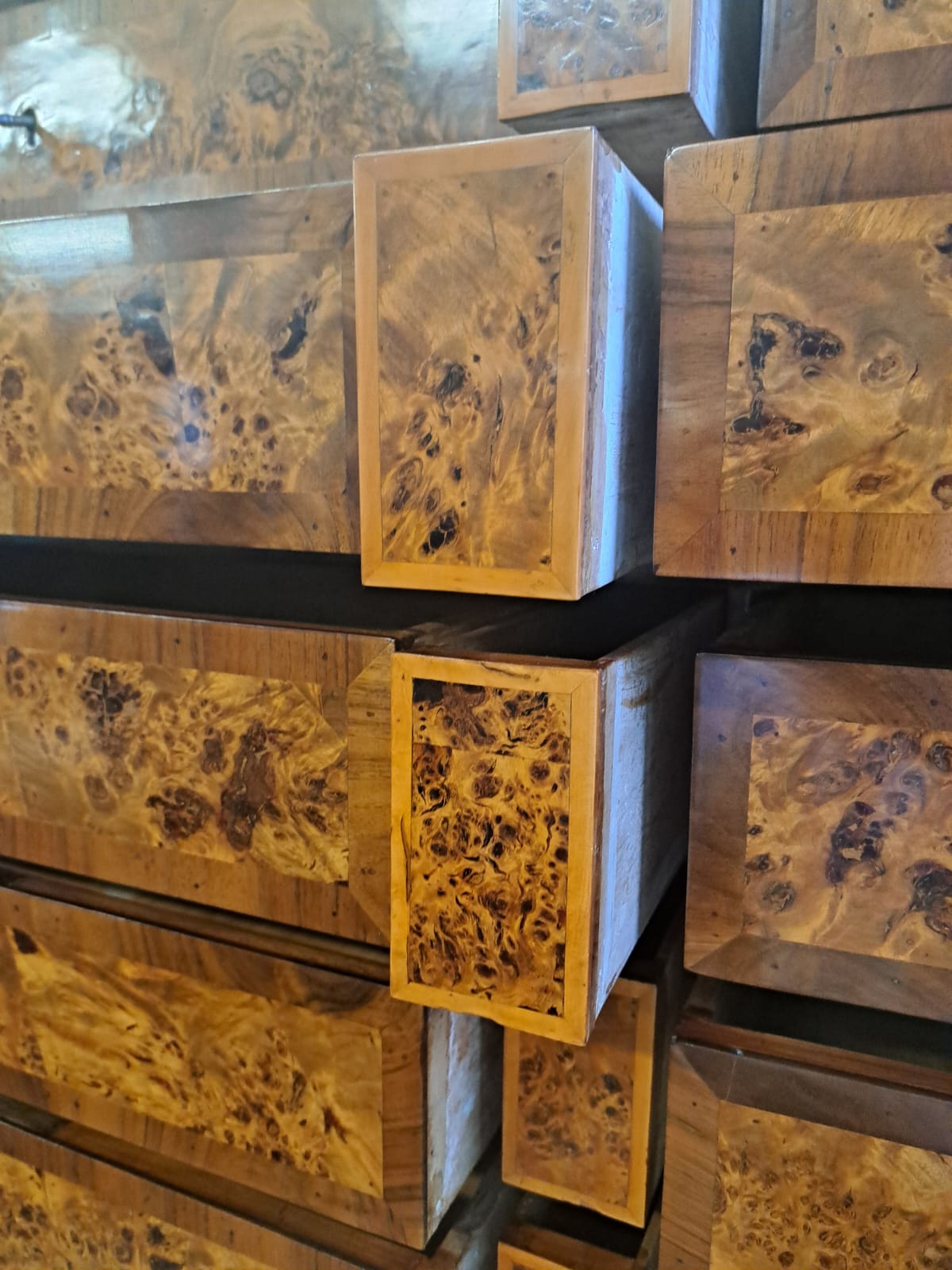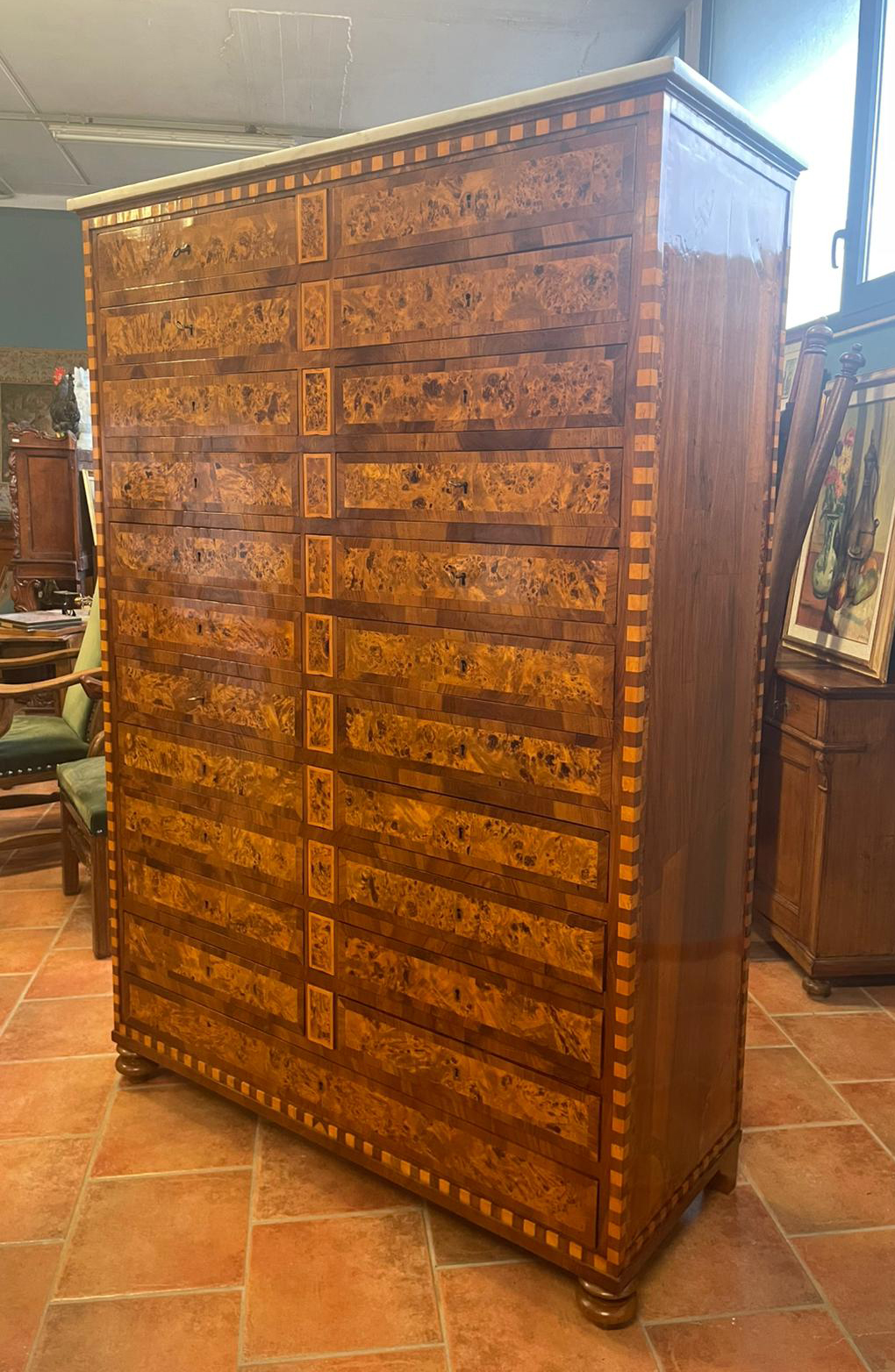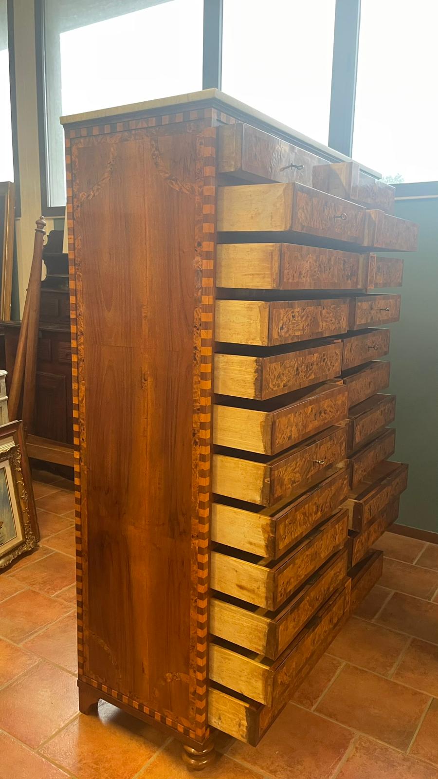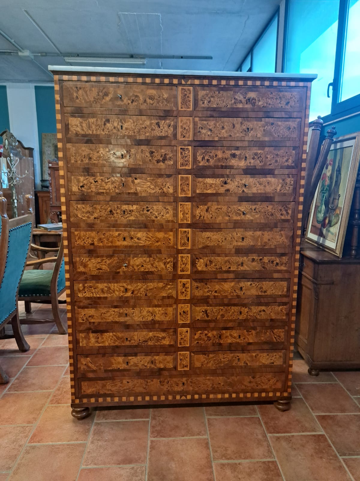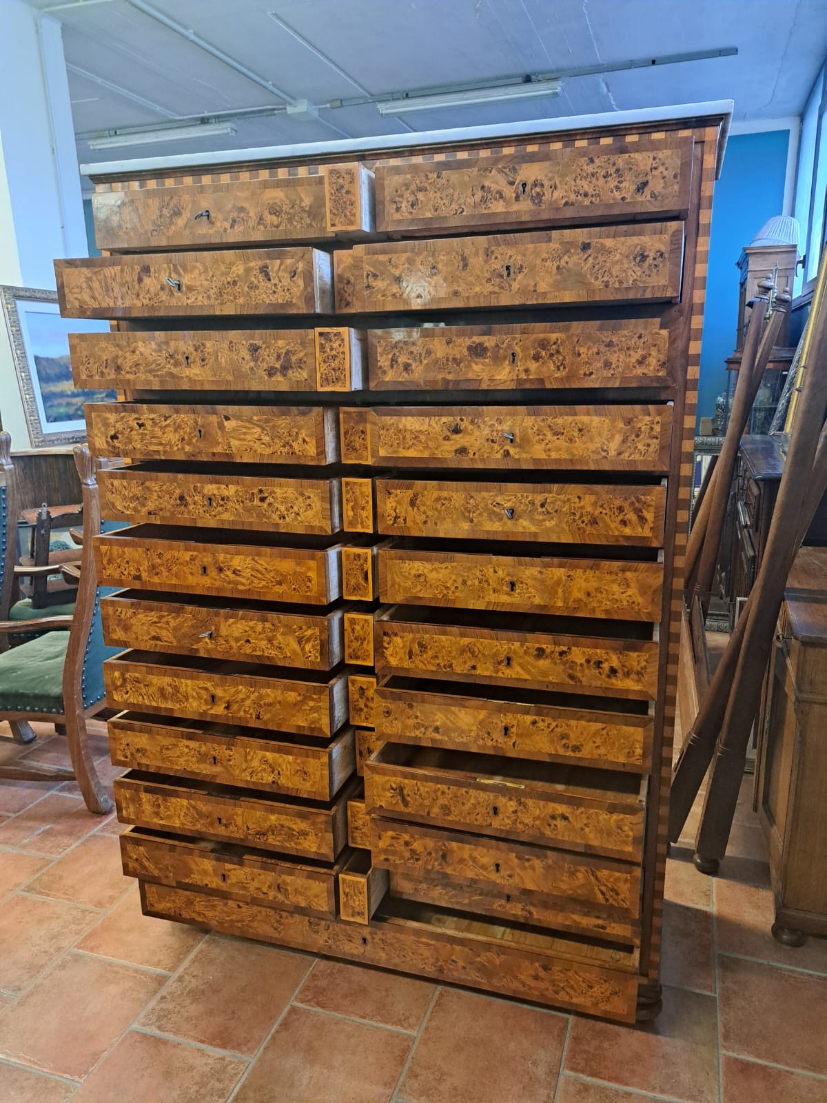 Meravigliosa e unica cassettiera proveniente da storica dimora fiorentina dove era collocata nell’ala dedicata alla biblioteca di famiglia.Il mobile presenta un totale di 34 cassetti compresi i piccoli ma profondi cassettini centrali segreti.