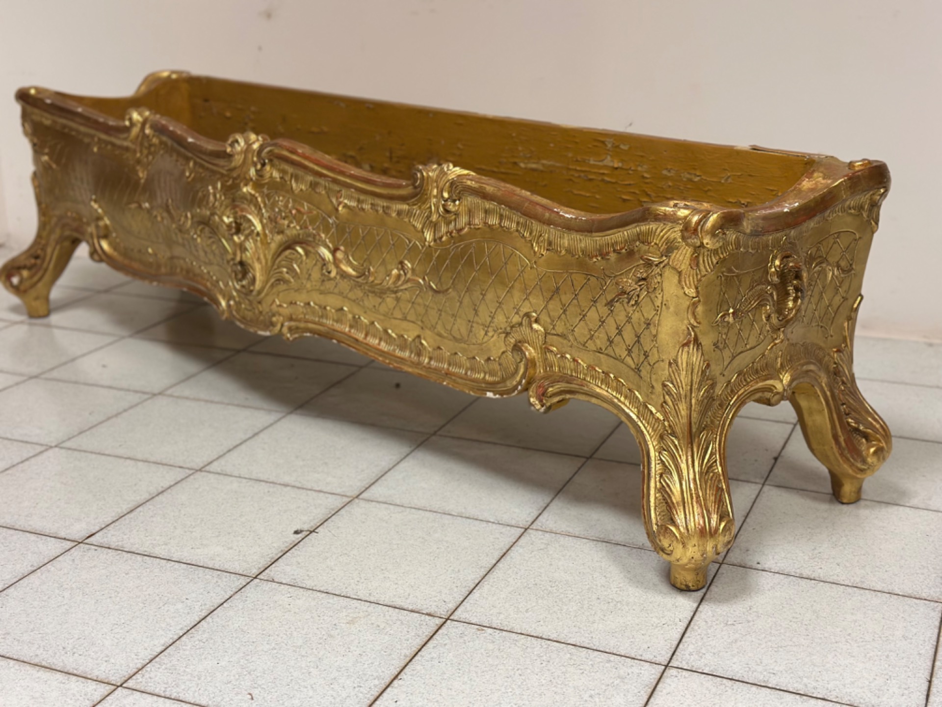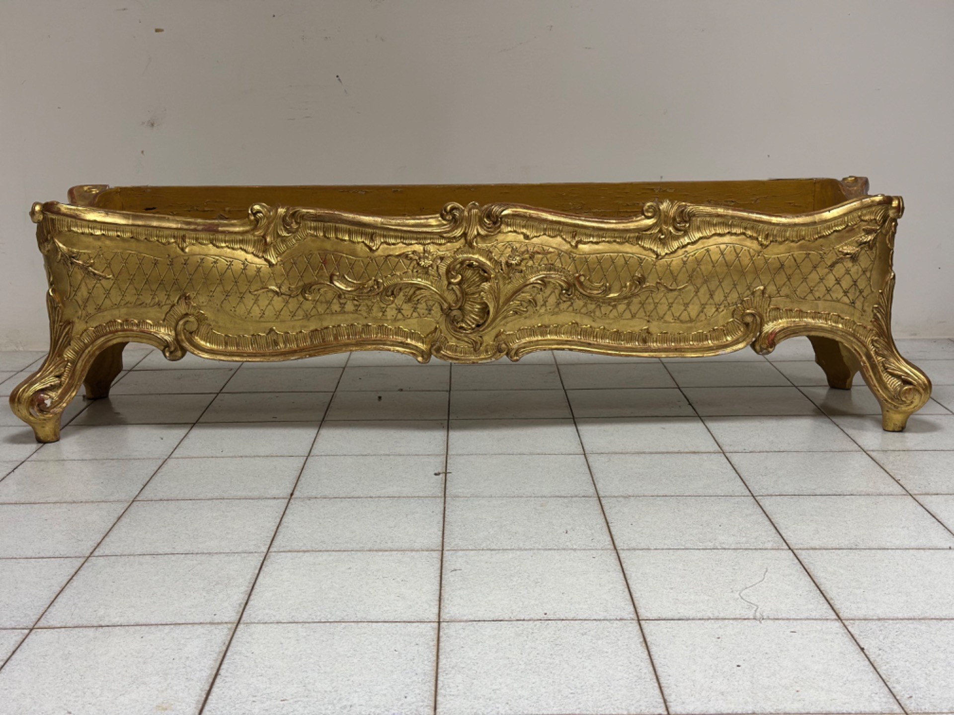 Fioriera in legno intagliato e dorato a foglia oro zecchino con decoro lavorato a rilievo piedi a ricciolo , all’interno vasca in ferro contenitore fiori lombardia primi 800 misure : L 175 / P 45 / H 44 si certifica la sua autenticità Si rilascia fattura di vendita spedizioni in tutta Europa non esitate a contattarci accettiamo pagamento pay pal visa Mastercard