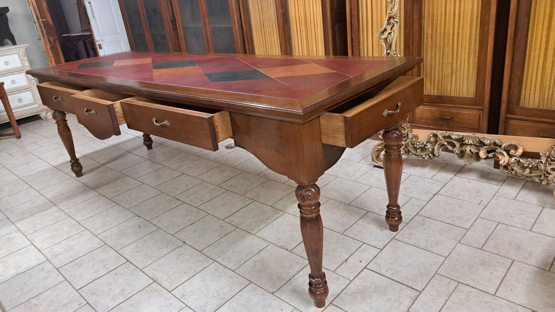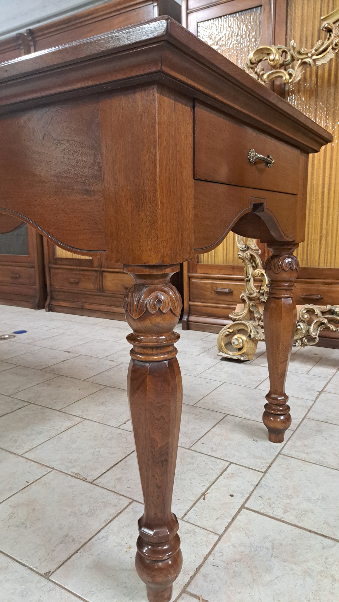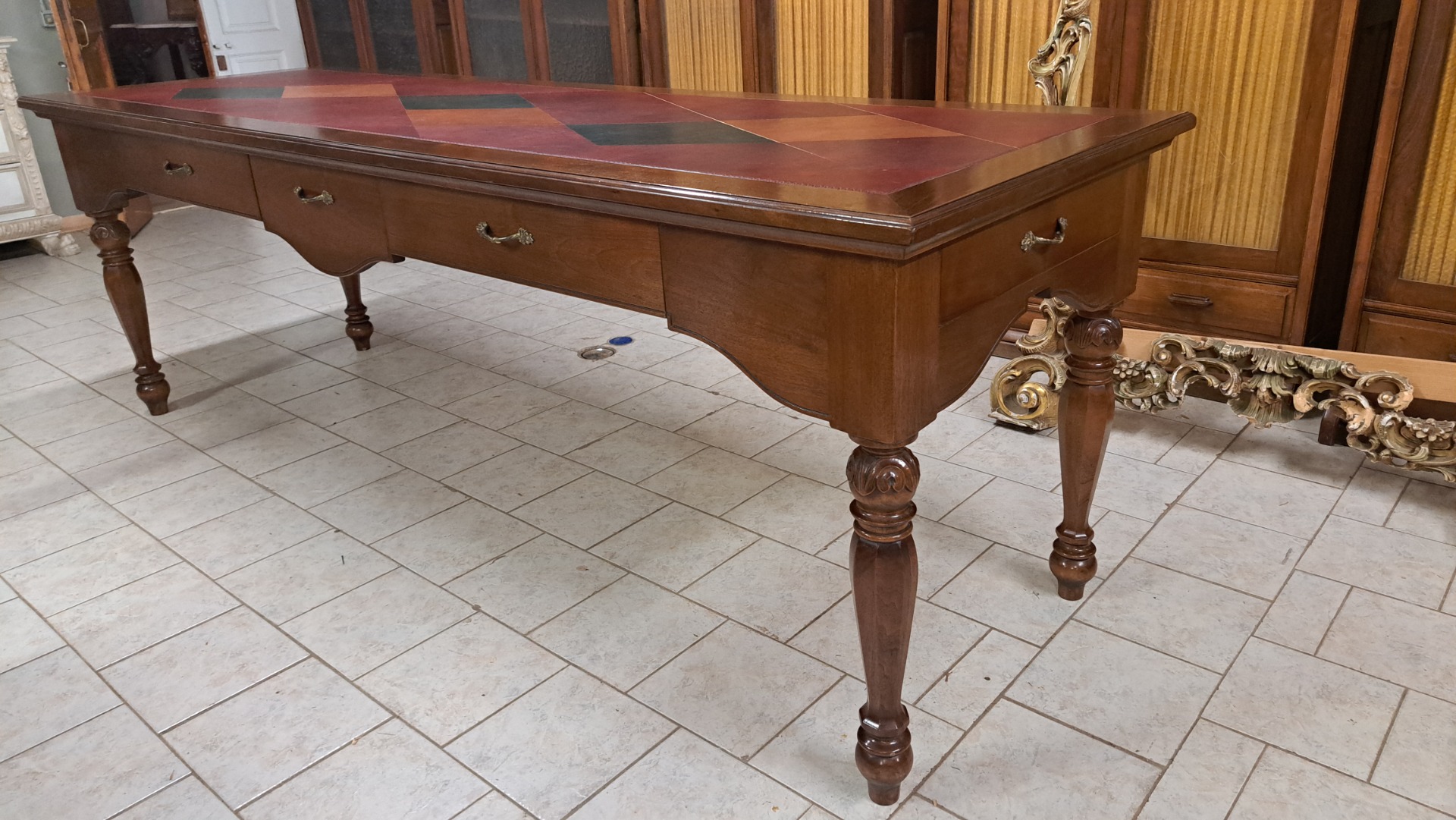 Bellissimo tavolo da negozio in noce, piano in pelle, 7 grandi cassetti, tre per ogni lato lungo ed uno sul lato corto, condizioni perfette. Zampe tornite con un gradevolissimo intaglio.Misura: 3 m x 95 cm, altezza 101