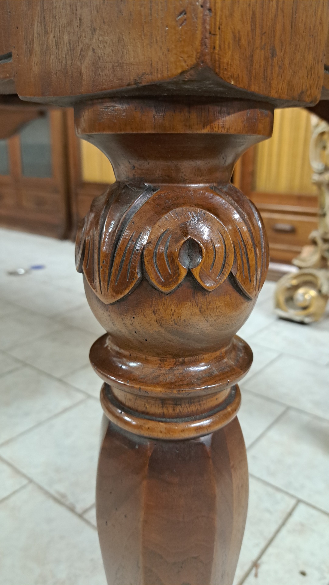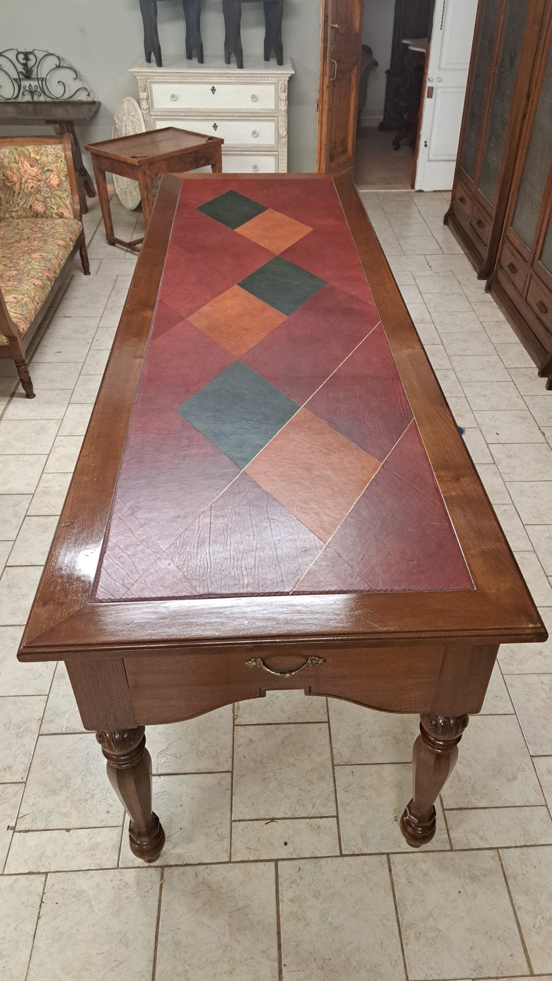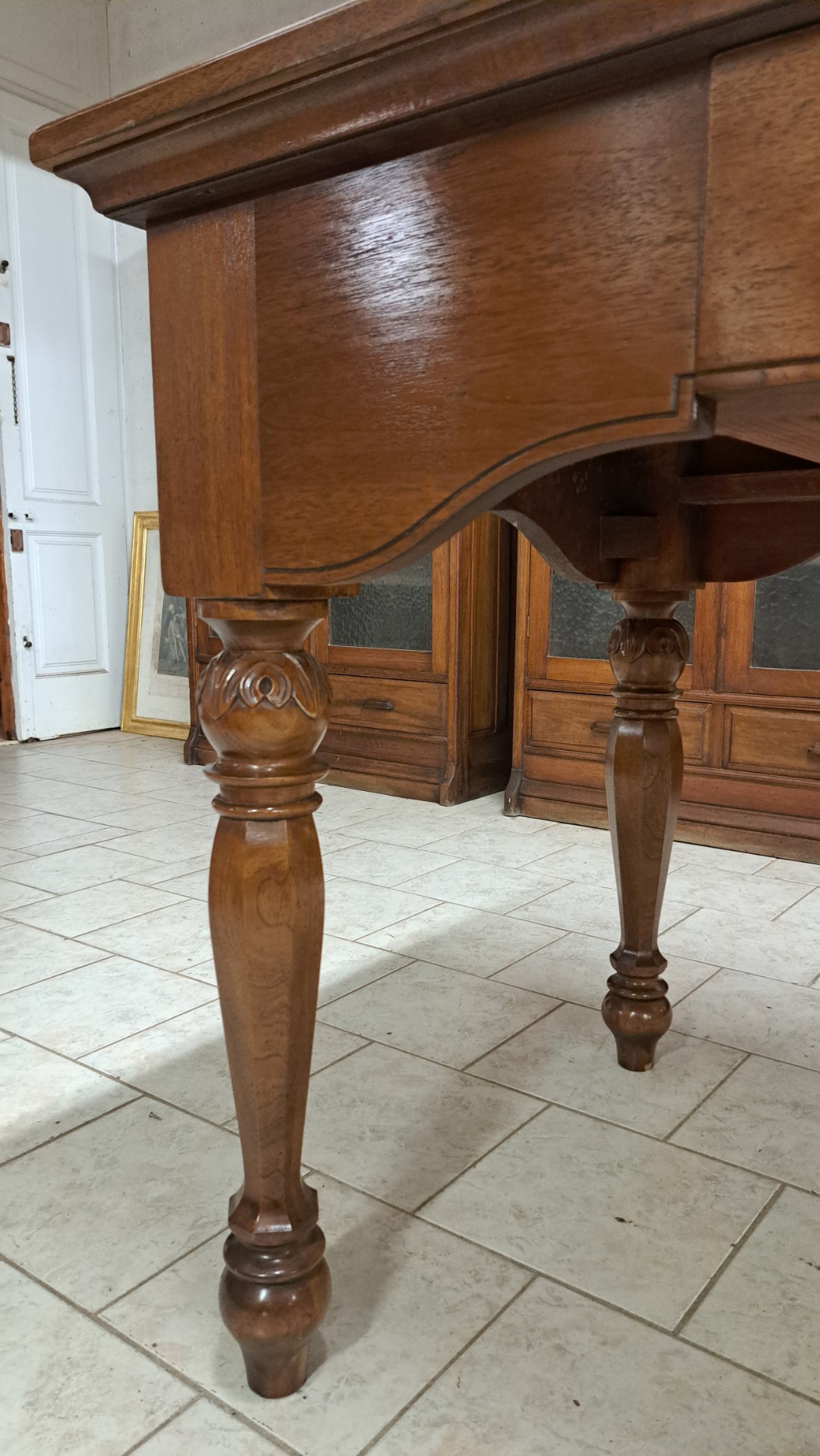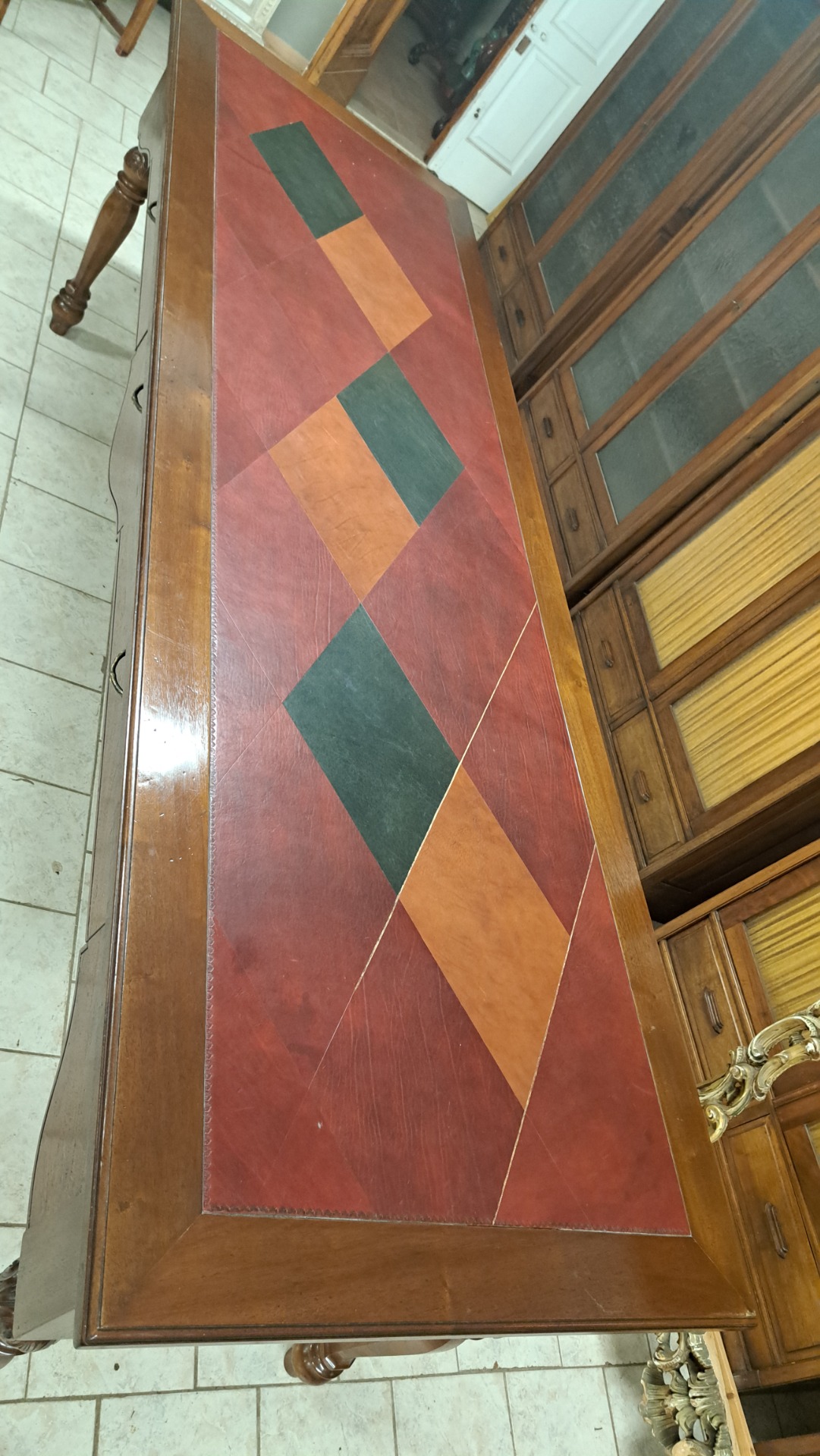 Bellissimo tavolo da negozio in noce, piano in pelle, 7 grandi cassetti, tre per ogni lato lungo ed uno sul lato corto, condizioni perfette. Zampe tornite con un gradevolissimo intaglio.Misura: 3 m x 95 cm, altezza 101