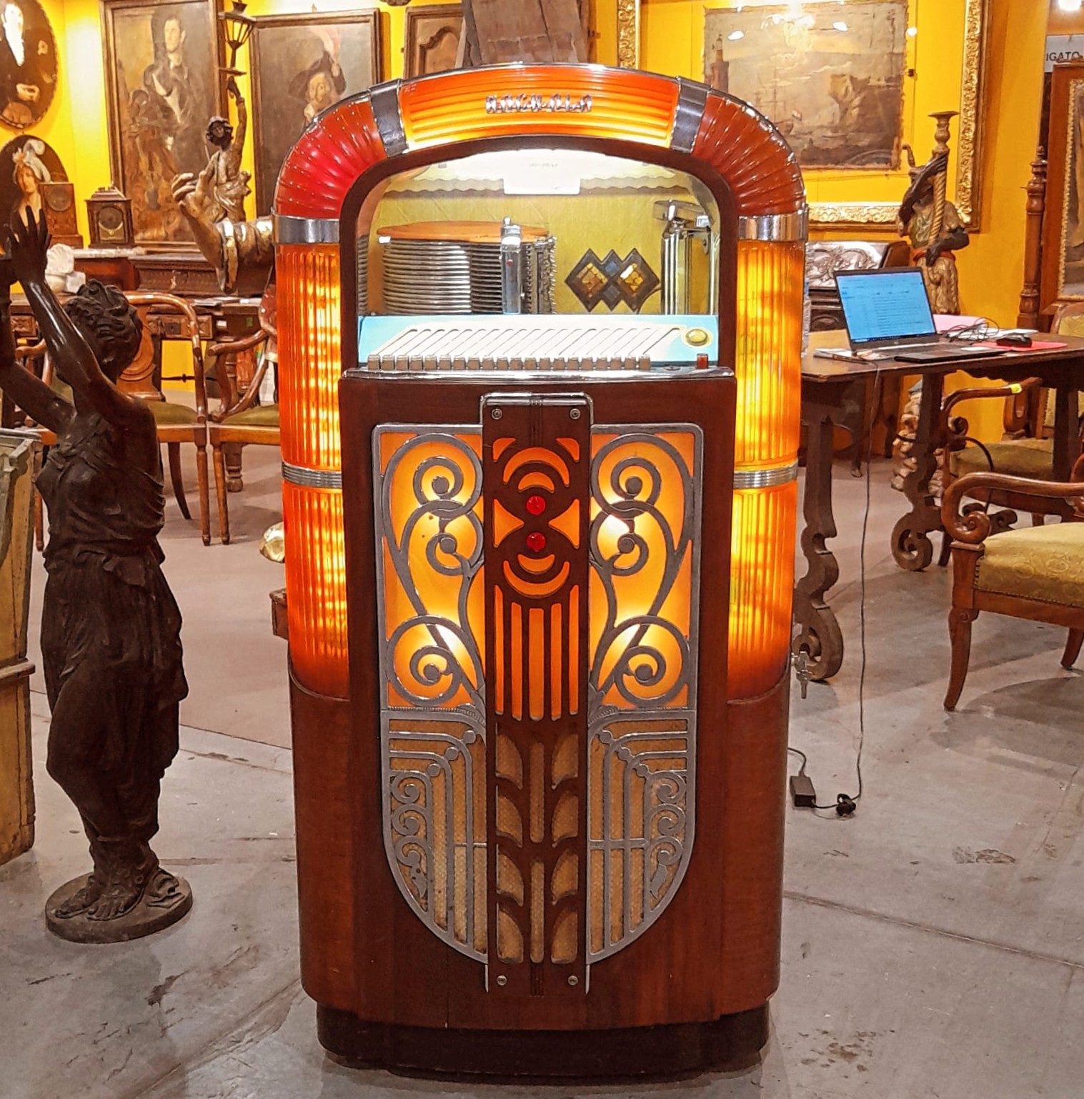 Jukebox Rock-Ola Mod. 1426 – Anno 1947 – 20 dischi / 78 giri Autentico jukebox Rock-Ola modello 1426, prodotto nel 1947, uno dei primi modelli del dopoguerra e simbolo dell’epoca d’oro della musica su vinile. Un pezzo iconico dal design inconfondibile, con cabinet in legno, colonne illuminate in plastica color ambra e griglia cromata frontale. A vista il meccanismo di selezione dei dischi, caratteristica innovativa per l’epoca. Caratteristiche principali: Marca / Modello: Rock-Ola 1426 Anno di produzione: 1947 Selezioni: 20 dischi – 78 giri/min Dimensioni: H 144 cm – L 75 cm – P 65 cm Peso: circa 150 kg Produzione: circa 10.600 unità realizzate Design: struttura in legno, inserti cromati, pannelli luminosi e vetro frontale per visualizzare il meccanismo Condizioni: Funzionante e in ottime condizioni estetiche Ideale per: Collezionisti di jukebox e memorabilia anni ’40-’50 Locali a tema vintage, bar, sale giochi, showroom o ambienti scenografici Arredamento decorativo con forte impatto estetico e storico Per eventuali chiarimenti, ottenere fotografie aggiuntive o per fissare una visita privata, non esitare a contattarci direttamente Offriamo un vasto ventaglio di servizi di restauro, sia completo che conservativo, per ogni oggetto della nostra collezione. La spedizione dei nostri mobili è disponibile in tutta Italia e a livello internazionale, garantendo la massima sicurezza nel trasporto. I dettagli relativi alla spedizione saranno concordati in modo personalizzato per assicurare la tua piena soddisfazione. S,SF art.pr