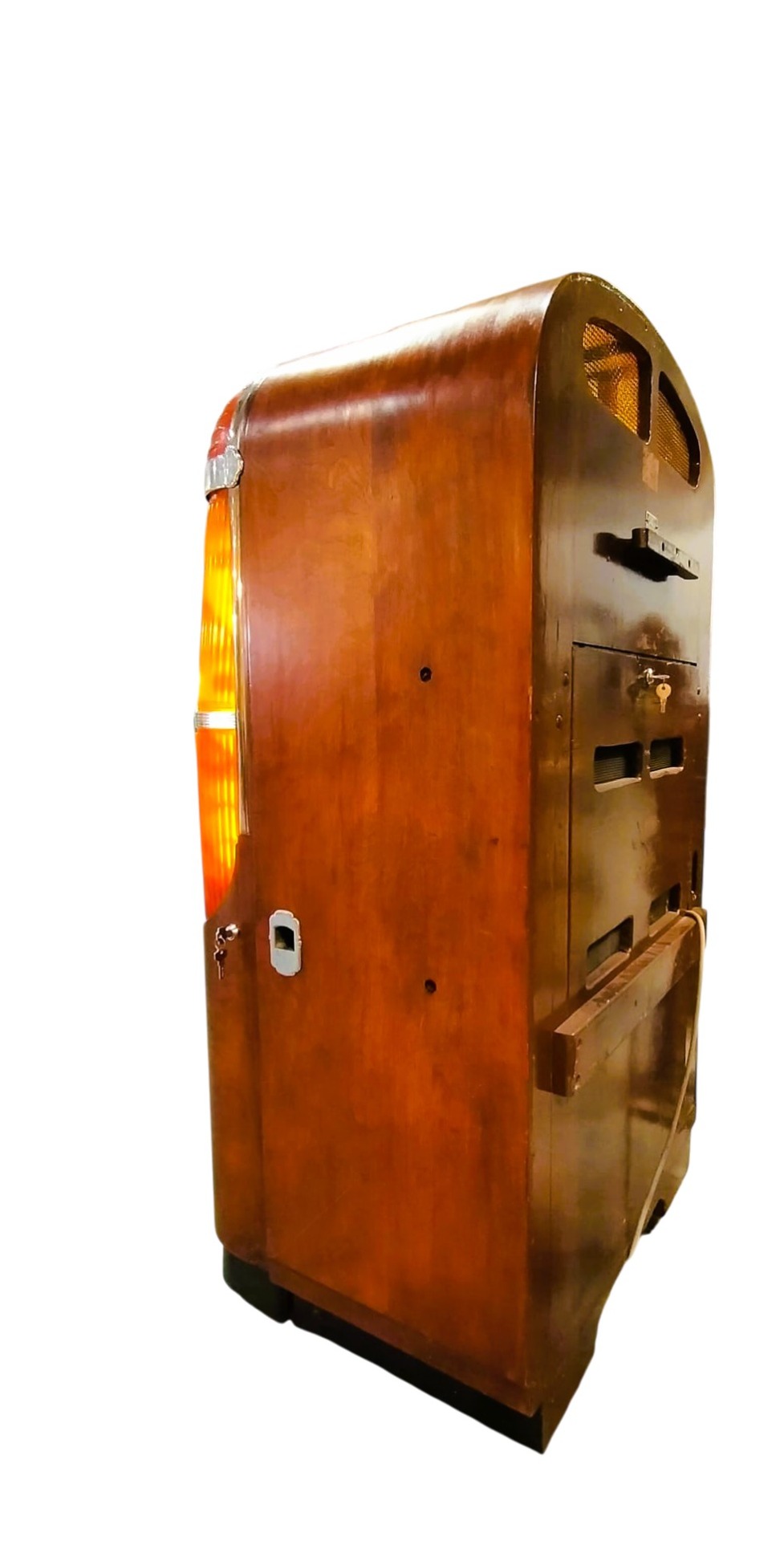 Un pezzo iconico dal design inconfondibile, con cabinet in legno, colonne illuminate in plastica color ambra e griglia cromata frontale. A vista il meccanismo di selezione dei dischi, caratteristica innovativa per l’epoca.