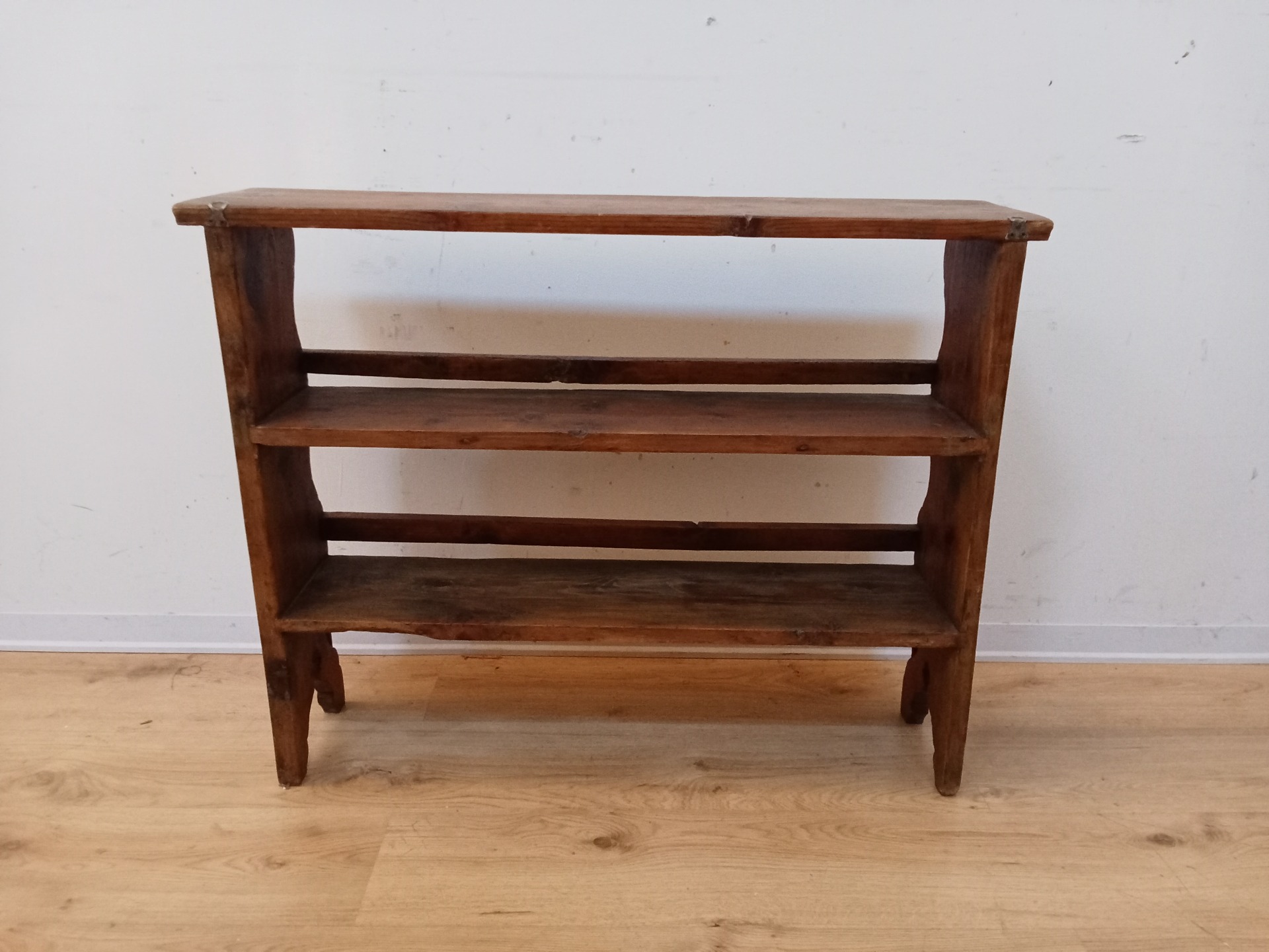 PICCOLA PIATTAIA IN ABETE DA APPOGGIO/MURO DOTATA DI DUE RIPIANI E DI FIANCHI SAGOMATI. NONOSTANTE SI TRATTI DI UN MOBILE DA APPOGGIO, O A TERRA O SU UN MOBILE, GRAZIE AI DUE OCCHIELLI, E' POSSIBILE ANCHE APPENDERLA. CONDIZIONI GENERALI BUONE. EPOCA FINE '800 . PER ULTERIORI FOTO...