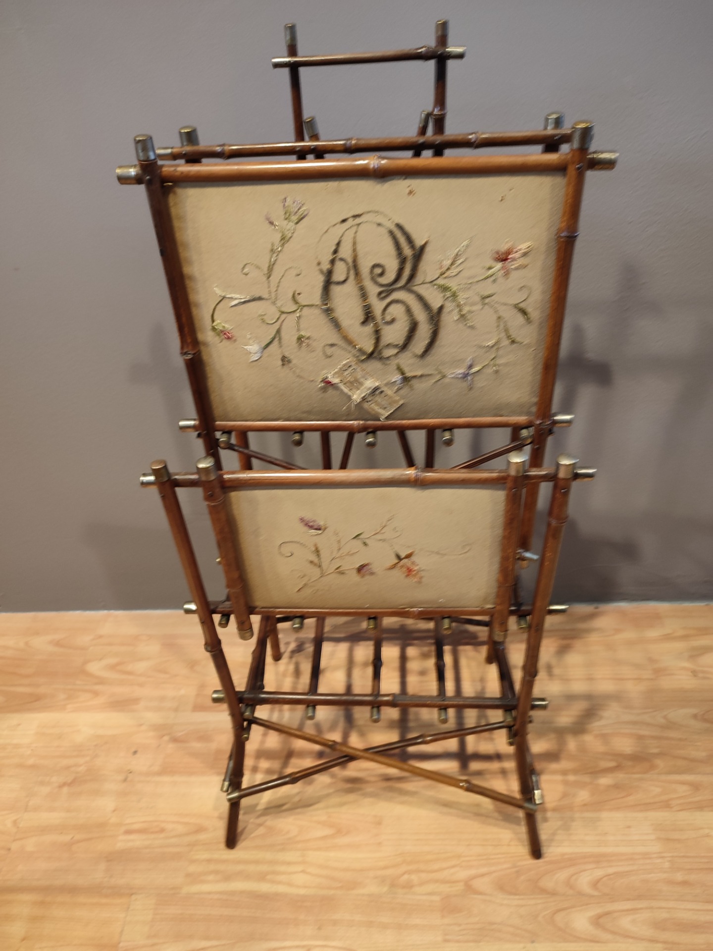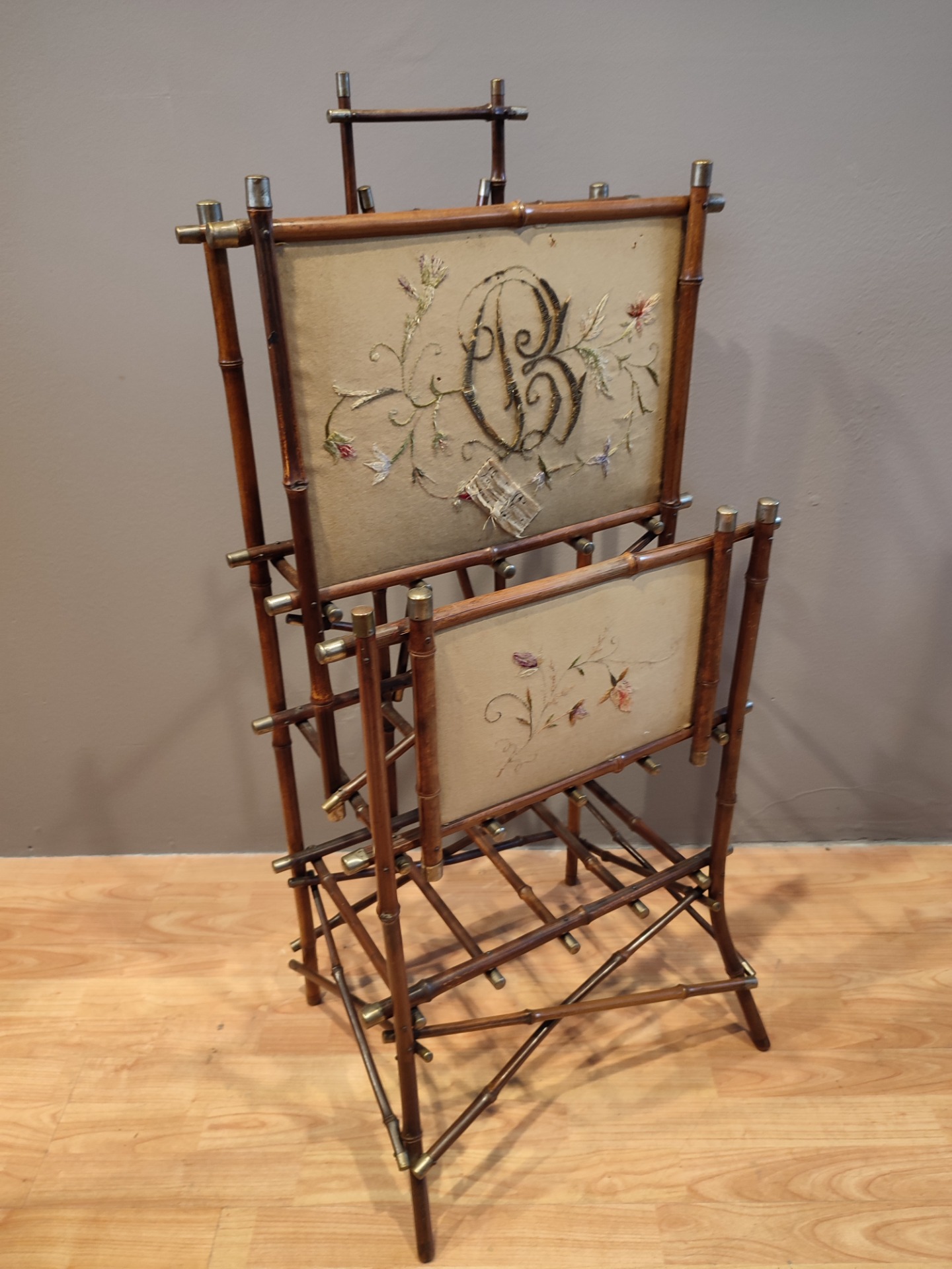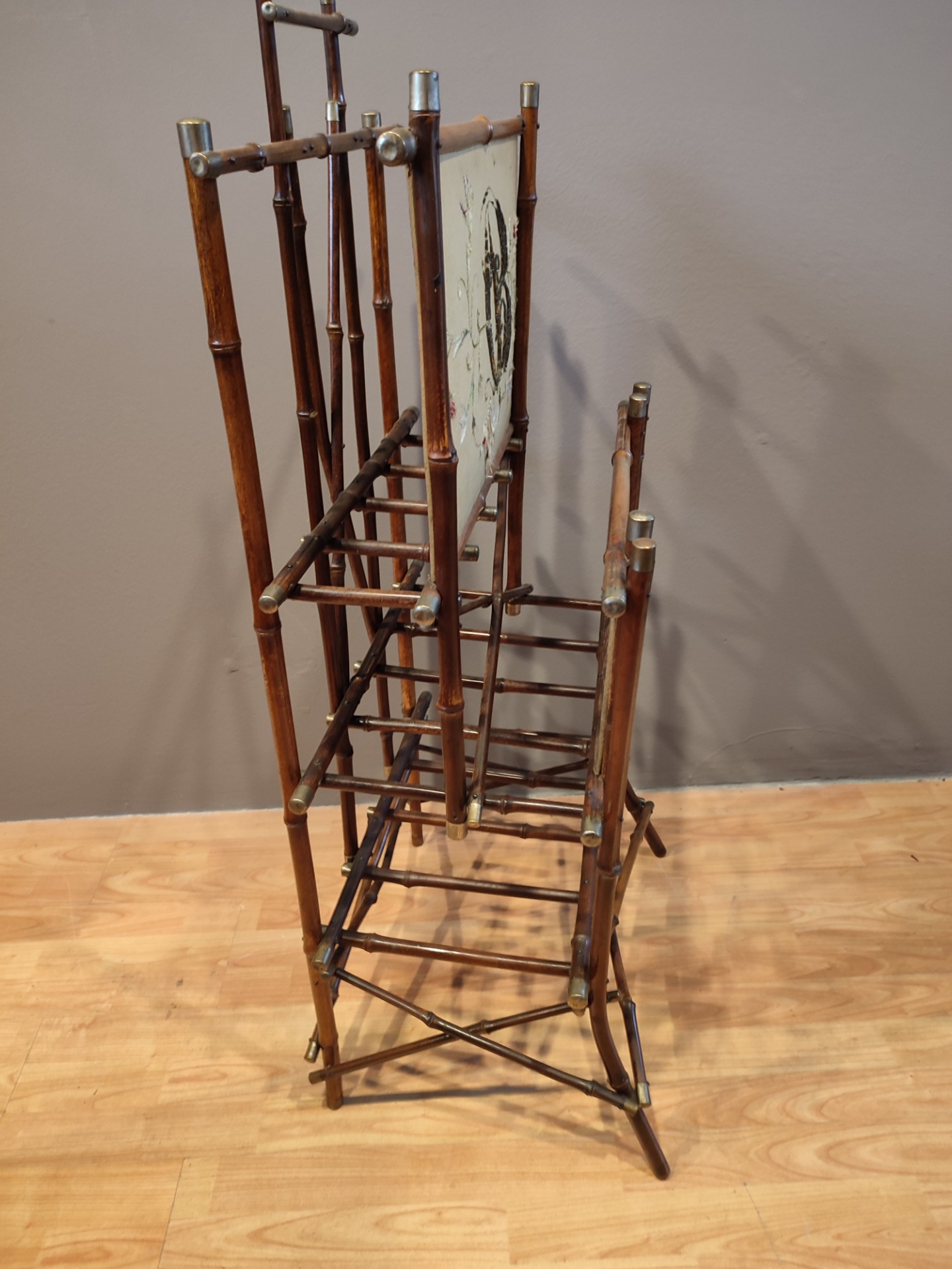 Porta riviste in Bambù con tessuto e ricamo.Usure dovuti all epoca. Miss : H 110 P 40 L 52 Siamo a vostra disposizione per informazioni o foto
