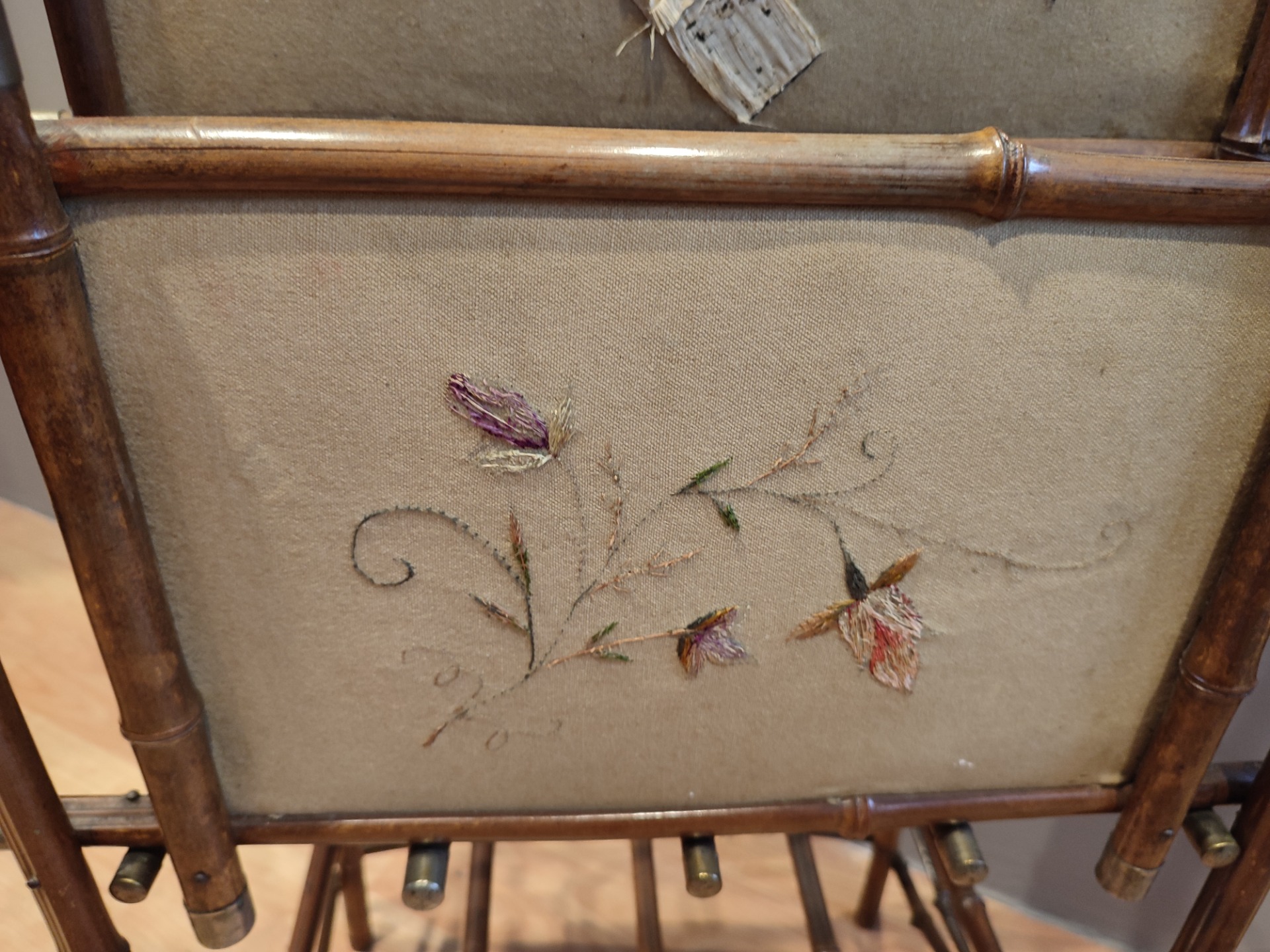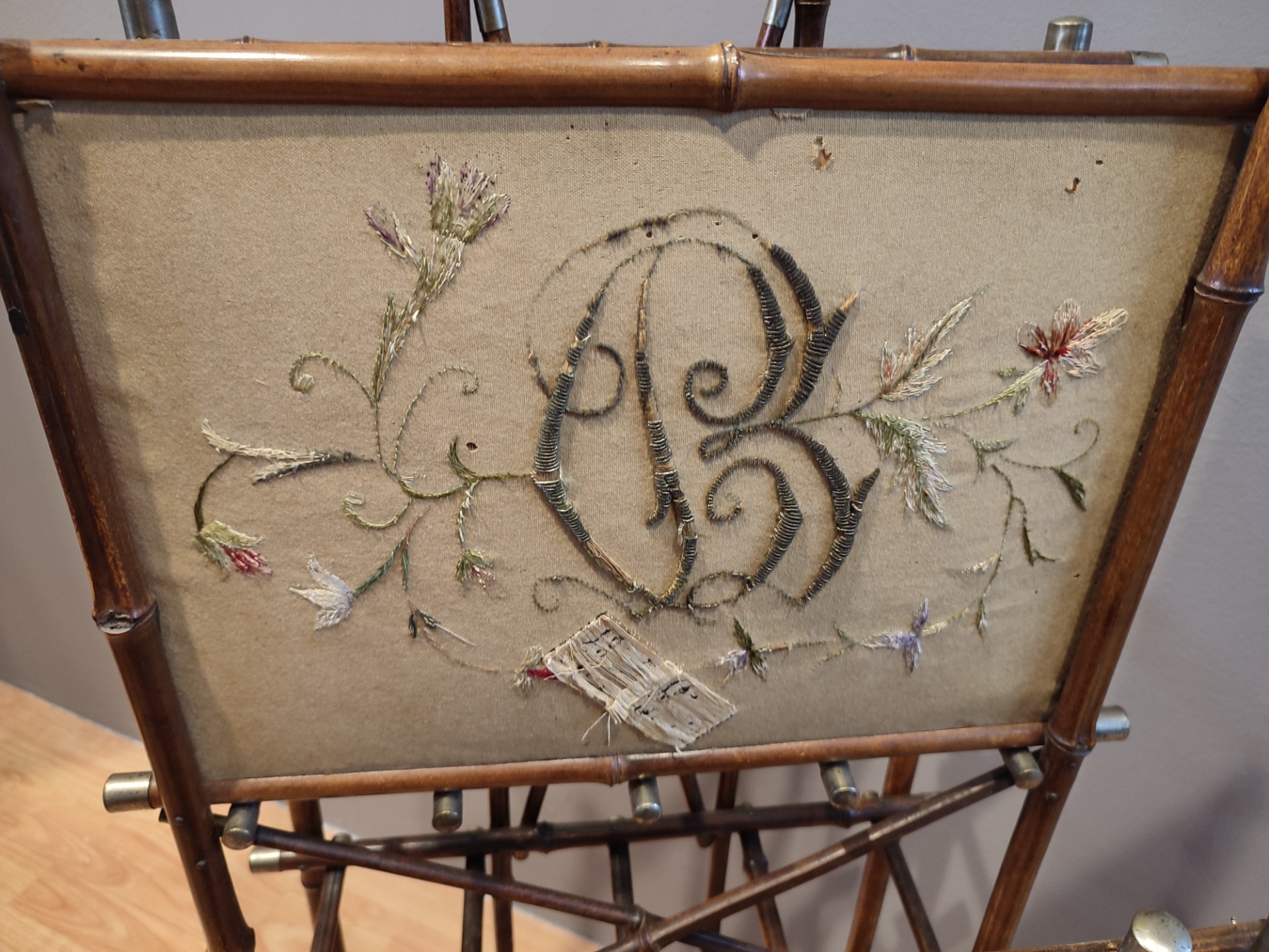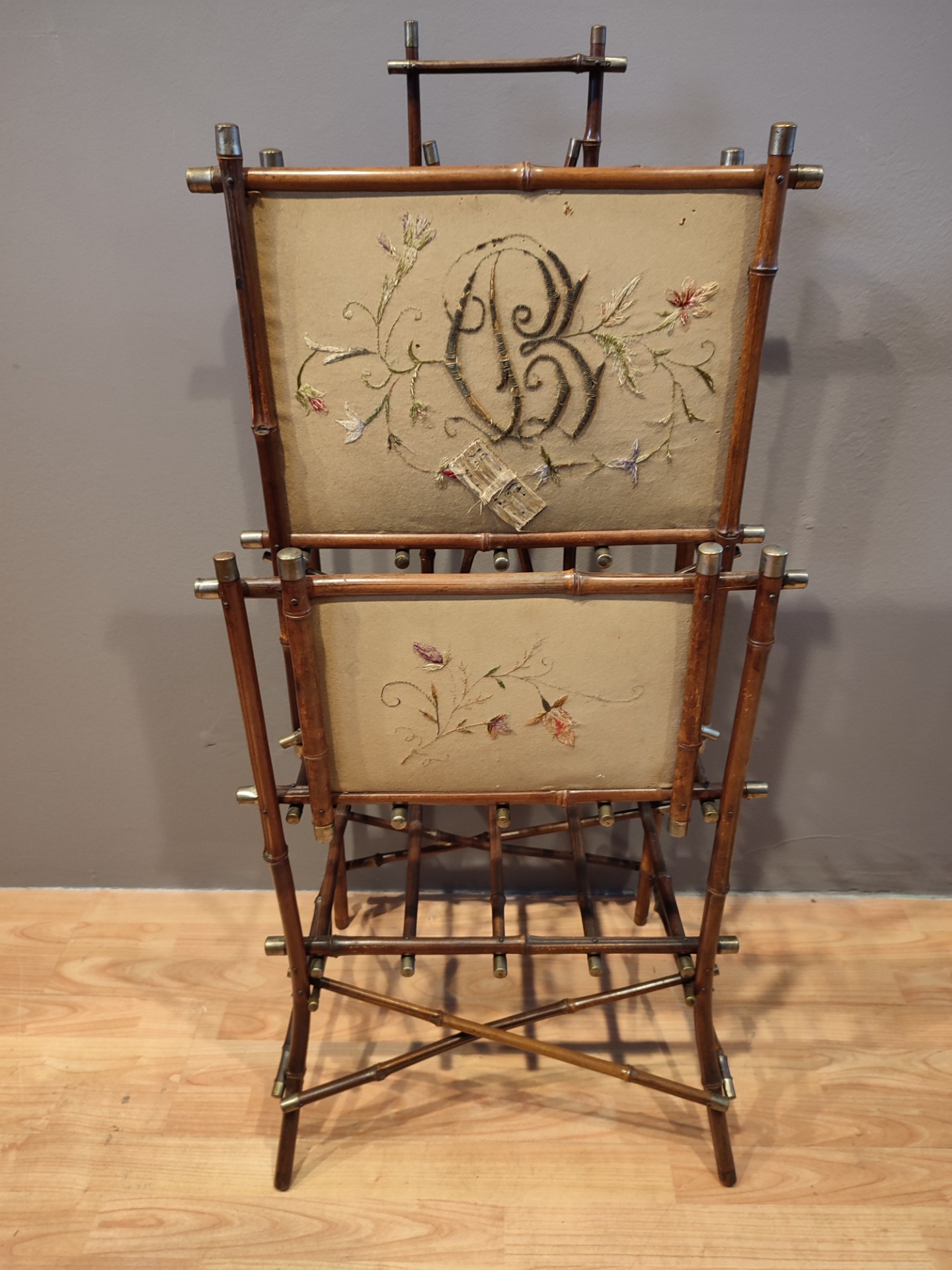 Porta riviste in Bambù con tessuto e ricamo.Usure dovuti all epoca. Miss : H 110 P 40 L 52 Siamo a vostra disposizione per informazioni o foto