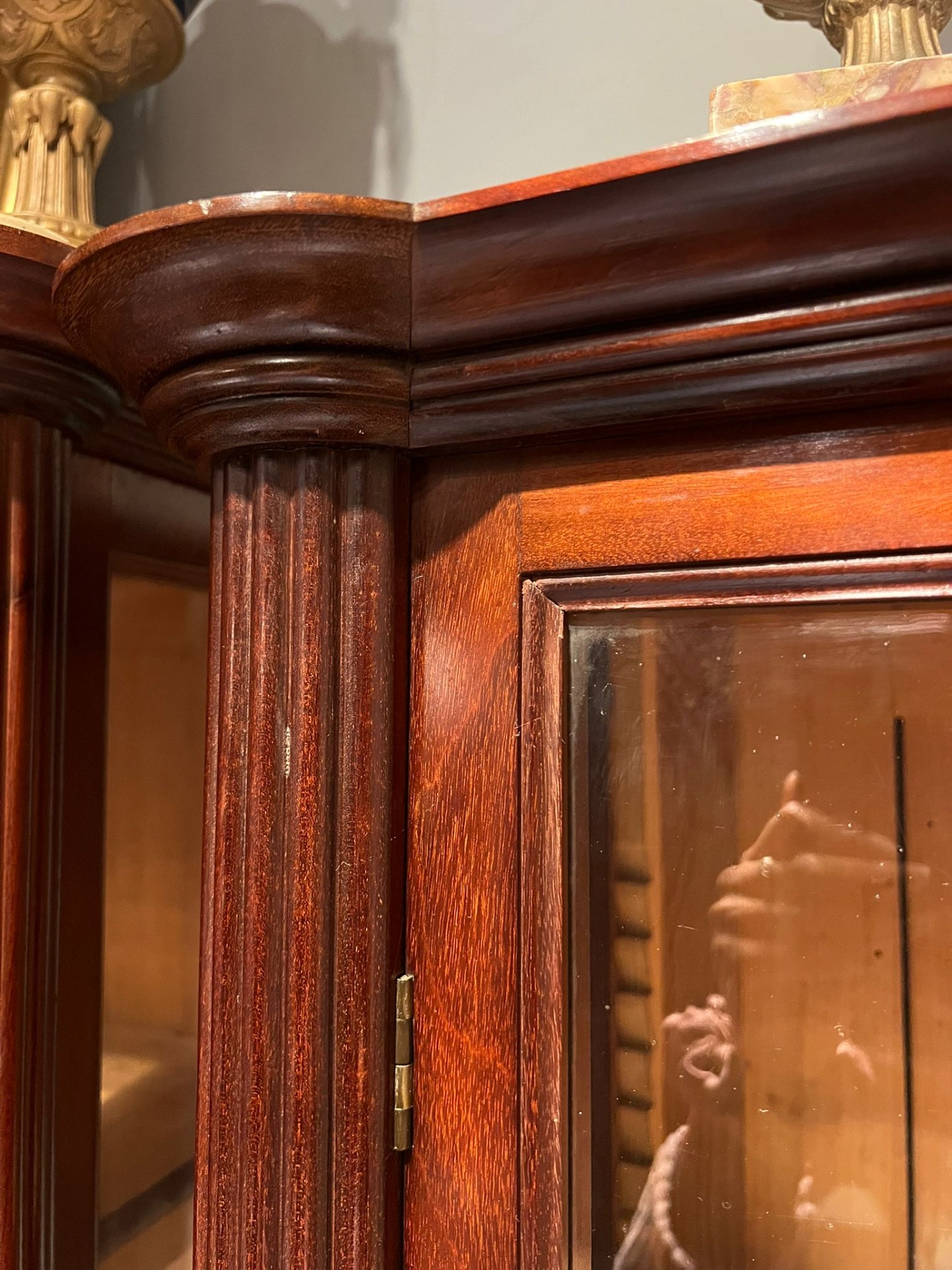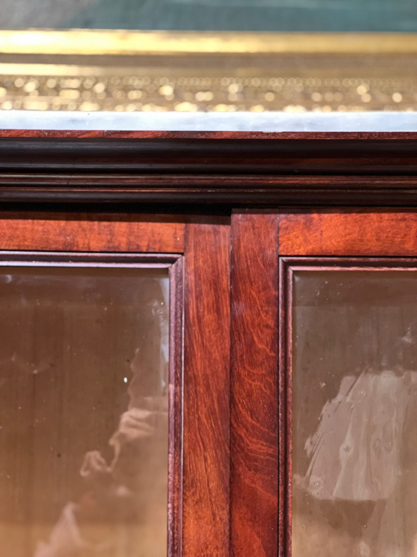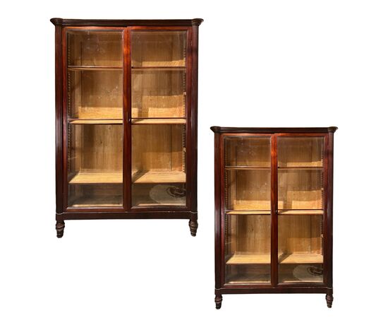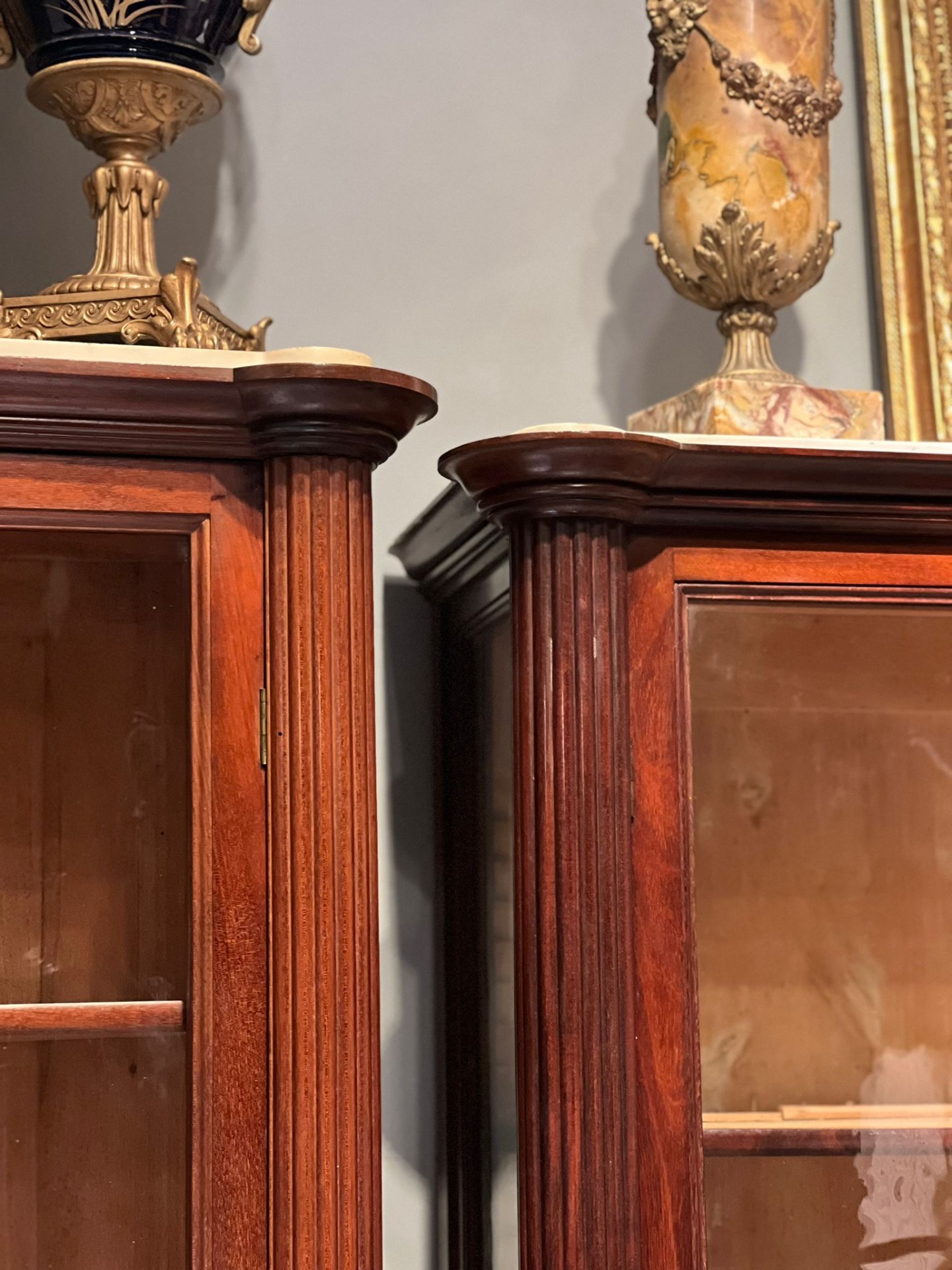 Elegante coppia di vetrine in mogano con piano in marmo di carrara, 1830-1840, Livorno. Il mobile presenta sui pilastri due colonne rastremate e due ante vetrate con vetri dell'epoca . I piedi sono costituiti da "cipolle" finemente tornite.