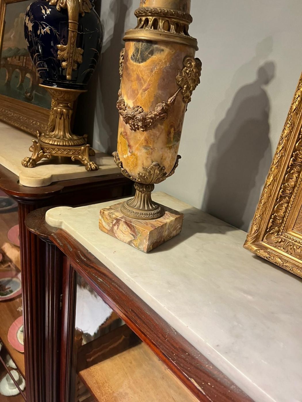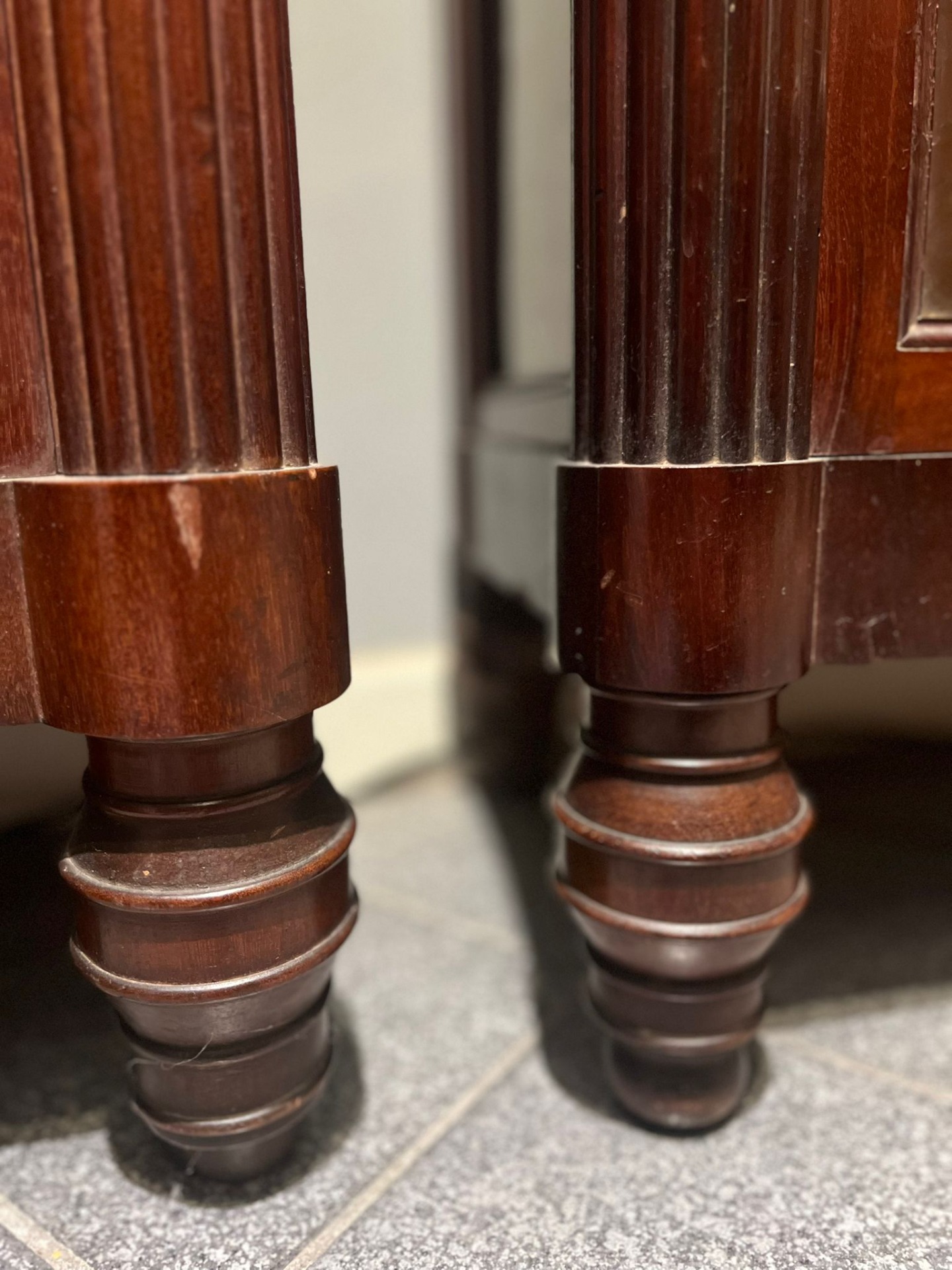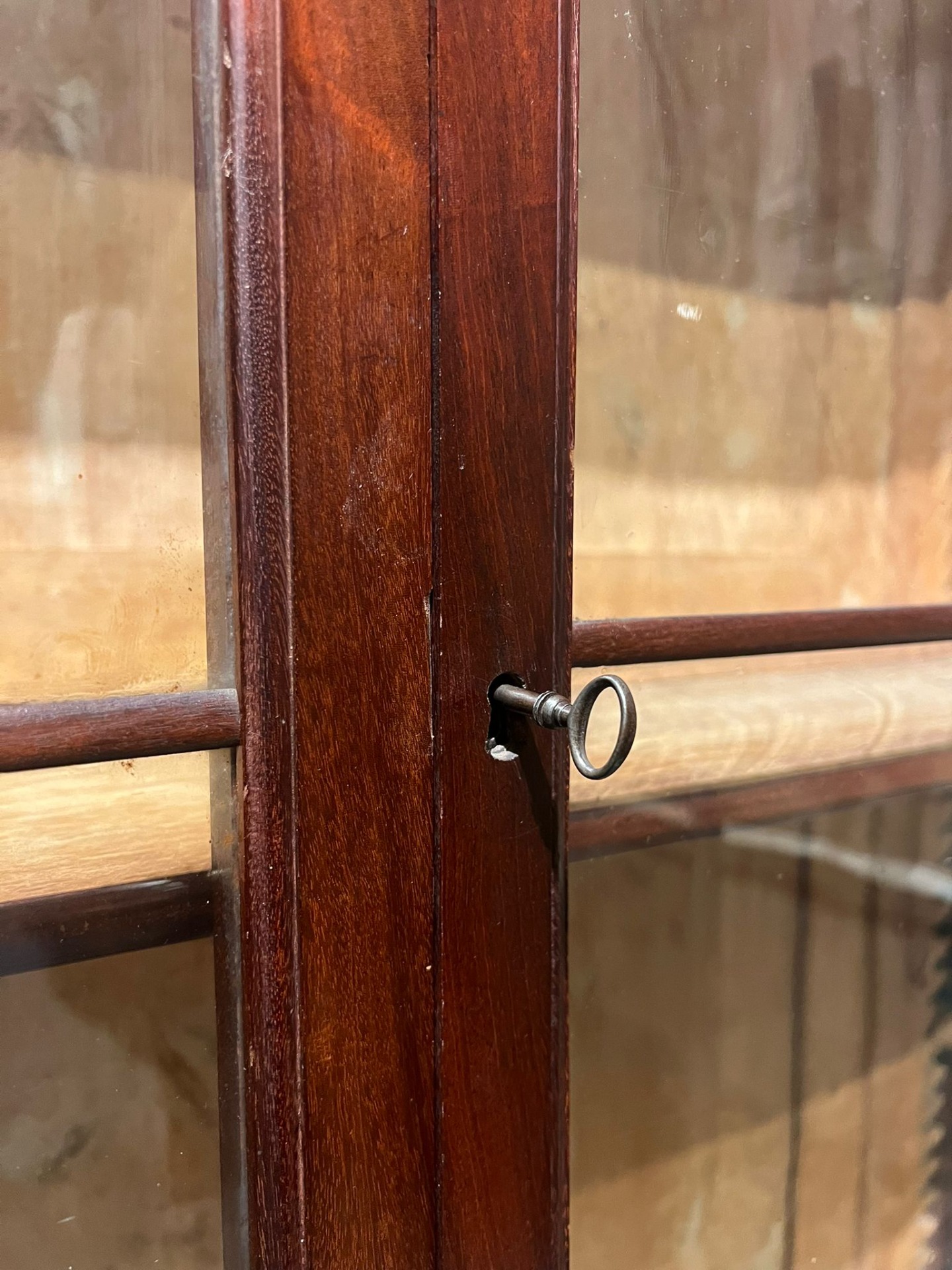 Elegante coppia di vetrine in mogano con piano in marmo di carrara, 1830-1840, Livorno. Il mobile presenta sui pilastri due colonne rastremate e due ante vetrate con vetri dell'epoca . I piedi sono costituiti da "cipolle" finemente tornite.