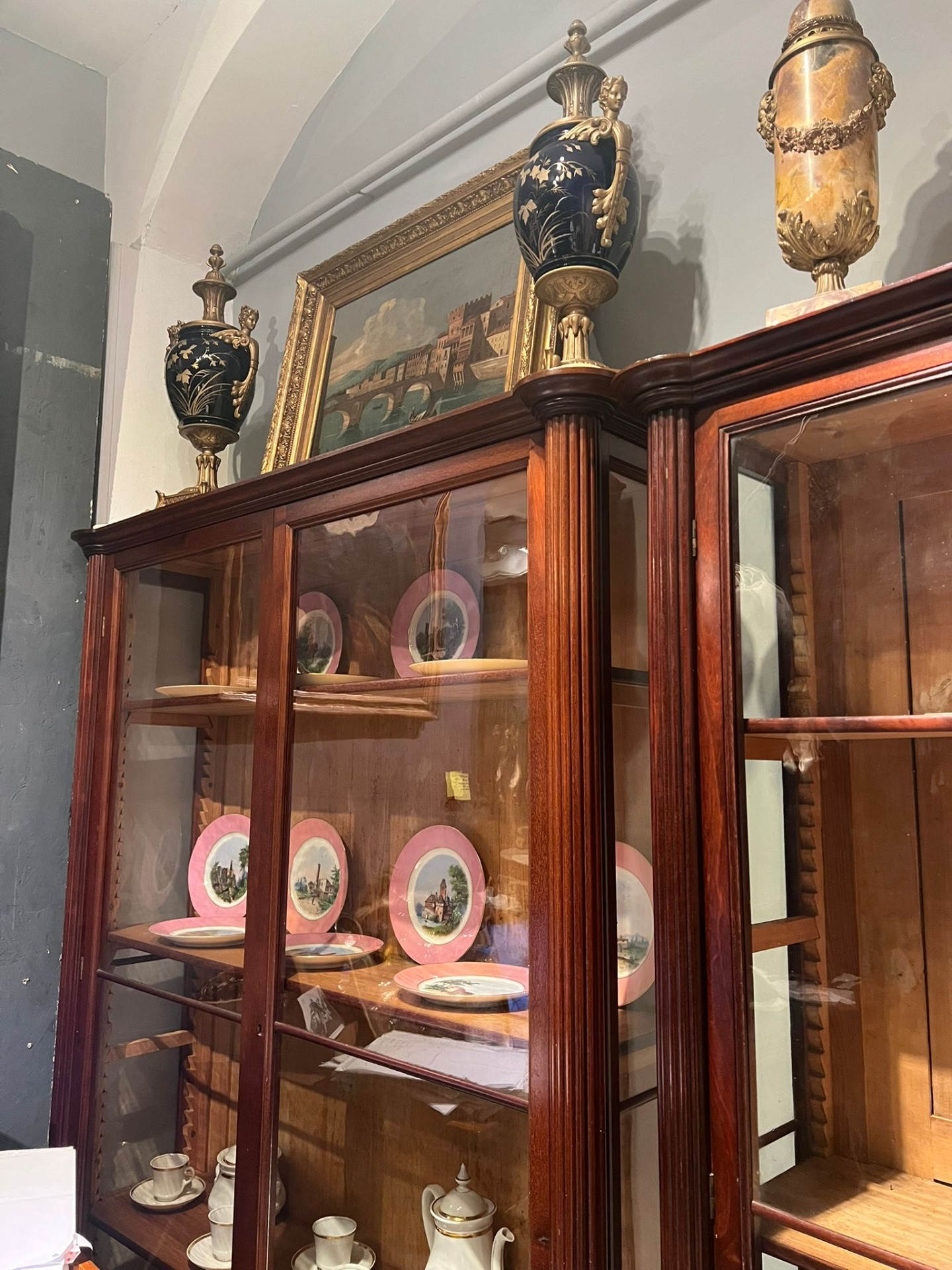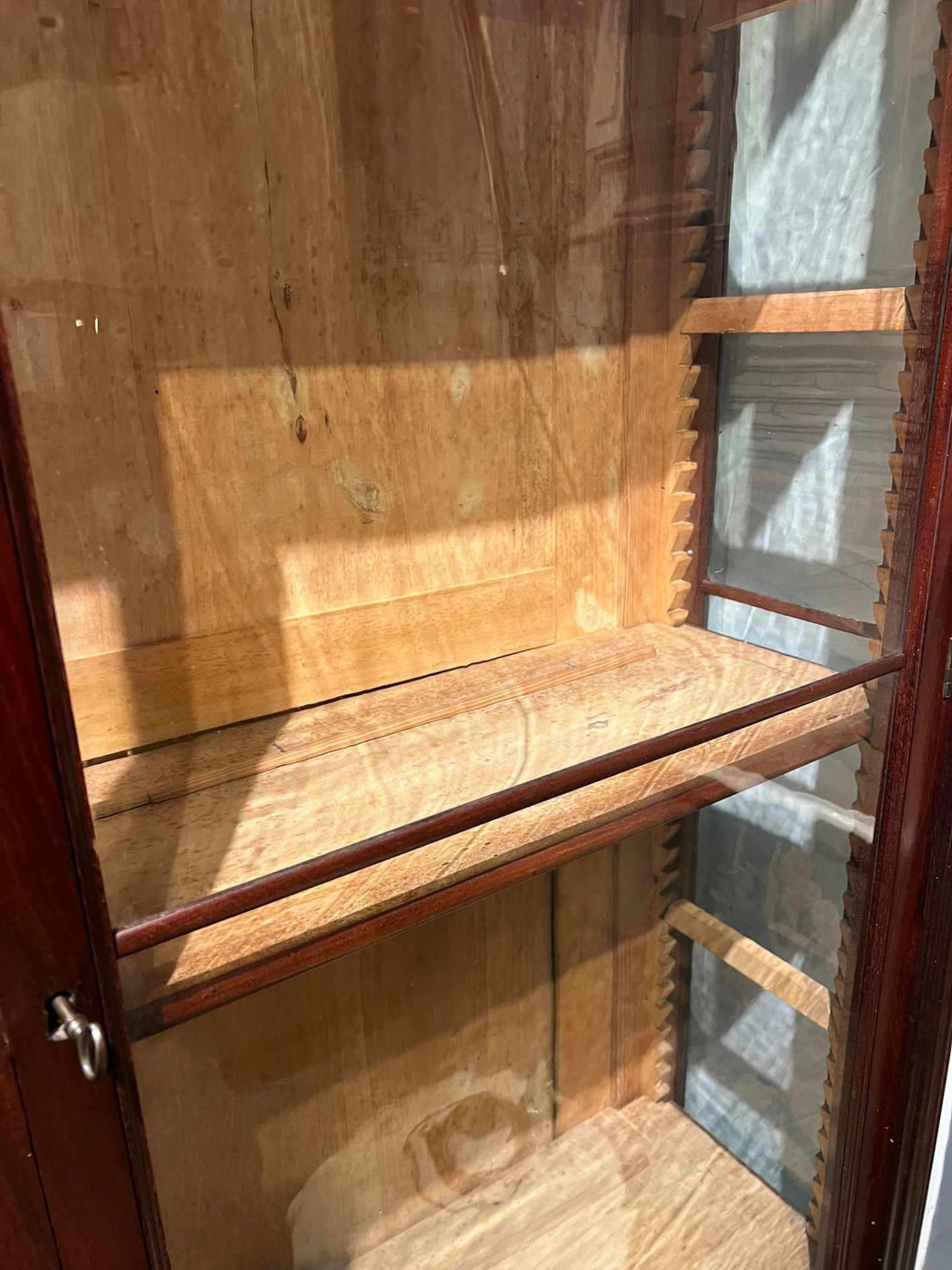 L'interno presenta ripiani (lastronati in mogano sullo spessore) regolabili in altezza, che permettono una funzionale esposizione di oggetti, porcellane o collezioni. Oppure possono essere usate anche come librerie.