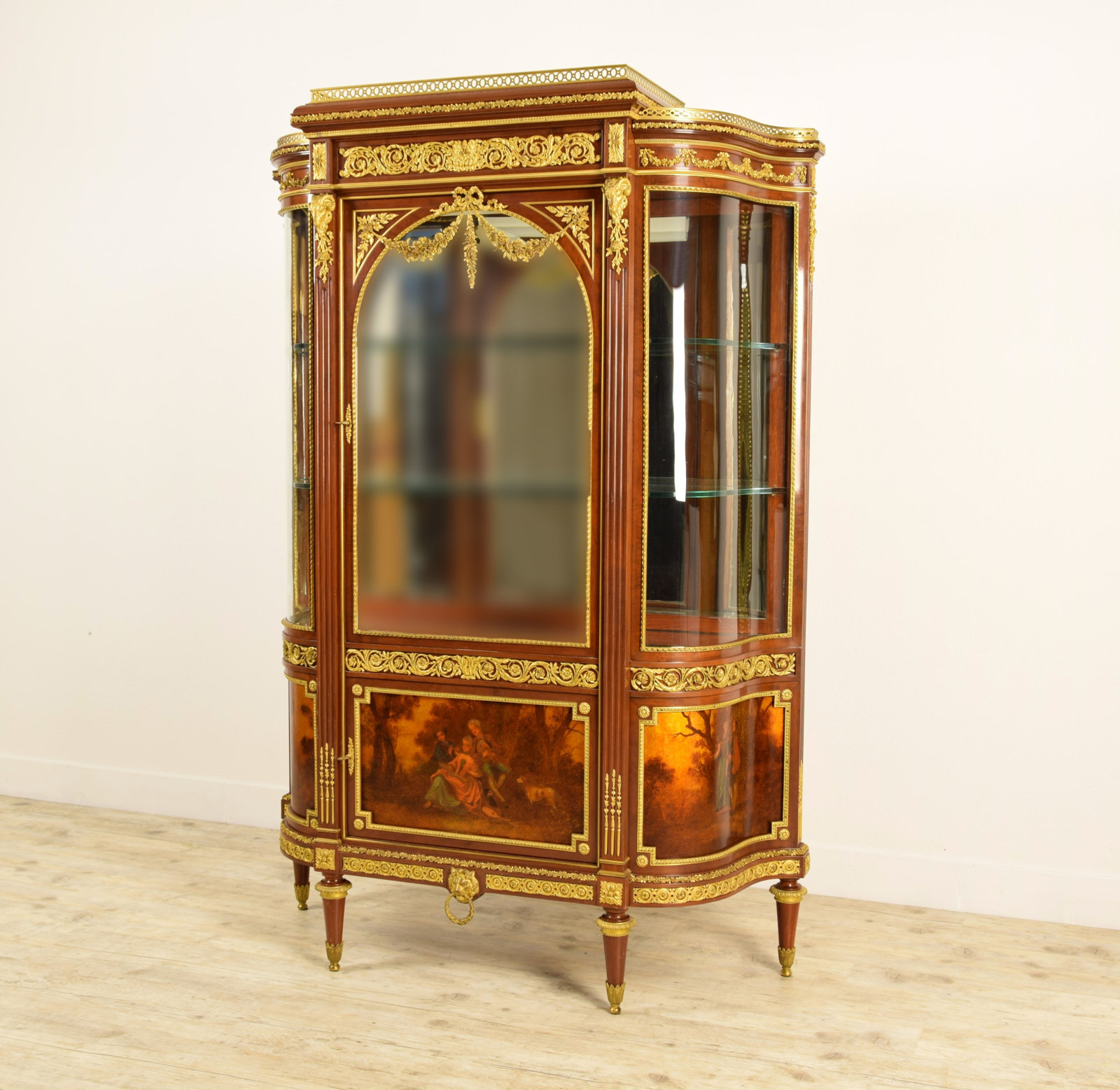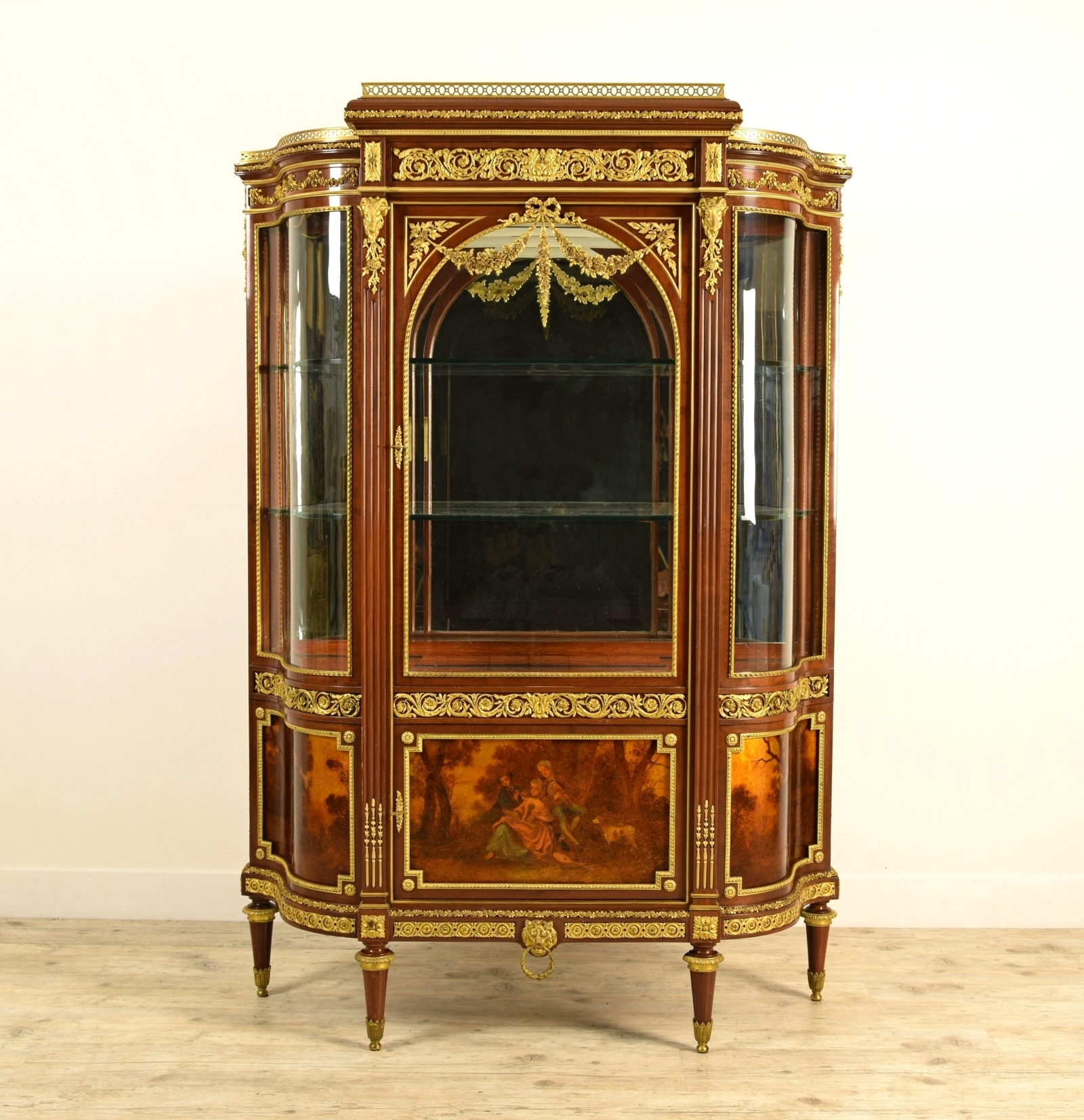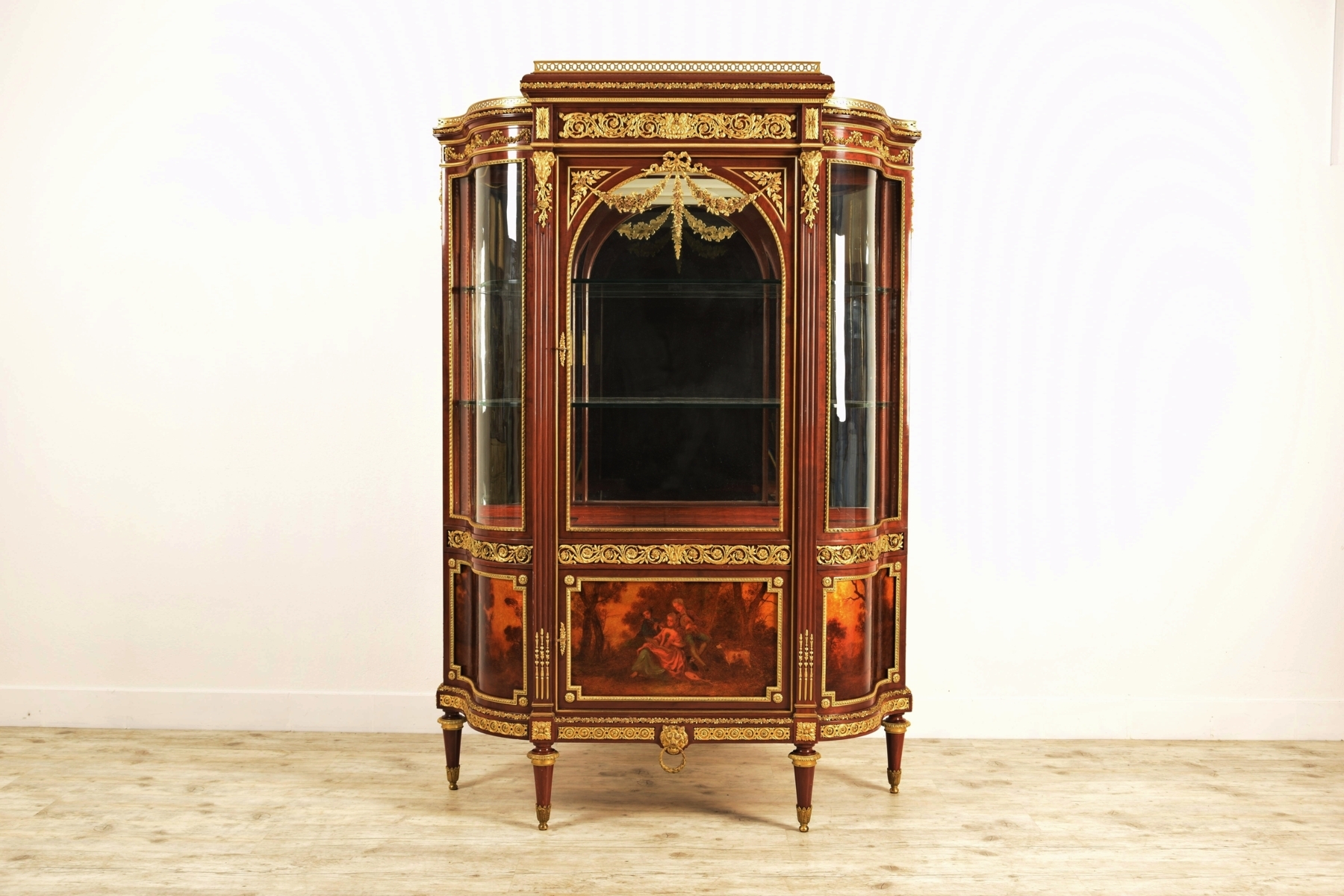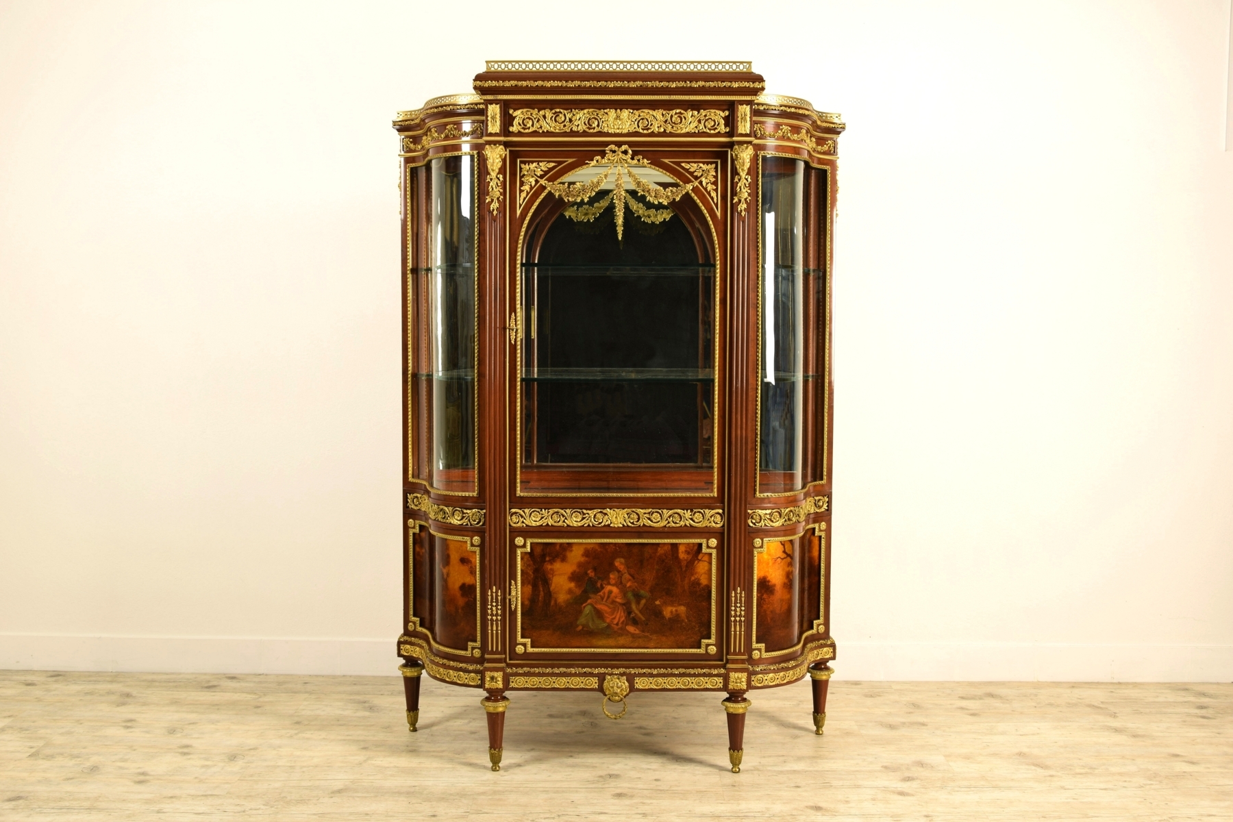 La vetrina si compone di una parte superiore con un’anta a vetro nella zona centrale e due vetri che seguono il movimento mosso dei fianchi. Due ripiani in vetro e piano di fondo in specchio. La parte inferiore presenta un’anta frontalmente e due pannelli laterali mossi. Le tre porzioni lignee sono decorate con pitture a vernis Martin. Il vernis Martin è una laccatura inventata in Francia nel XVIII secolo dai fratelli Martin, in concorrenza con i pannelli laccati cinesi. Lo stile Luigi XV, diffuso all’epoca, aveva modificato il profilo dei mobili, rendendoli mossi o bombati, per cui i pannelli squadrati cinesi non erano usufruibili. Questo tipo di verniciatura invece aveva il vantaggio di essere utilizzabile sopra superfici lisce o bombate. La tecnica fu messa a punto nel 1728 dai fratelli Martin che ne detennero per venti anni il monopolio. La moda delle vernis Martin si protrasse anche nell'Ottocento ed è caratterizzata da soggetti quali paesaggi arcadici o scene galanti ispirate ai dipinti di Jean Antoine Watteau (Valenciennes, 10 ottobre 1684 – Nogent-sur-Marne, 18 luglio 1721) o François Boucher (Parigi, 29 settembre 1703 – Parigi, 30 maggio 1770).