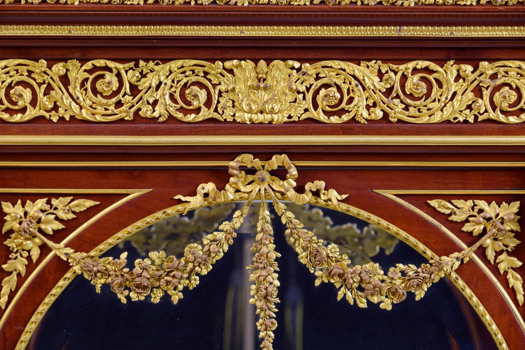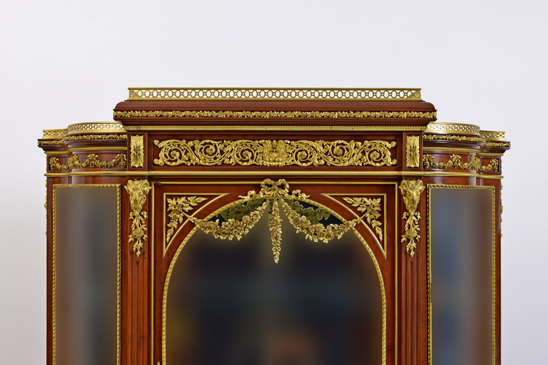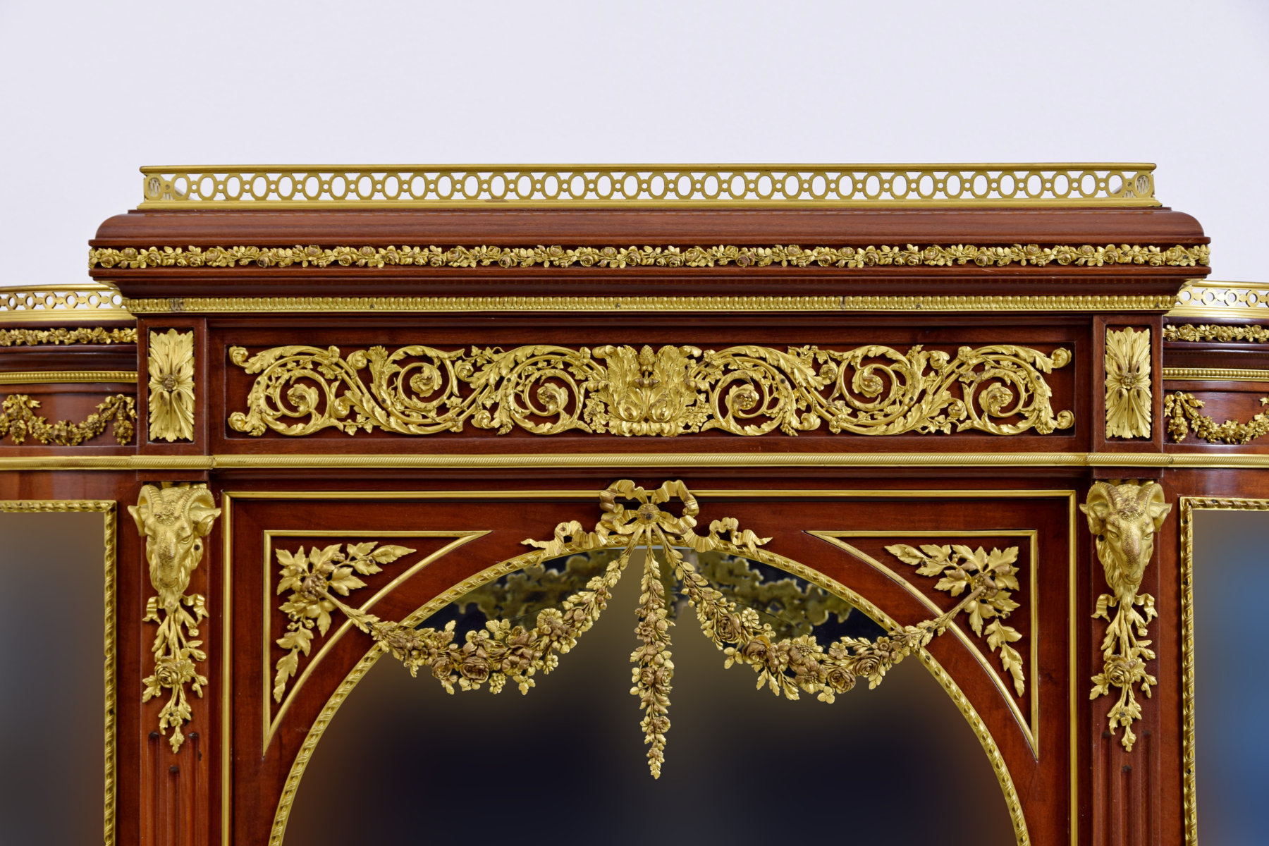 Il mobile è impreziosito da decori in bronzo dorato di pregevole cesello. Presenta dettagli, di pieno gusto Luigi XVI, con foglie d’acanto e girali fogliacee, festoni e ghirlande di fiori unite da leggiadri fiocchi e nastri. Nella parte sommitale e centrale figurano due teste di ariete mentre in basso, al centro, una testa leonina tiene tra le fauci una corona di alloro. Lungo tutto il mobile corrono raffinate riserve in bronzo cesellate con motivi geometrici, floreali e a palmette. La parte sommitale è finita da una cornice a ringhiera, sempre in bronzo dorato, traforata con motivi geometrici a ovali. Grande attenzione per i singoli dettagli.
