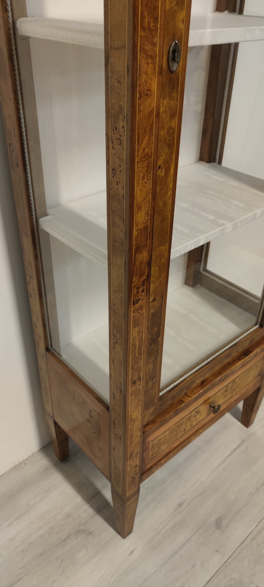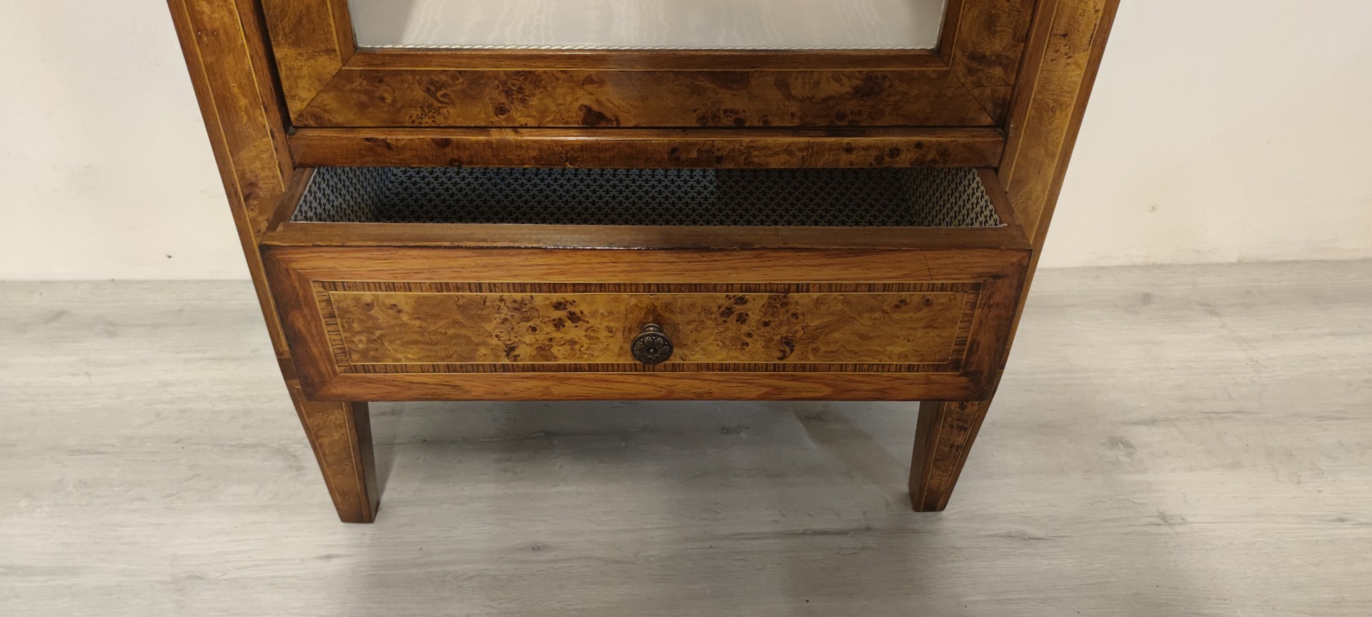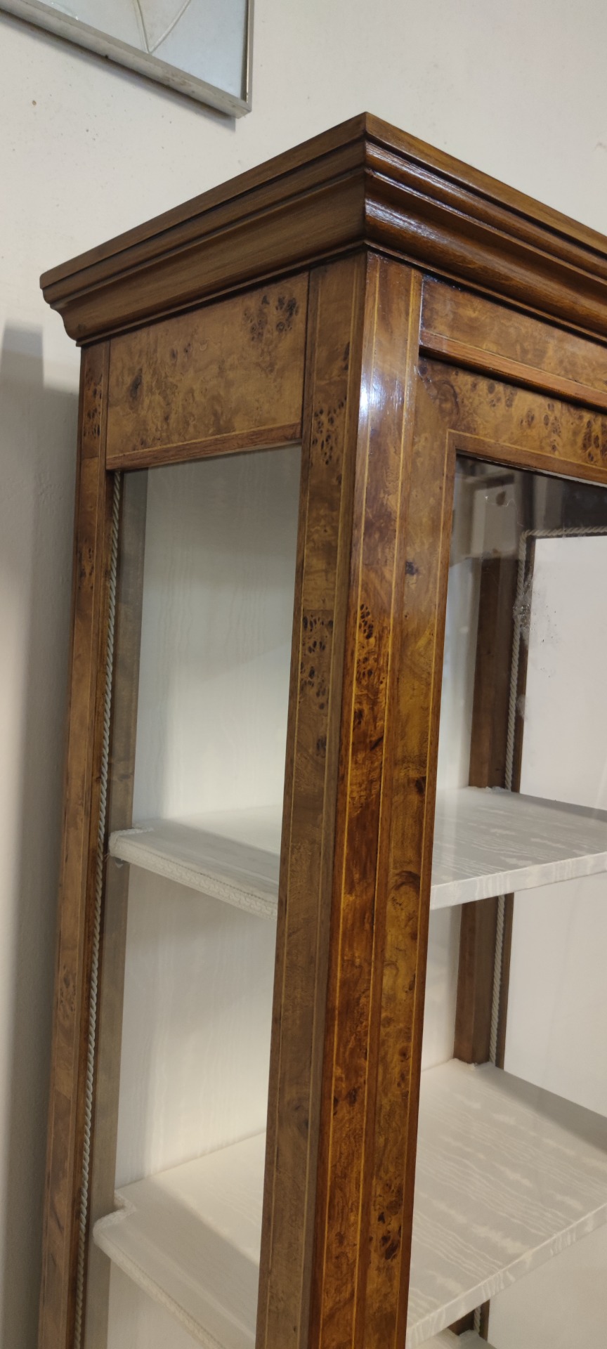 VerTetrina lombarda. In radiche di frassino con filetto di ebano. Ripiani interni rivestiti in tessuto. Misura la larghezza settanta profondità quaranta altezza due metri epoca primi 900
