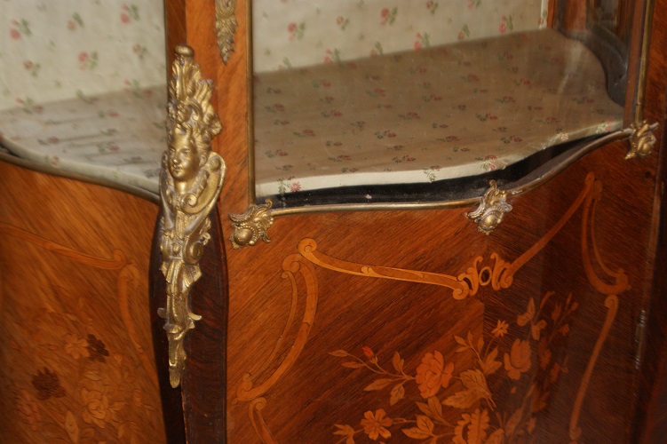 Elegantissima vetrinetta francese della seconda metà del 1800, stile Luigi XV, in legno di palissandro e bois de rose. Presenta 1 anta, a vetro nel corpo superiore e chiusa in quello inferiore con ricchi motivi di intarsio, applicazioni in bronzo dorato e laterali curvi con vetro ed intarsi.