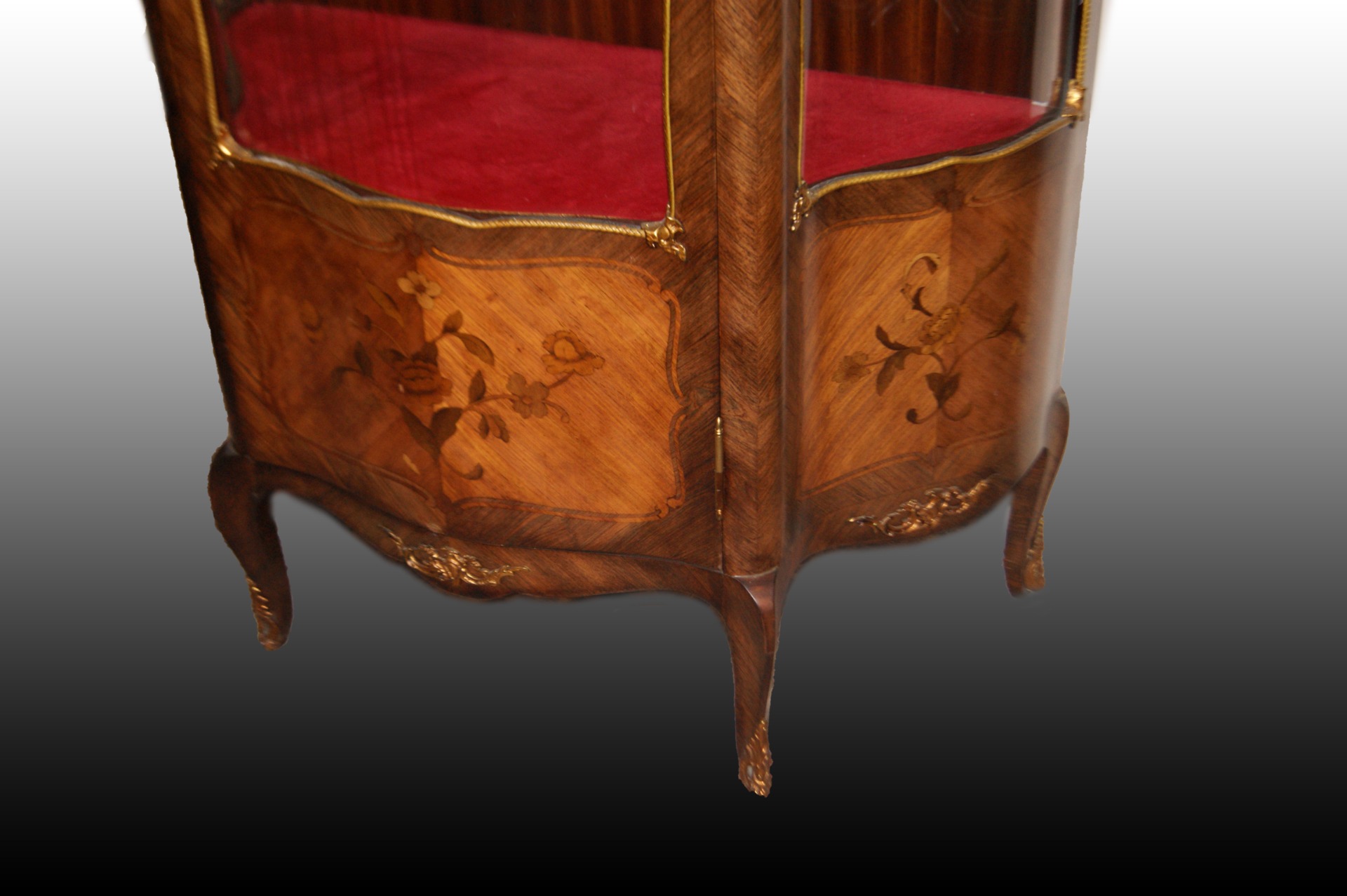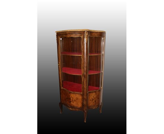 Vetrina francese stile Luigi XV del 1800 con intarsi e bronzi