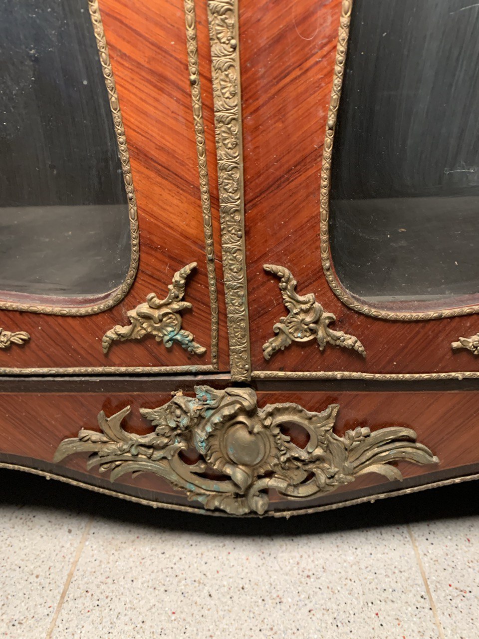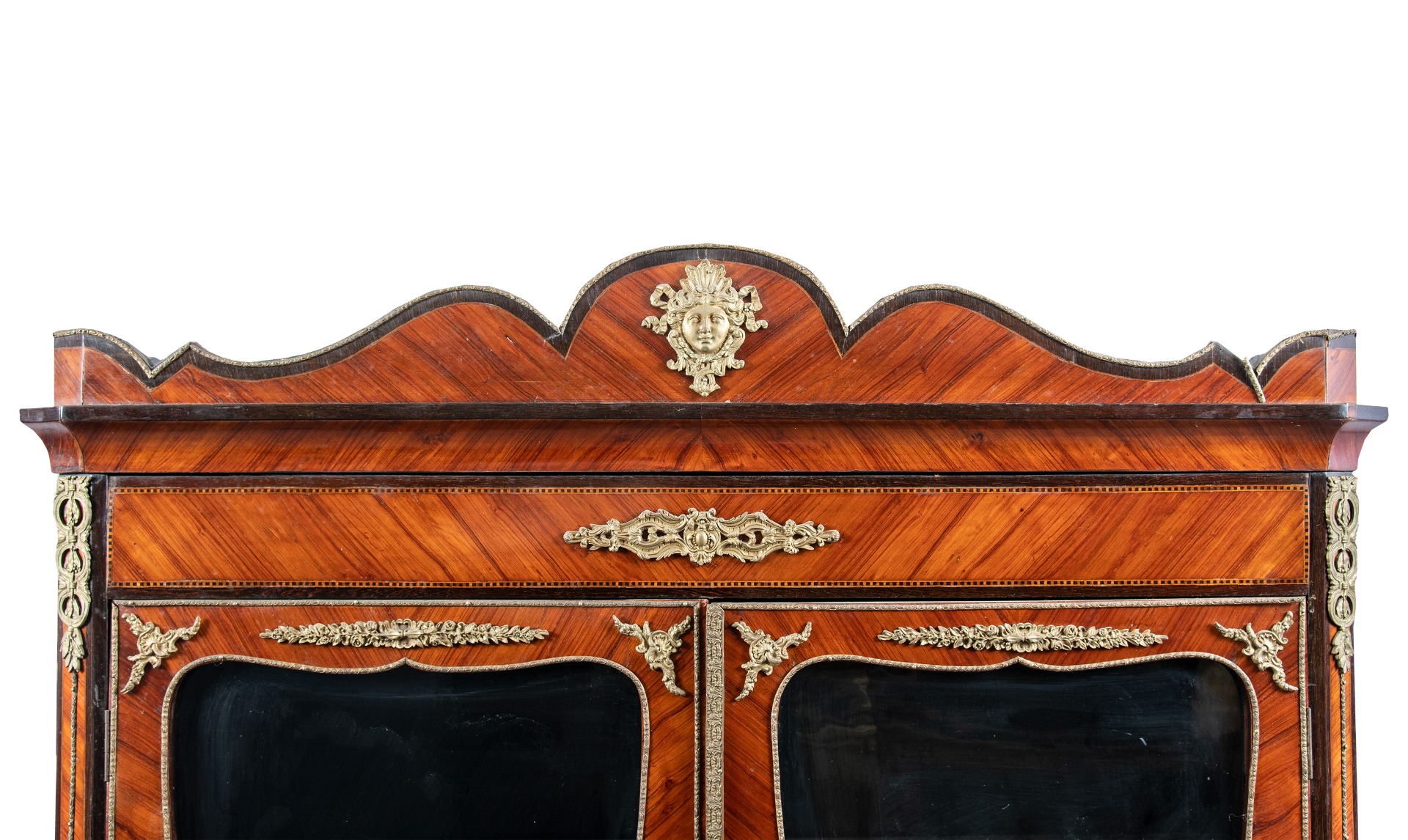 Realizzata con forma architettonica, interamente impiallacciata in legni vari con applicazioni in bronzo dorato (piccole rotture e mancanze, rottura di un vetro).