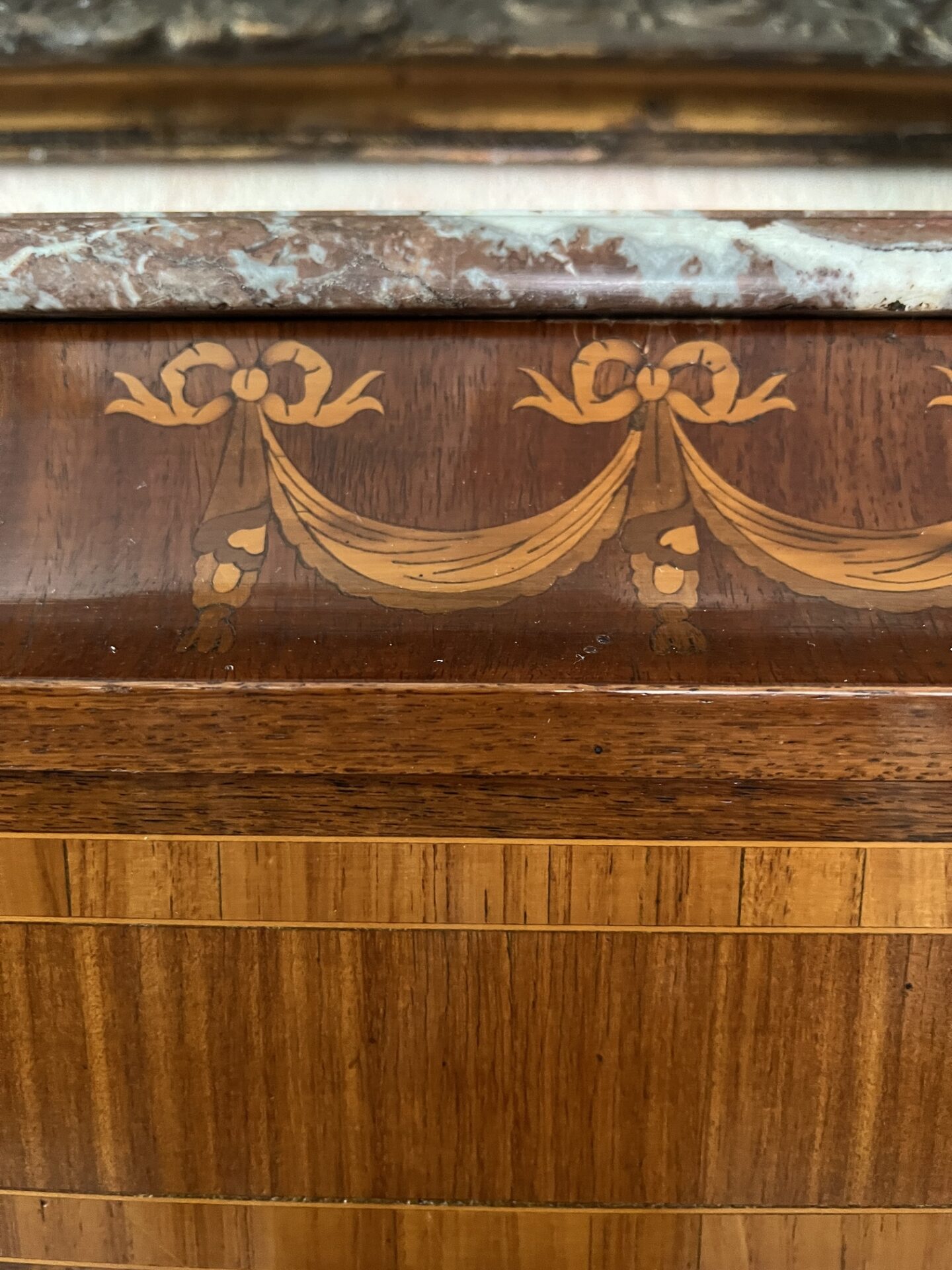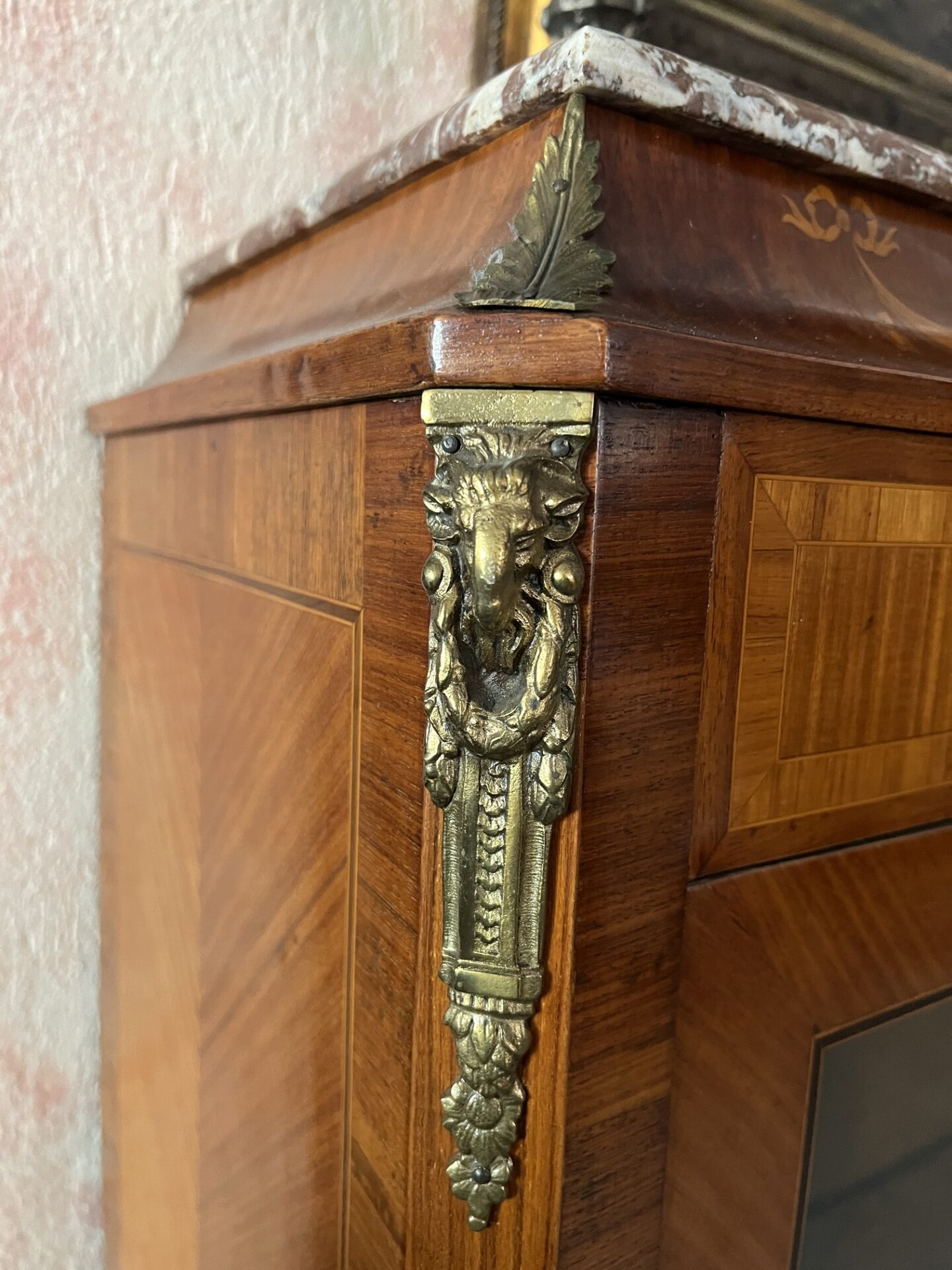 in radica di noce, con intarsi, bronzi e marmo autentici.