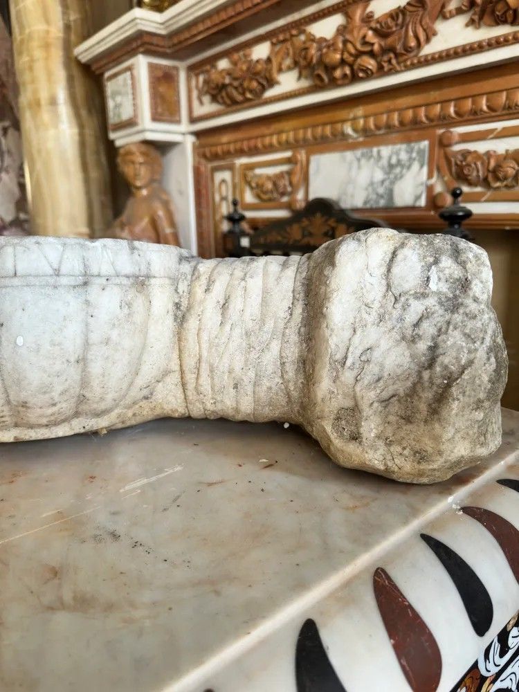 Questa acquasantiera in marmo bianco, proveniente dall’Italia del XVII secolo, racconta quattrocento anni di fede, arte e maestria scultorea. L’oggetto, probabilmente collocato all’ingresso di una cappella privata o di un palazzo nobiliare, unisce la solennità liturgica al gusto decorativo dello stile Luigi XIV, allora di grande moda lungo la penisola.Il bacino è scolpito a conchiglia scanalata, simbolo di purificazione, con pareti spesse e orlo sagomato recante un’iscrizione latina ancora leggibile in parte. Sotto la conchiglia, quasi a sorreggerla in un gesto rituale, spicca una mano aperta finemente modellata: le dita assottigliate si fondono con il supporto cilindrico che si innesta, tramite un blocco quadrangolare irregolare, direttamente alla parete. Il retro conserva la superficie di cava, garanzia di autenticità.Materiale: marmo bianco con leggera patina ambrata dovuta al tempo.Epoca: XVII secolo (ca. 1600-1650).Stile: Barocco italiano / Luigi XIV.Dimensioni: H 15 cm – L 28 cm – P 53 cm – Ø 28 cm.Condizioni: usura coerente con l’età, piccole mancanze e concrezioni calcaree che esaltano la patina originale.La resa plastica dei godroni, l’energia della mano e la qualità del marmo testimoniano l’abilità di un laboratorio scultoreo dell’Italia centrale, forse toscano o laziale. Oggi la pièce può essere:ripristinata come fontanella da giardino o lavabo d’ingresso;installata come scultura murale in interni di charme;utilizzata come elegante vaso da piante pensili per dare carattere a logge e cortili.Ogni imperfezione è parte del suo fascino: toccandone la superficie si percepisce la storia di generazioni che hanno attinto acqua benedetta da questa piccola opera d’arte. Un’opportunità irripetibile per collezionisti, interior designer e amanti dell’arte barocca italiana.Stile: Luigi XIV Materiale: Marmo/PietraAltezza (cm): 15Larghezza (cm): 28Profondità (cm): 53Diametro: 28Epoca: XVII Secolo - 1600