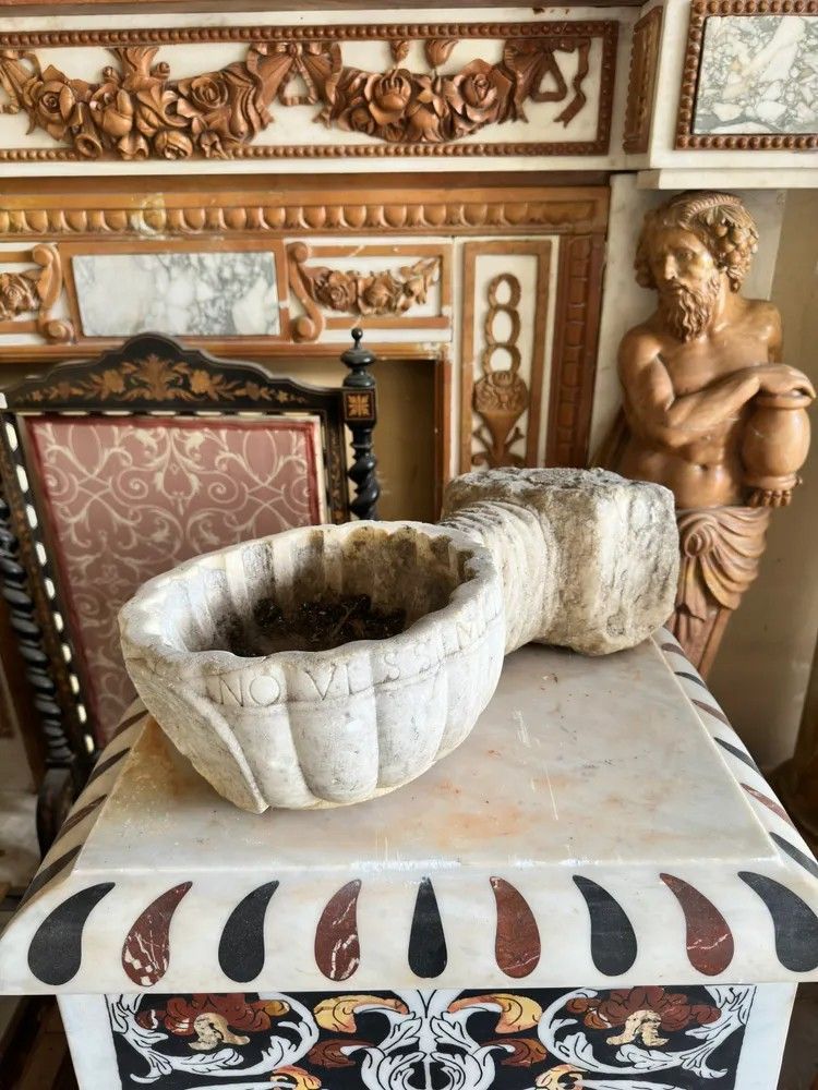 Questa acquasantiera in marmo bianco, proveniente dall’Italia del XVII secolo, racconta quattrocento anni di fede, arte e maestria scultorea. L’oggetto, probabilmente collocato all’ingresso di una cappella privata o di un palazzo nobiliare, unisce la solennità liturgica al gusto decorativo dello stile Luigi XIV, allora di grande moda lungo la penisola.Il bacino è scolpito a conchiglia scanalata, simbolo di purificazione, con pareti spesse e orlo sagomato recante un’iscrizione latina ancora leggibile in parte. Sotto la conchiglia, quasi a sorreggerla in un gesto rituale, spicca una mano aperta finemente modellata: le dita assottigliate si fondono con il supporto cilindrico che si innesta, tramite un blocco quadrangolare irregolare, direttamente alla parete. Il retro conserva la superficie di cava, garanzia di autenticità.Materiale: marmo bianco con leggera patina ambrata dovuta al tempo.Epoca: XVII secolo (ca. 1600-1650).Stile: Barocco italiano / Luigi XIV.Dimensioni: H 15 cm – L 28 cm – P 53 cm – Ø 28 cm.Condizioni: usura coerente con l’età, piccole mancanze e concrezioni calcaree che esaltano la patina originale.La resa plastica dei godroni, l’energia della mano e la qualità del marmo testimoniano l’abilità di un laboratorio scultoreo dell’Italia centrale, forse toscano o laziale. Oggi la pièce può essere:ripristinata come fontanella da giardino o lavabo d’ingresso;installata come scultura murale in interni di charme;utilizzata come elegante vaso da piante pensili per dare carattere a logge e cortili.Ogni imperfezione è parte del suo fascino: toccandone la superficie si percepisce la storia di generazioni che hanno attinto acqua benedetta da questa piccola opera d’arte. Un’opportunità irripetibile per collezionisti, interior designer e amanti dell’arte barocca italiana.Stile: Luigi XIV Materiale: Marmo/PietraAltezza (cm): 15Larghezza (cm): 28Profondità (cm): 53Diametro: 28Epoca: XVII Secolo - 1600
