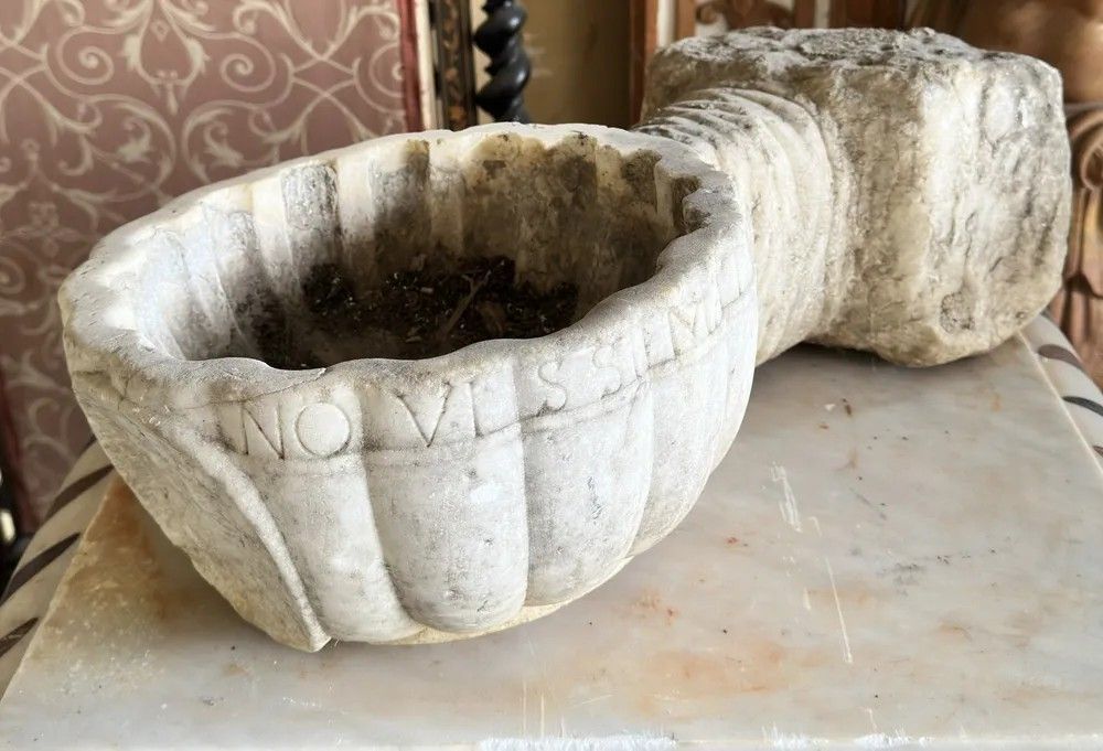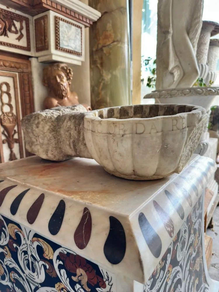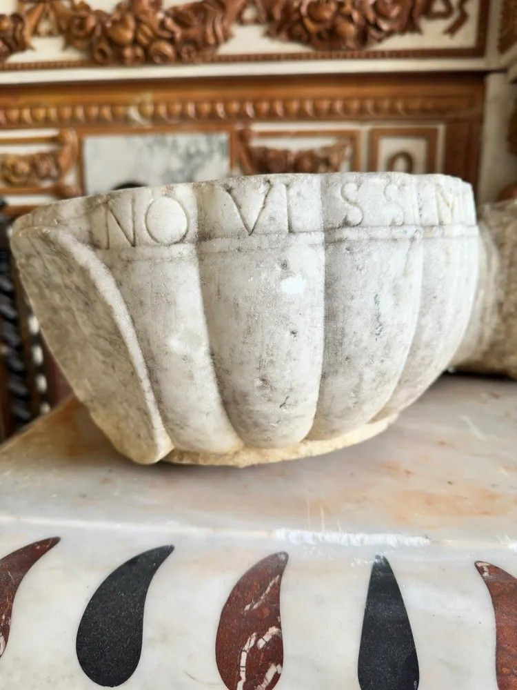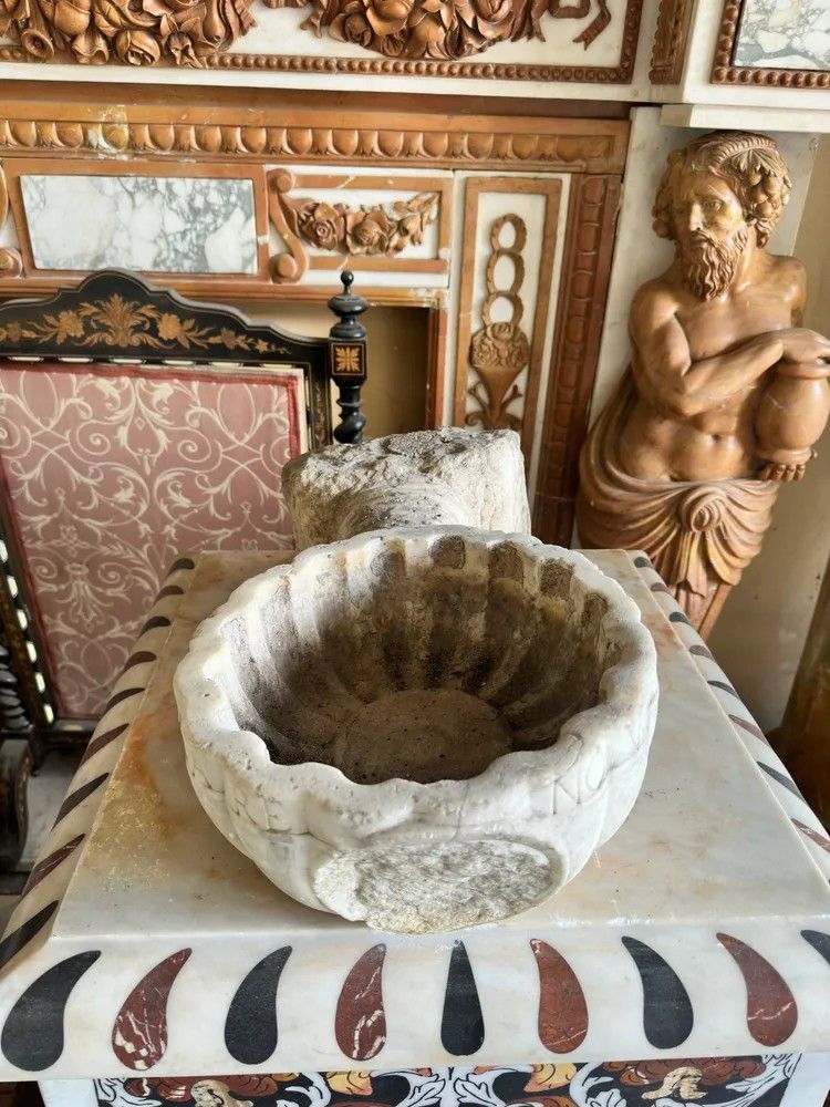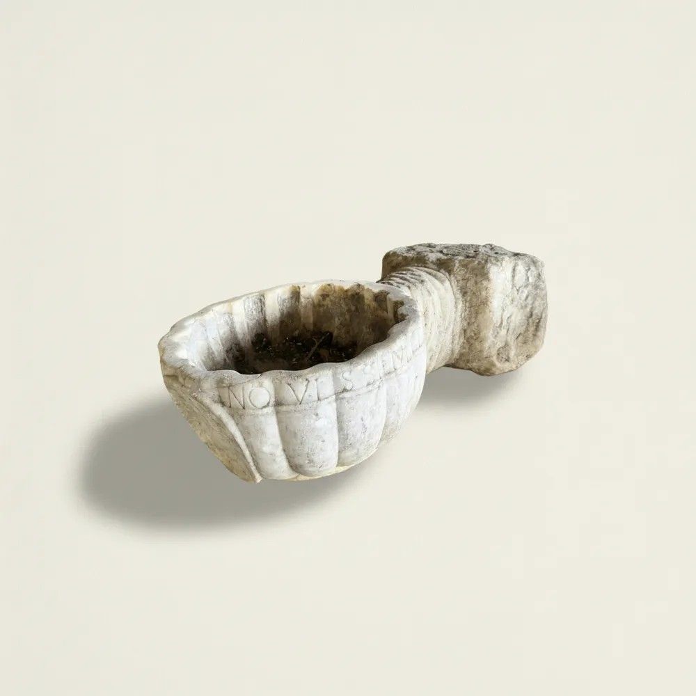 Questa acquasantiera in marmo bianco, proveniente dall’Italia del XVII secolo, racconta quattrocento anni di fede, arte e maestria scultorea. L’oggetto, probabilmente collocato all’ingresso di una cappella privata o di un palazzo nobiliare, unisce la solennità liturgica al gusto decorativo dello stile Luigi XIV, allora di grande moda lungo la penisola.Il bacino è scolpito a conchiglia scanalata, simbolo di purificazione, con pareti spesse e orlo sagomato recante un’iscrizione latina ancora leggibile in parte. Sotto la conchiglia, quasi a sorreggerla in un gesto rituale, spicca una mano aperta finemente modellata: le dita assottigliate si fondono con il supporto cilindrico che si innesta, tramite un blocco quadrangolare irregolare, direttamente alla parete. Il retro conserva la superficie di cava, garanzia di autenticità.Materiale: marmo bianco con leggera patina ambrata dovuta al tempo.Epoca: XVII secolo (ca. 1600-1650).Stile: Barocco italiano / Luigi XIV.Dimensioni: H 15 cm – L 28 cm – P 53 cm – Ø 28 cm.Condizioni: usura coerente con l’età, piccole mancanze e concrezioni calcaree che esaltano la patina originale.La resa plastica dei godroni, l’energia della mano e la qualità del marmo testimoniano l’abilità di un laboratorio scultoreo dell’Italia centrale, forse toscano o laziale. Oggi la pièce può essere:ripristinata come fontanella da giardino o lavabo d’ingresso;installata come scultura murale in interni di charme;utilizzata come elegante vaso da piante pensili per dare carattere a logge e cortili.Ogni imperfezione è parte del suo fascino: toccandone la superficie si percepisce la storia di generazioni che hanno attinto acqua benedetta da questa piccola opera d’arte. Un’opportunità irripetibile per collezionisti, interior designer e amanti dell’arte barocca italiana.Stile: Luigi XIV Materiale: Marmo/PietraAltezza (cm): 15Larghezza (cm): 28Profondità (cm): 53Diametro: 28Epoca: XVII Secolo - 1600