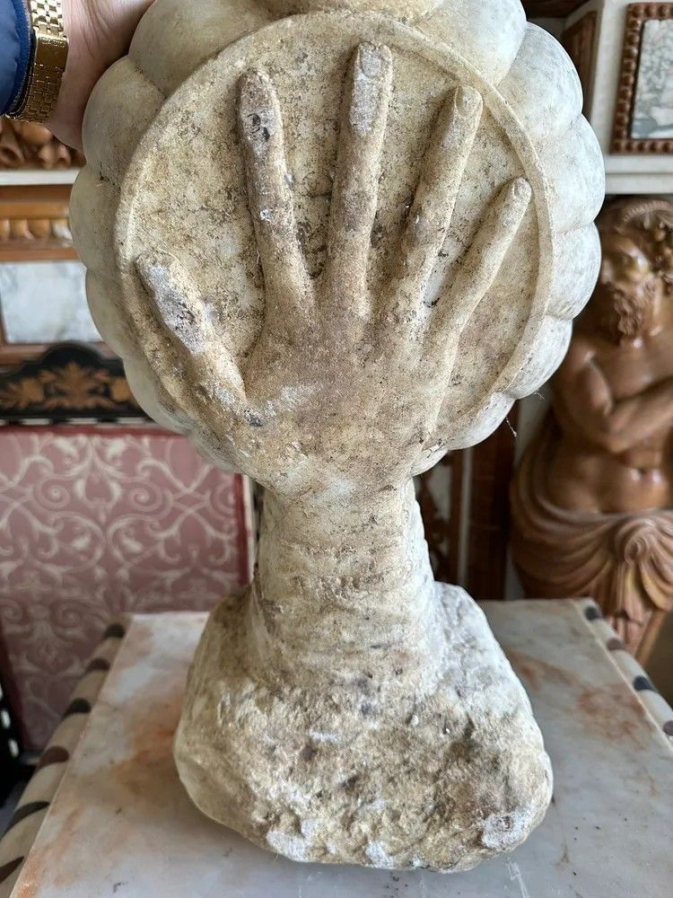 Acquasantiera barocca in marmo con mano scolpita – XVII secolo