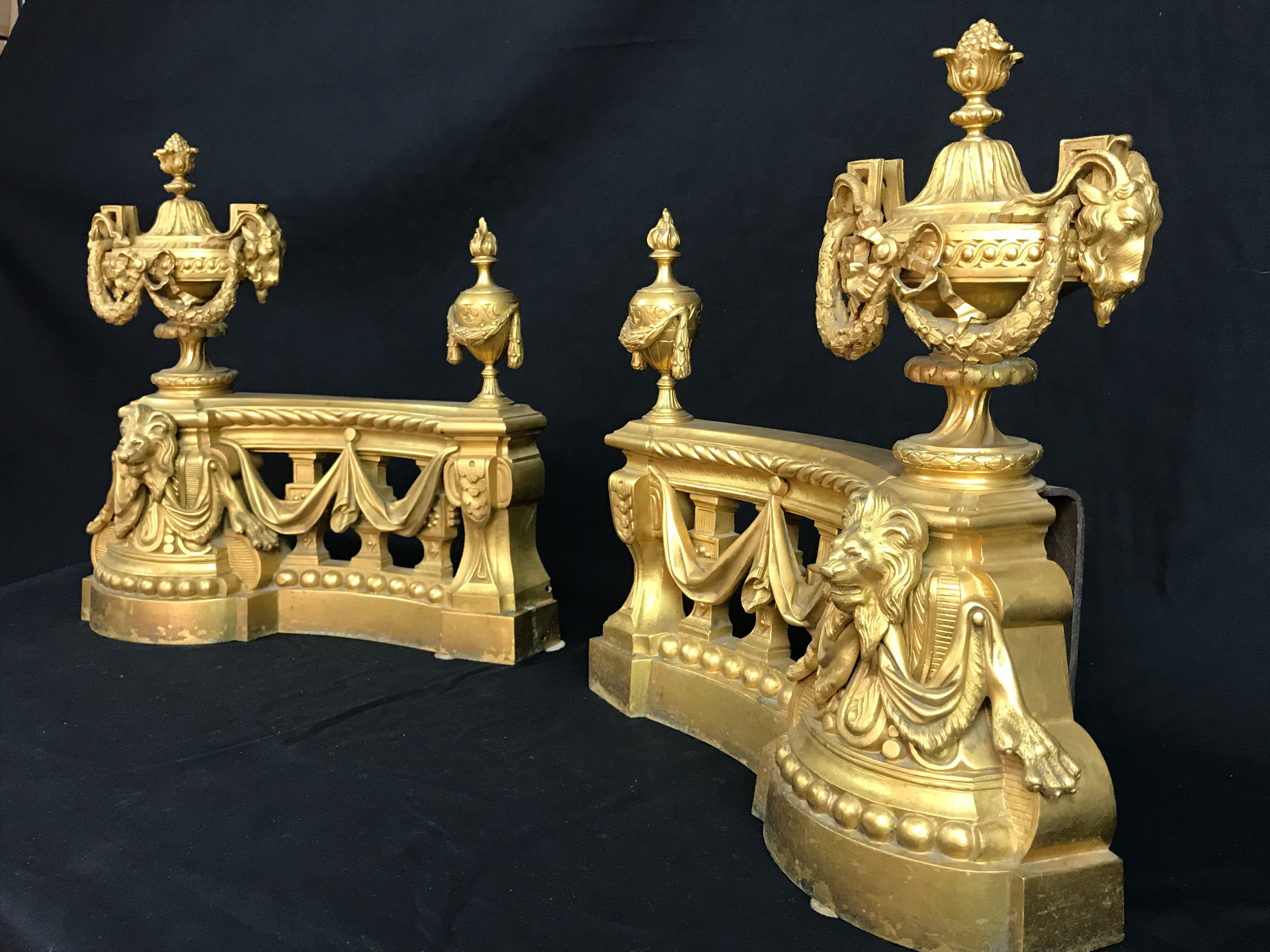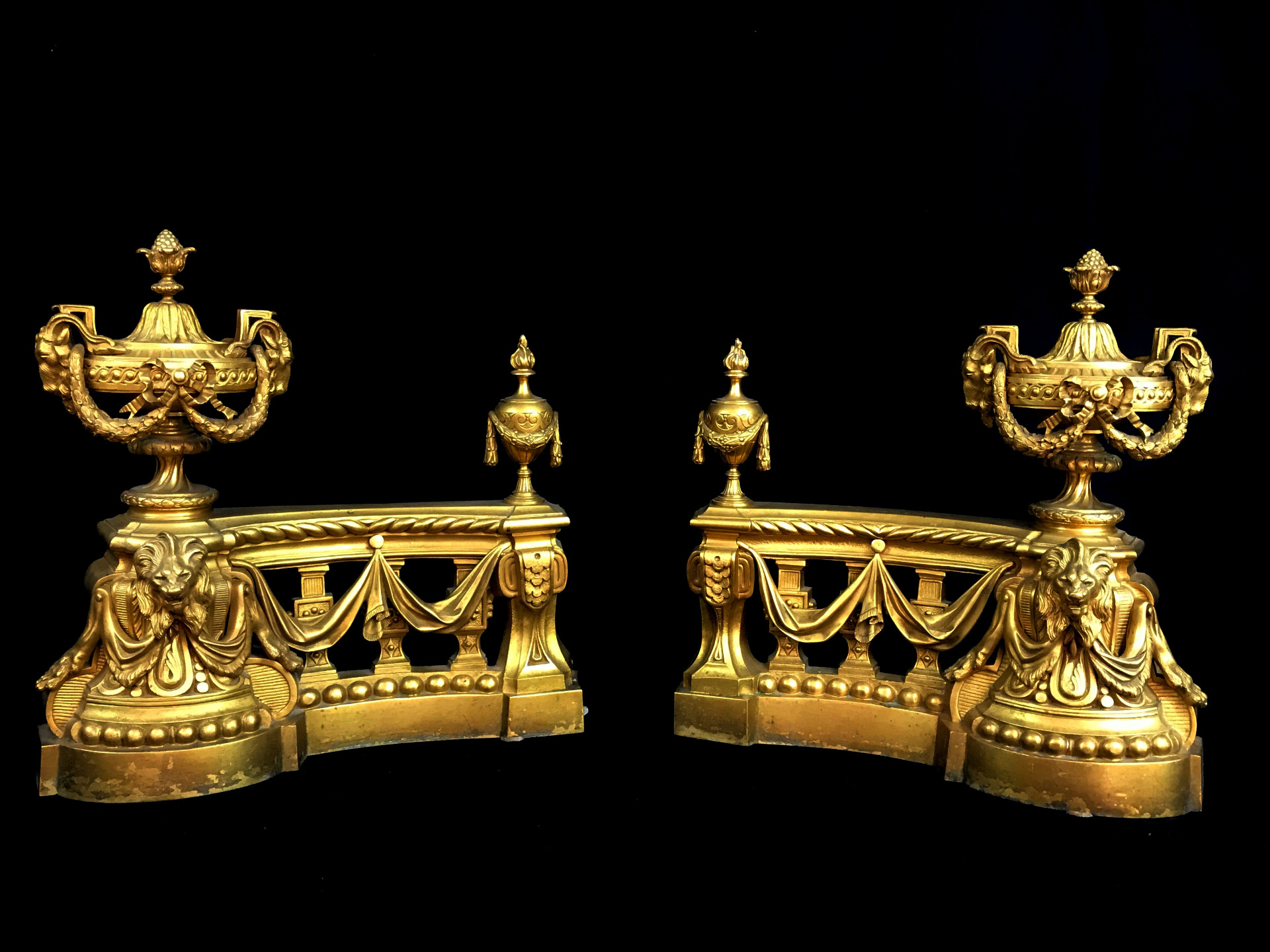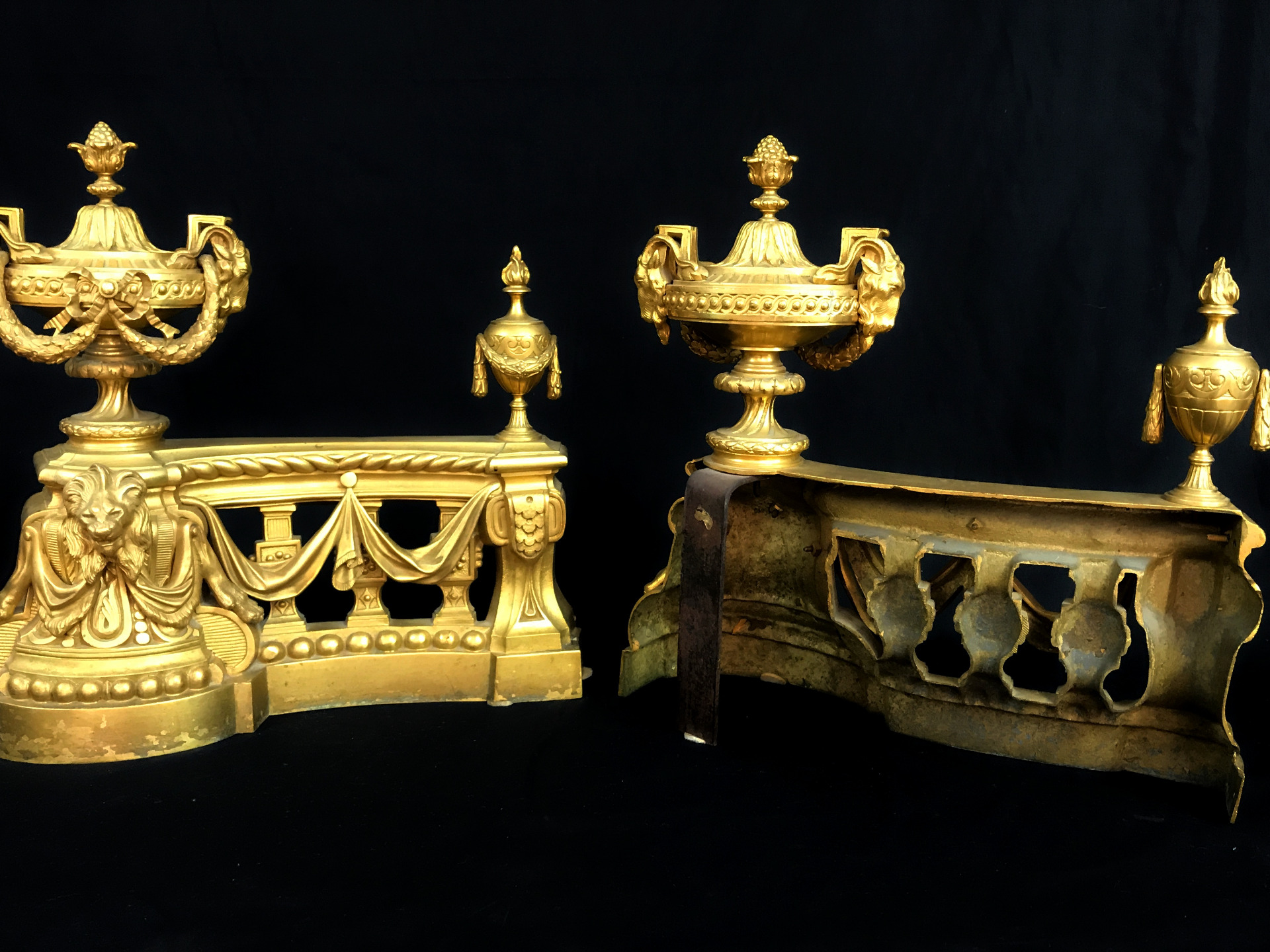 Coppia di alari da camino in bronzo dorato, Francia fine XVIII secolo
