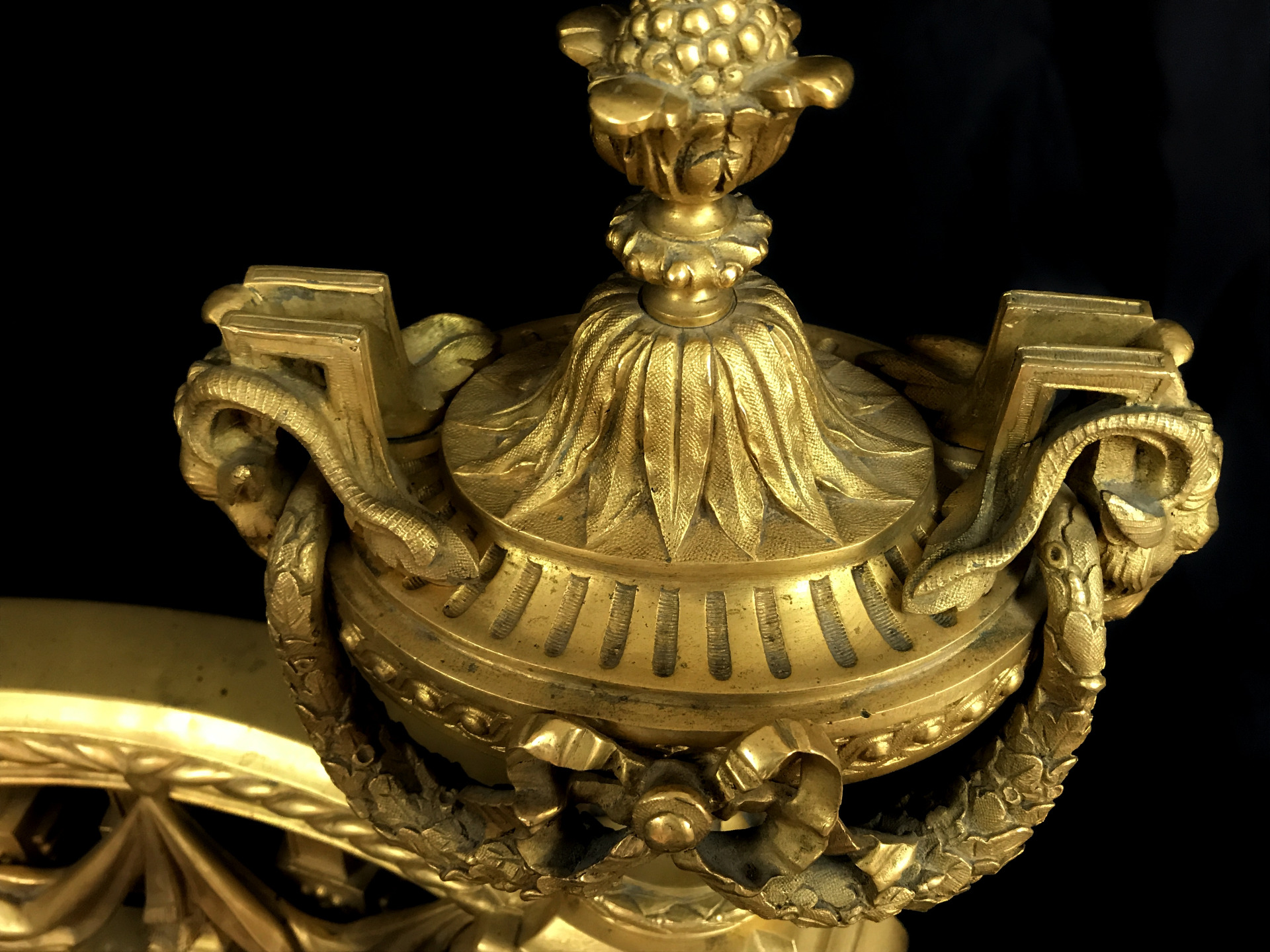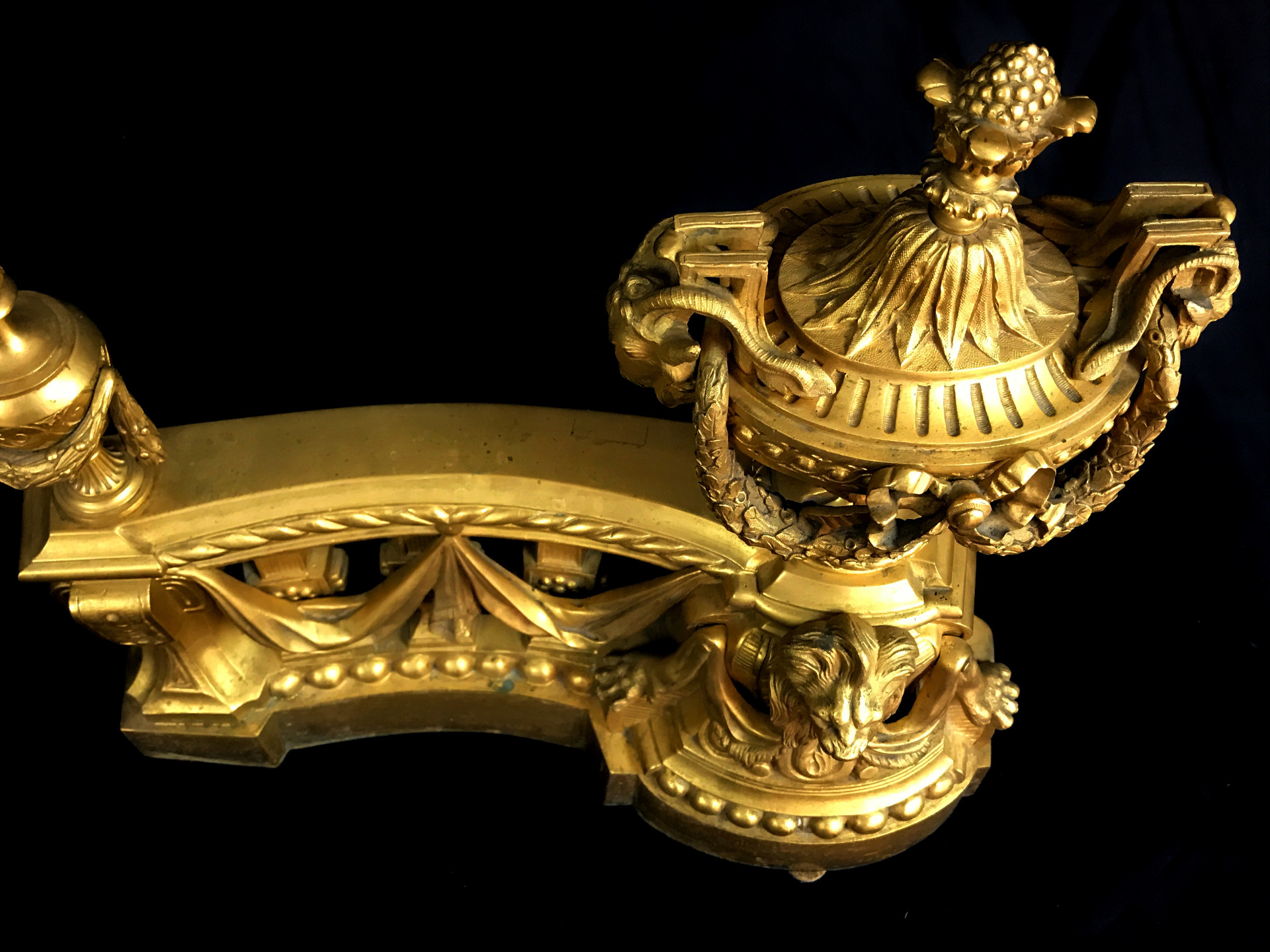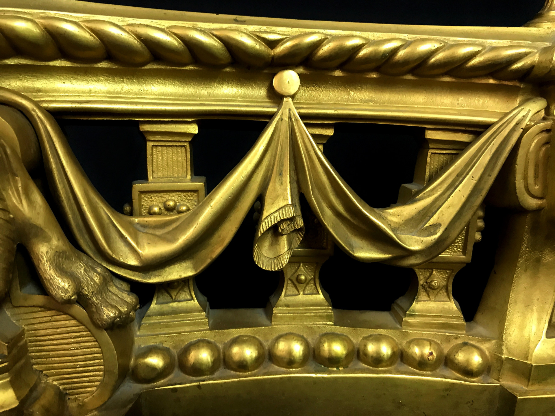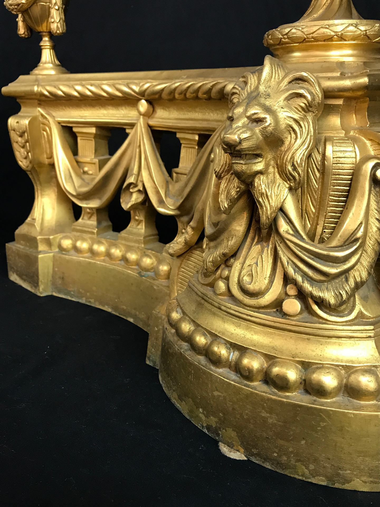 Coppia di alari da camino in bronzo dorato, Francia fine XVIII secolo