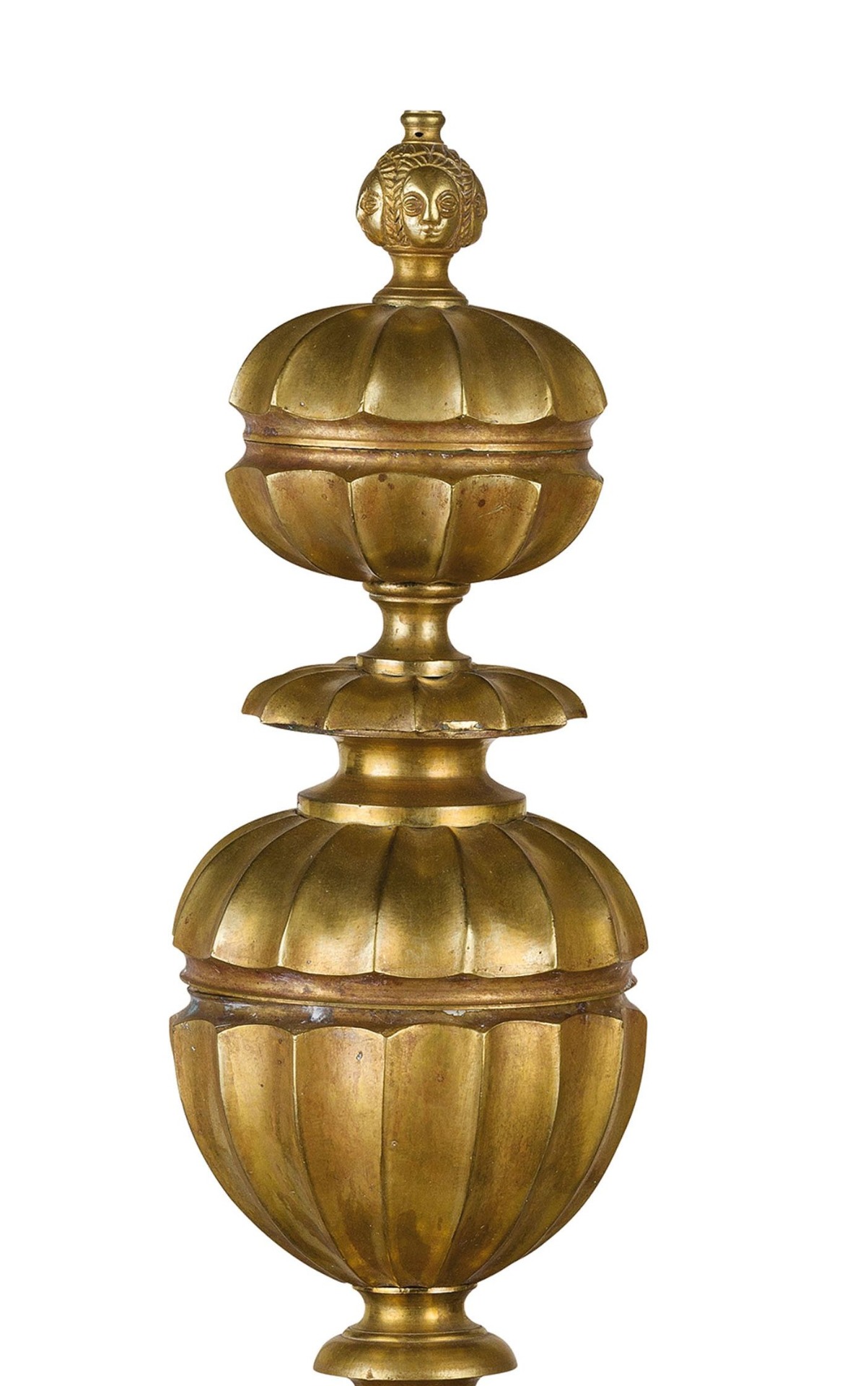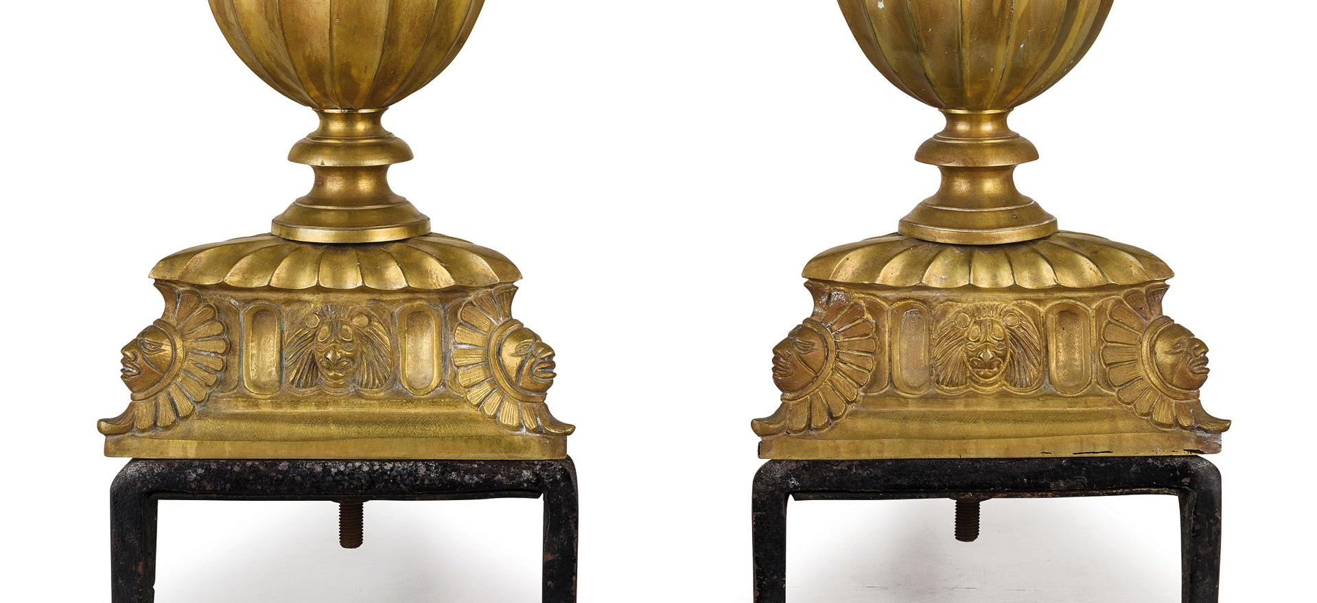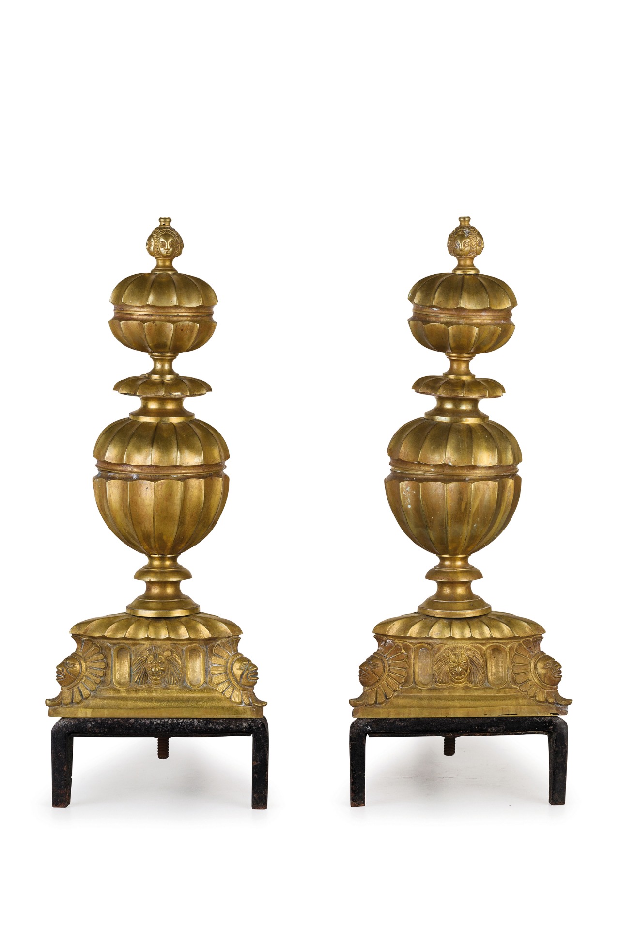 Coppia di alari in bronzo cesellato e dorato, Francia XIX secolo