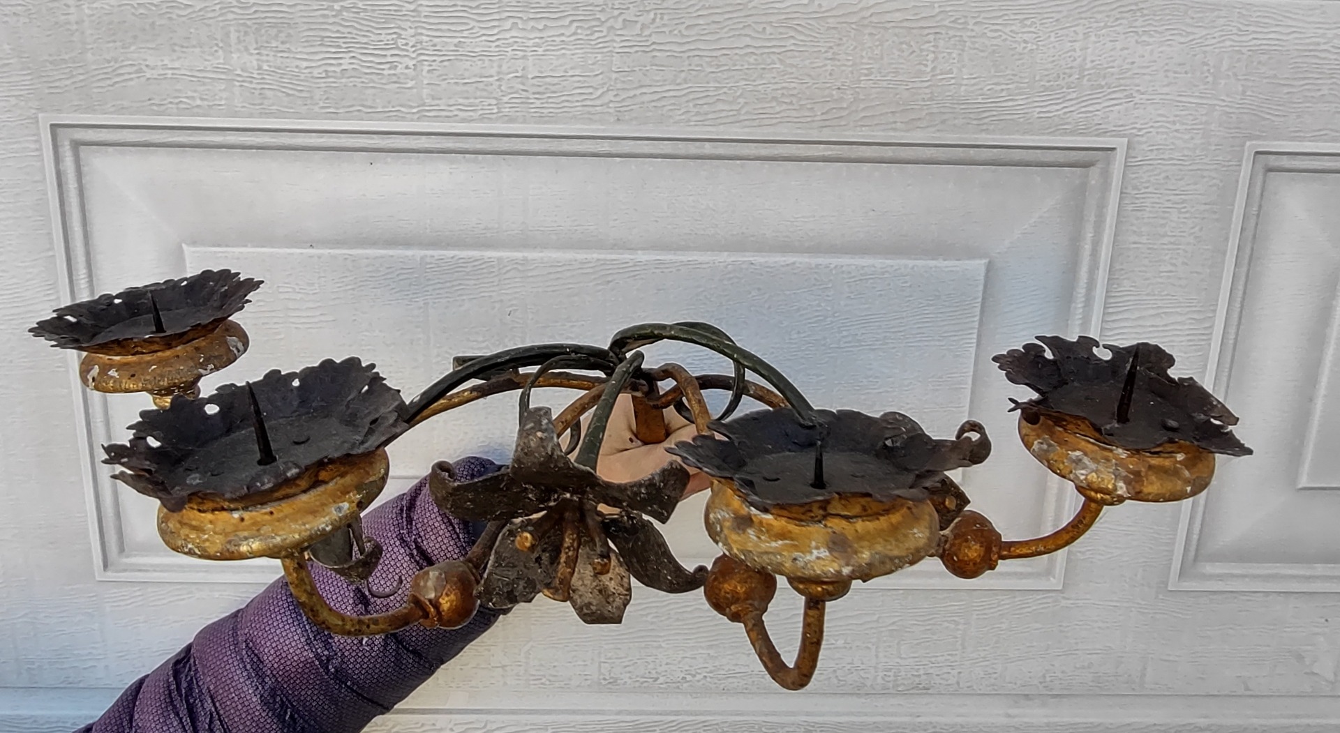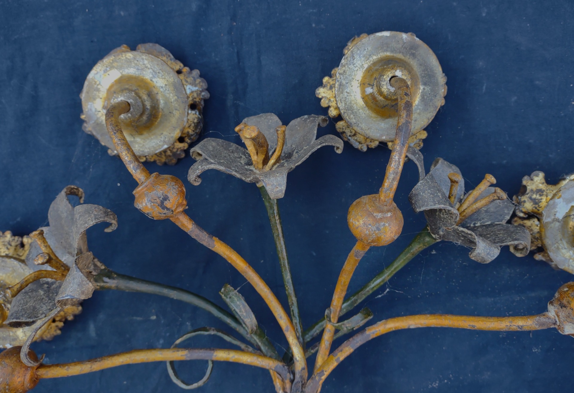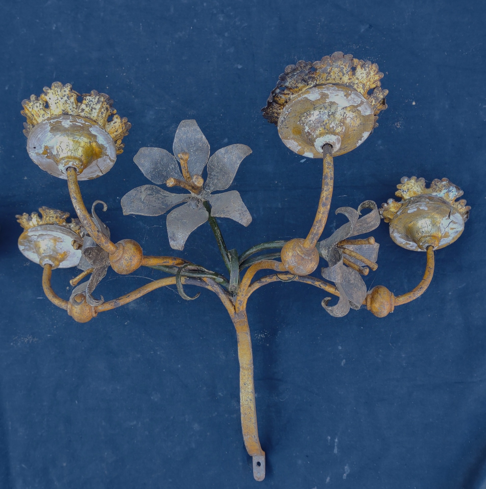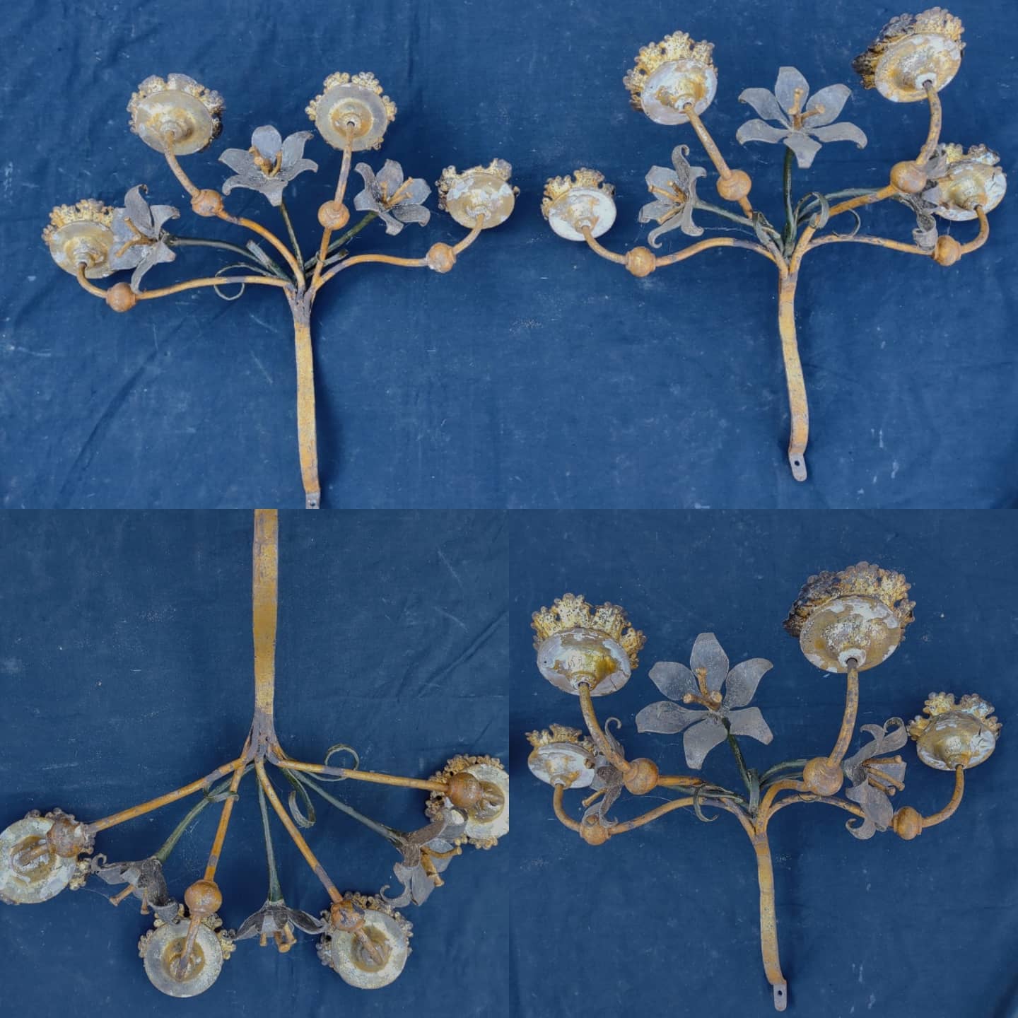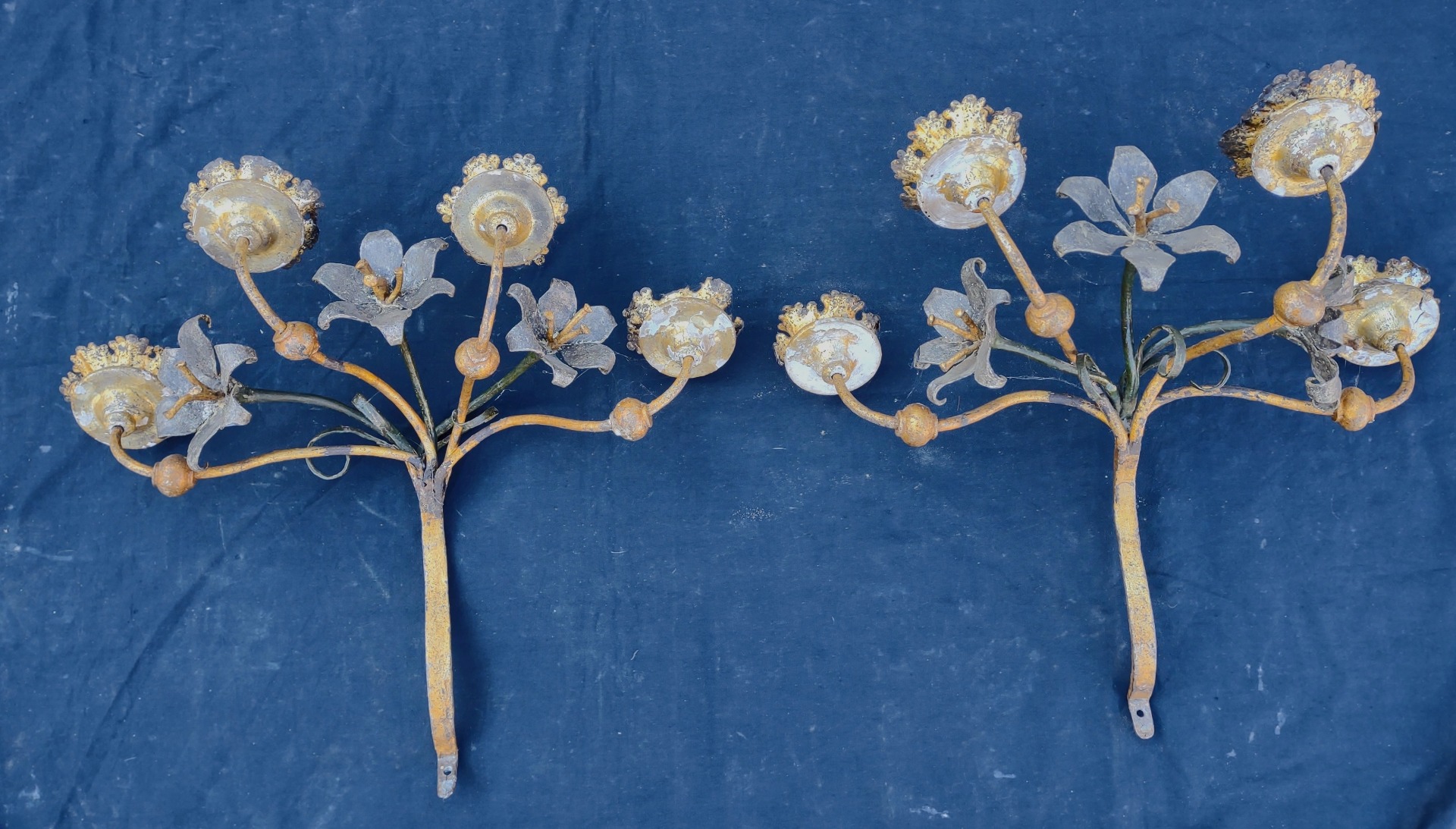 Coppia di applique veneziane in ferro forgiato e legno dipinto.Piccole mancanze nelle parti in lamiera e di parte della pittura.