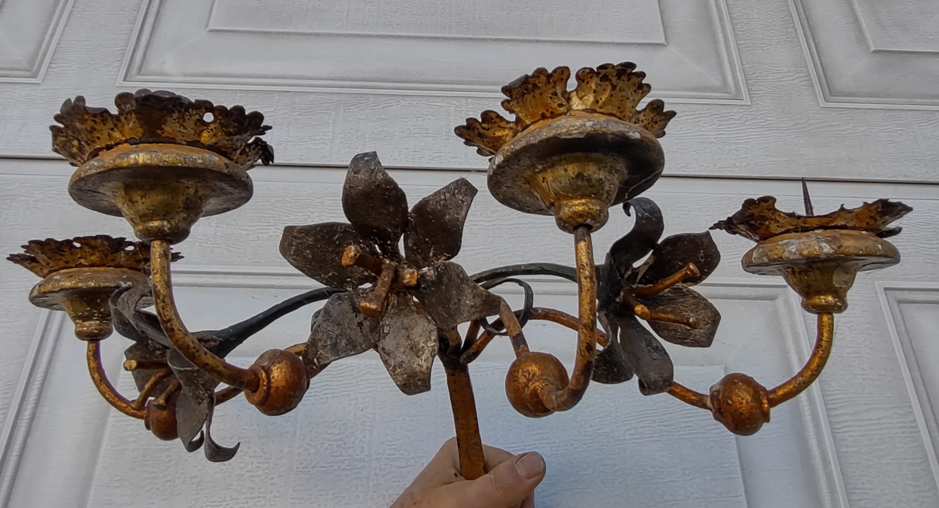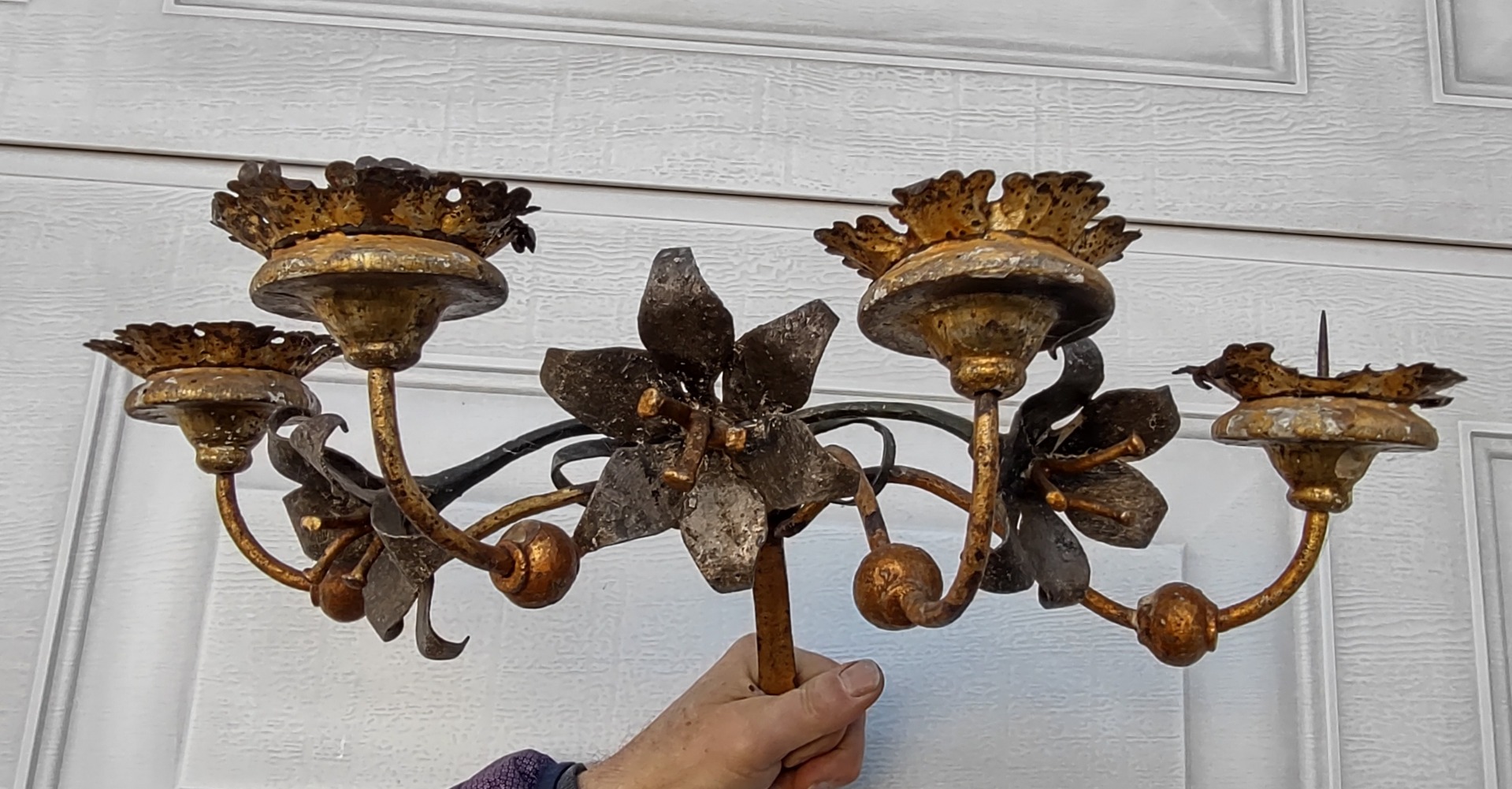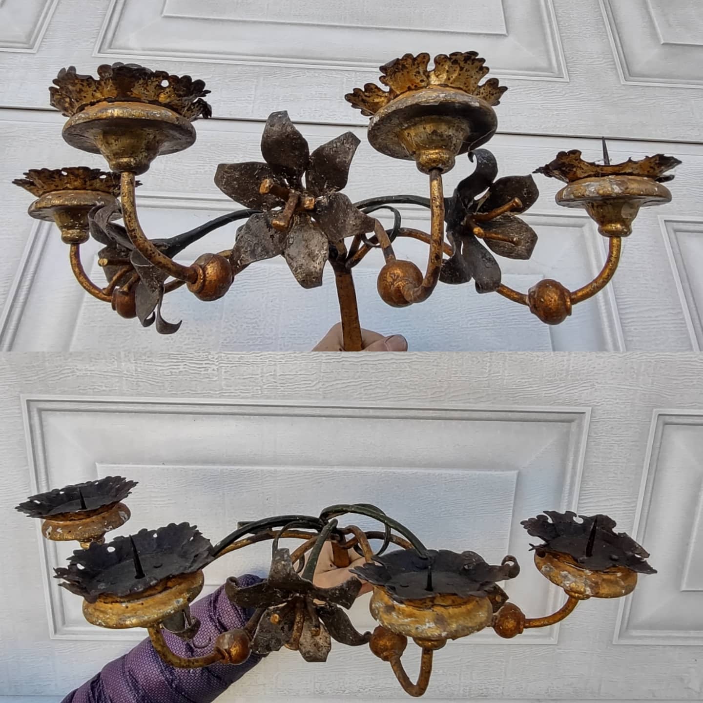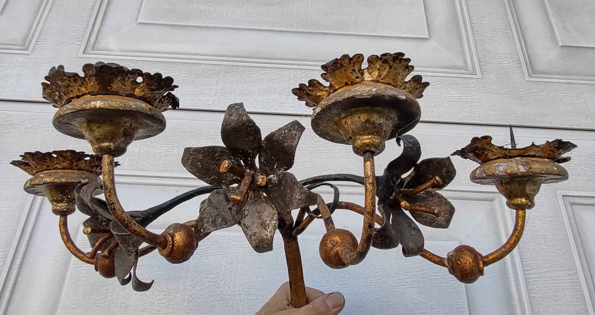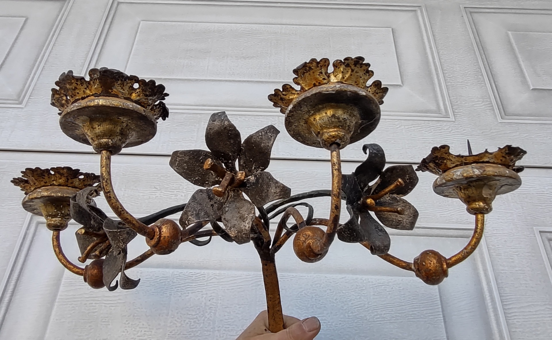 Coppia di applique veneziane in ferro forgiato e legno dipinto.Piccole mancanze nelle parti in lamiera e di parte della pittura.