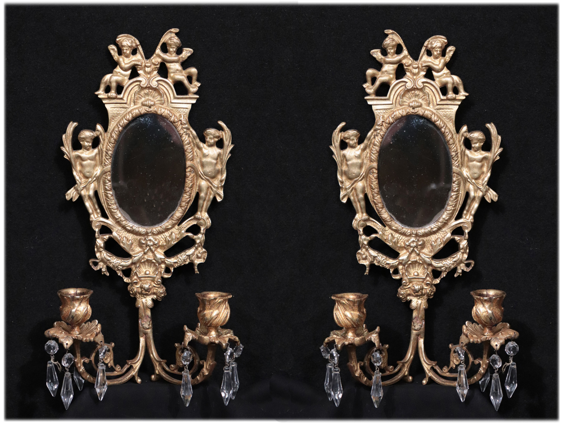 Elegante e raffinata coppia di piccole appliques in bronzo dorato, con specchio centrale.
