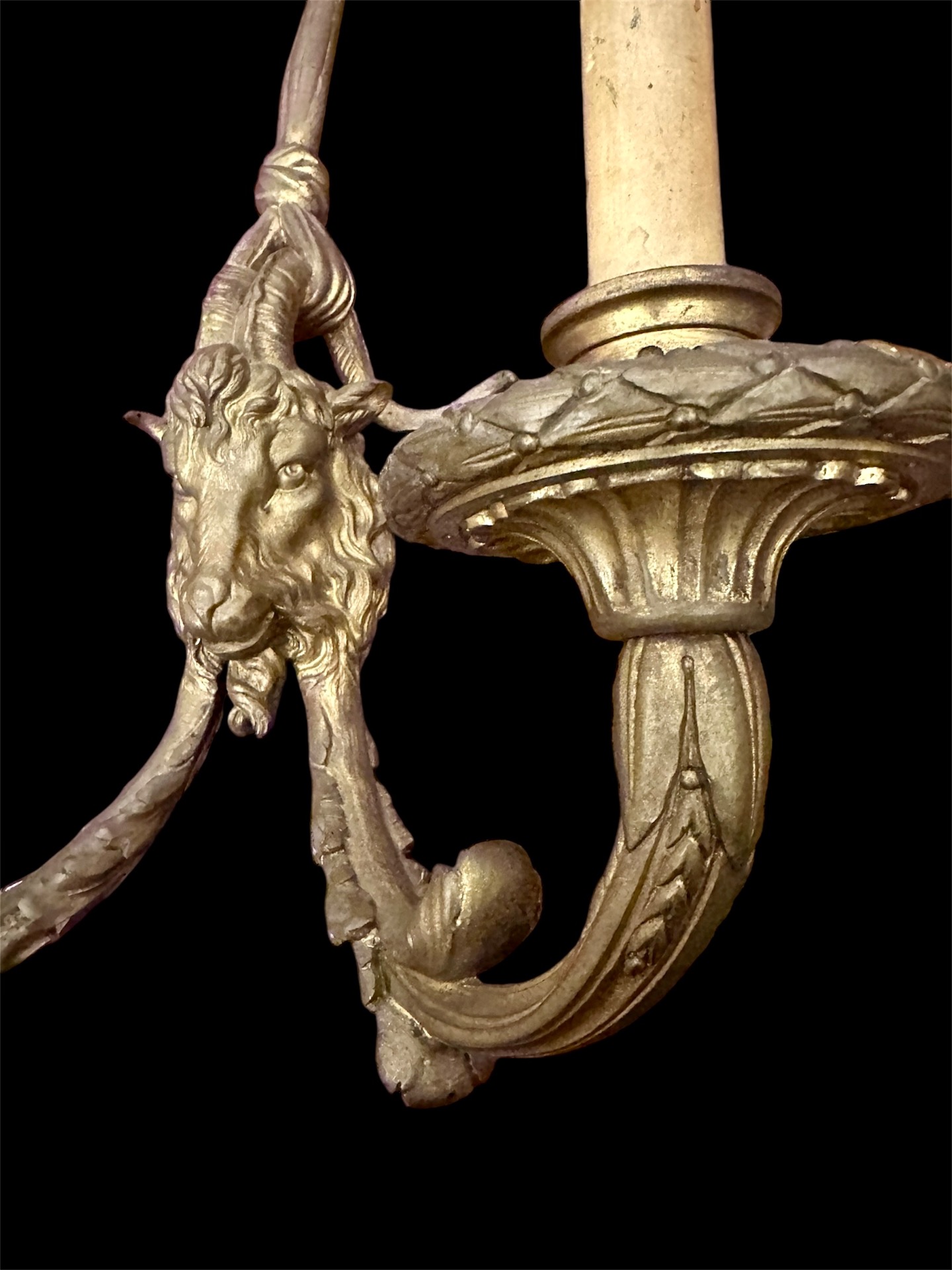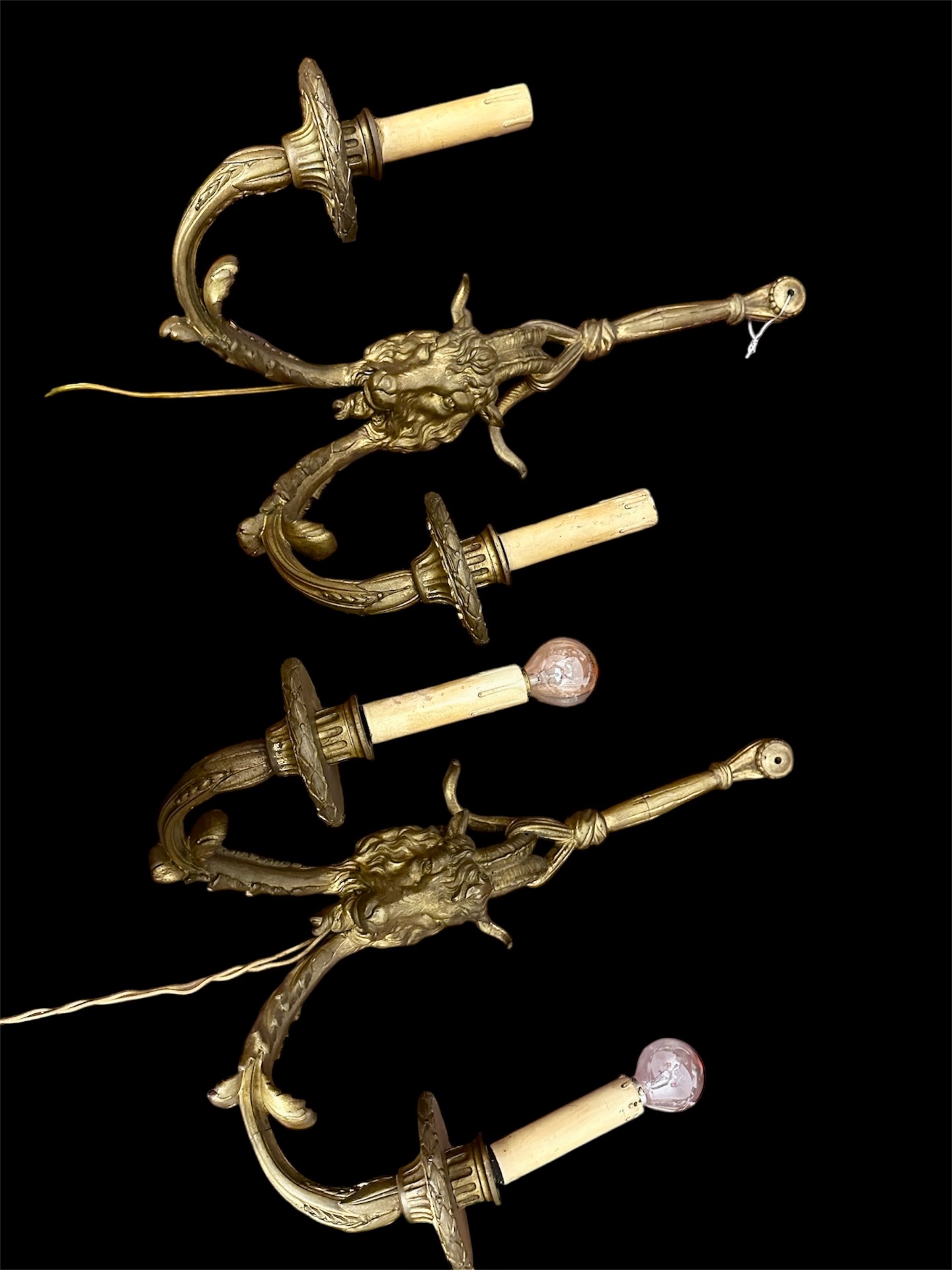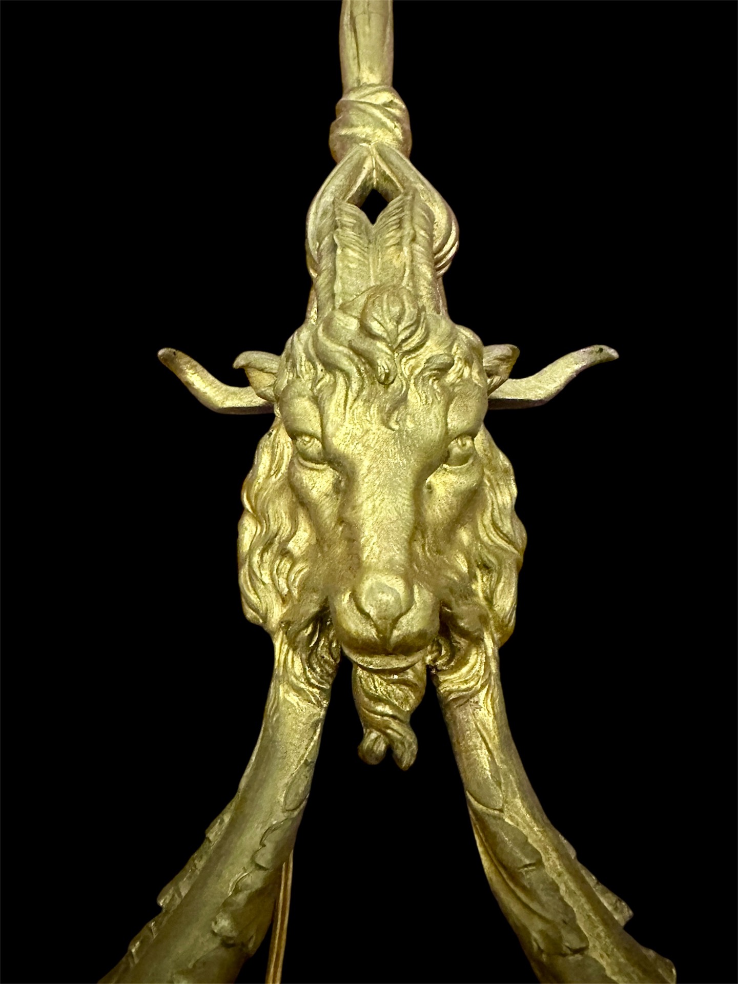 Coppia di appliqués in bronzo dorato con teste di caprone di stile Luigi XV prima metà 800 Francia misure lunghe 55 cm